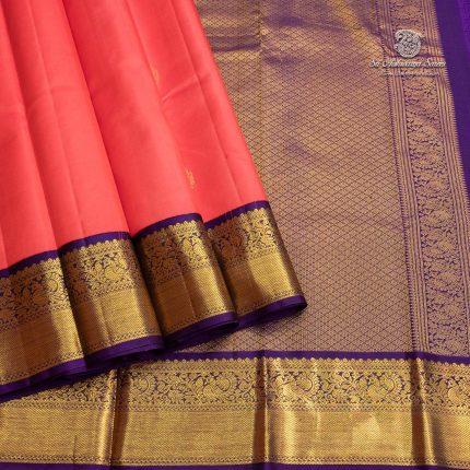 A graceful pure silk saree in a soft mandy-toned body, adorned with elegant peacock motifs woven across the body. The rich dark violet blouse and pallu add a striking contrast, completing the look with regal charm.