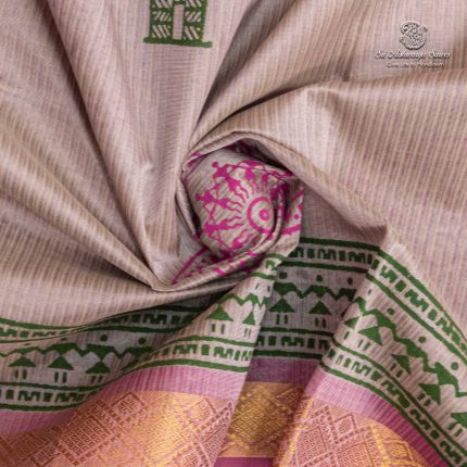 Pure silk cotton printed saree with a light pinkish beige body and thulian pink pallu, adorned with elegant motifs in hand block print, creating a refined and graceful appeal.