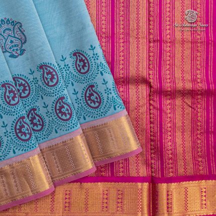 Pure silk cotton printed saree with a light blue body and rani pink pallu, adorned with elegant motifs in hand block print, creating a refined and graceful appeal.