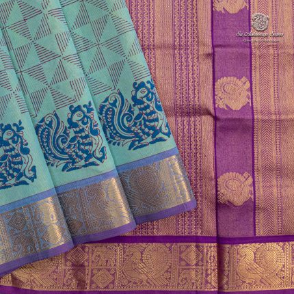 Pure silk cotton printed saree with a seafoam blue body and purple pallu, adorned with elegant motifs in hand block print, creating a refined and graceful appeal.