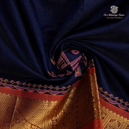 Pure silk cotton printed saree with a dark navy blue body and pinkish orange pallu, adorned with elegant motifs in hand block print, creating a refined and graceful appeal.
