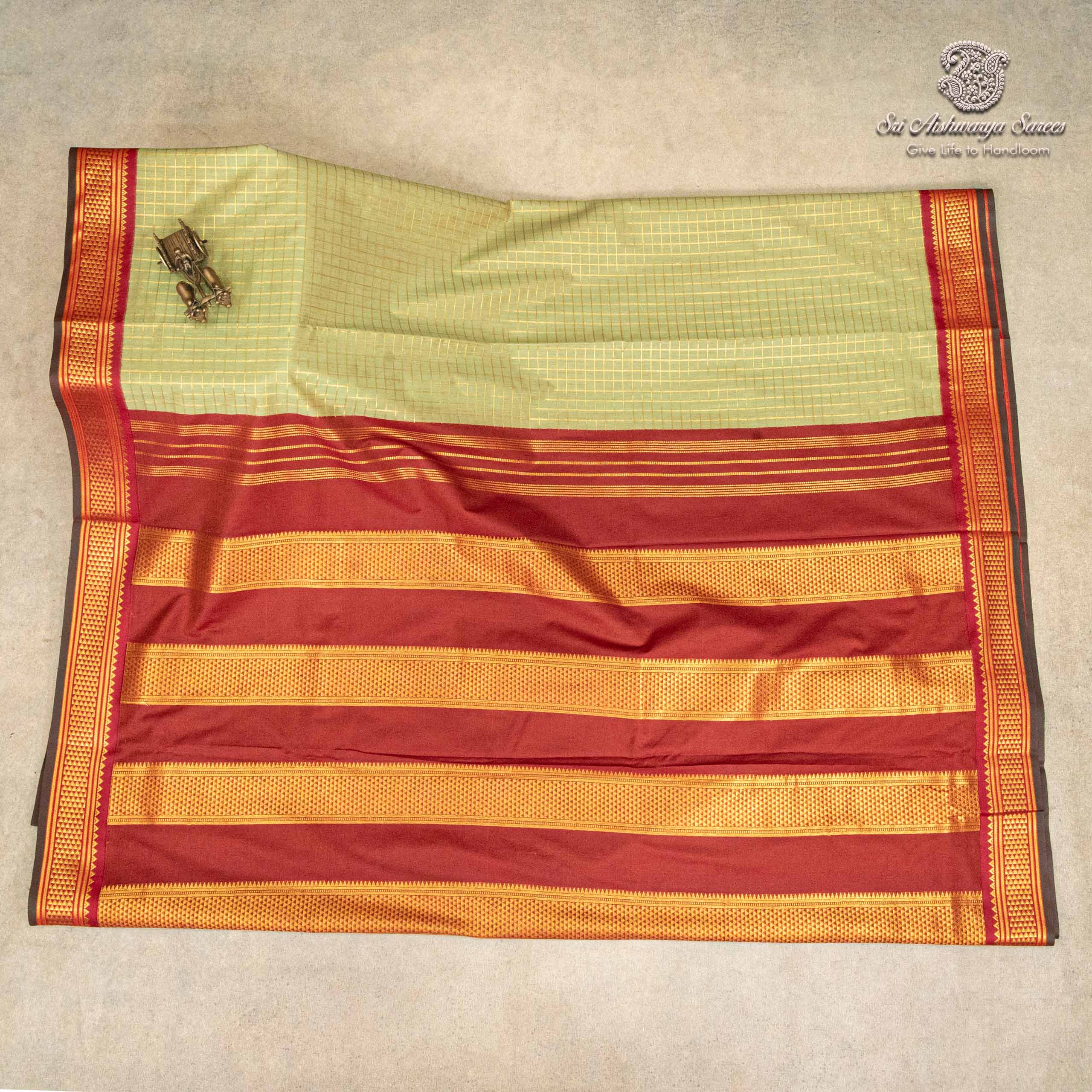• 10 Yards Kalyani Cotton Saree in pista green with all over body checks. A graceful pick for those attending traditional weddings or family gatherings.