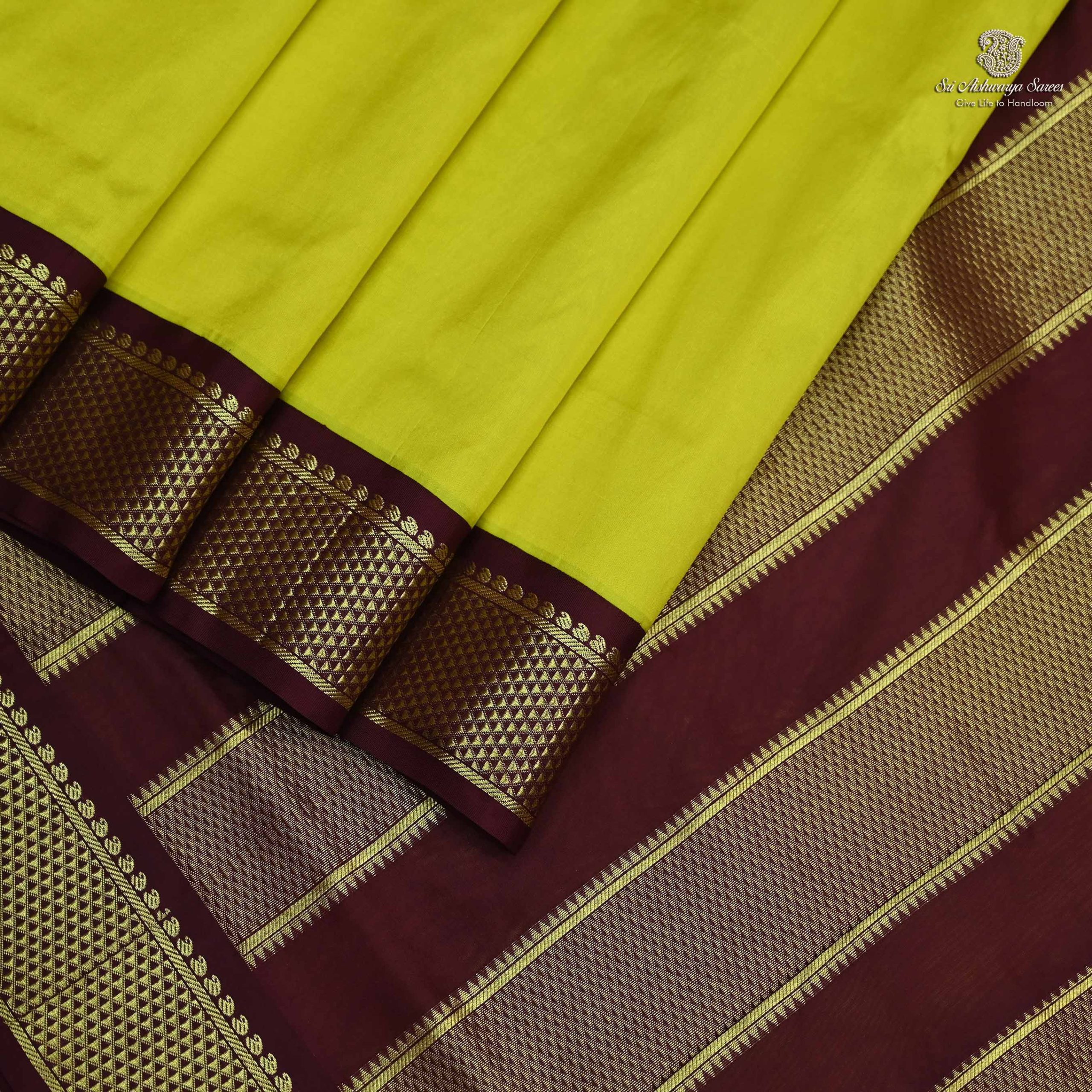 10 yards pure silk in Chartreuse Green shines with korvai golden zari . The bold contrast and intricate weaving bring out timeless South Indian heritage. Ideal for women who prefer classic elegance during traditional occasions and festive gatherings.