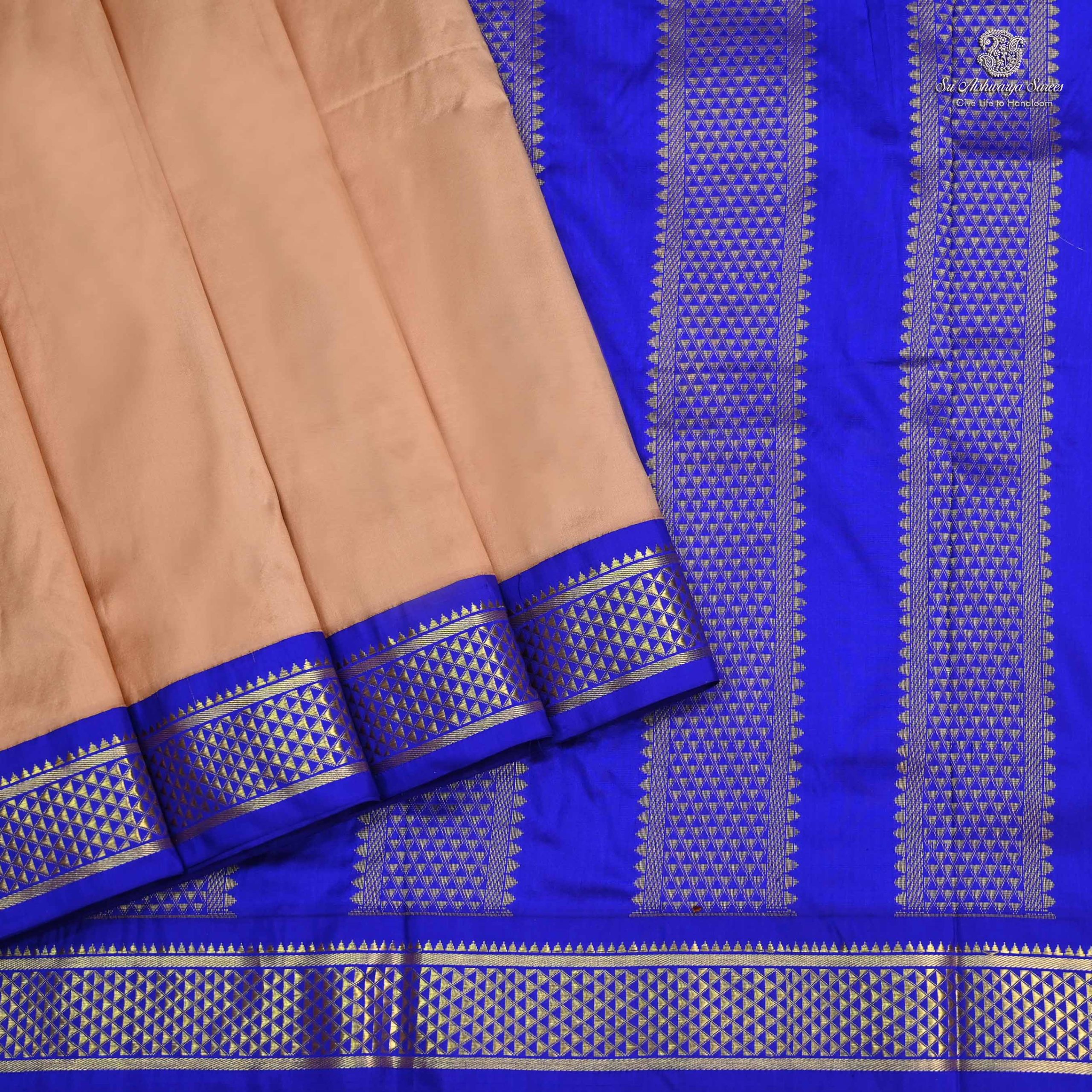 10 yards pure silk in Creamy Peach shines with Navy blue Korvai border . The bold contrast and intricate weaving bring out timeless South Indian heritage. Ideal for women who prefer classic elegance during traditional occasions and festive gatherings.