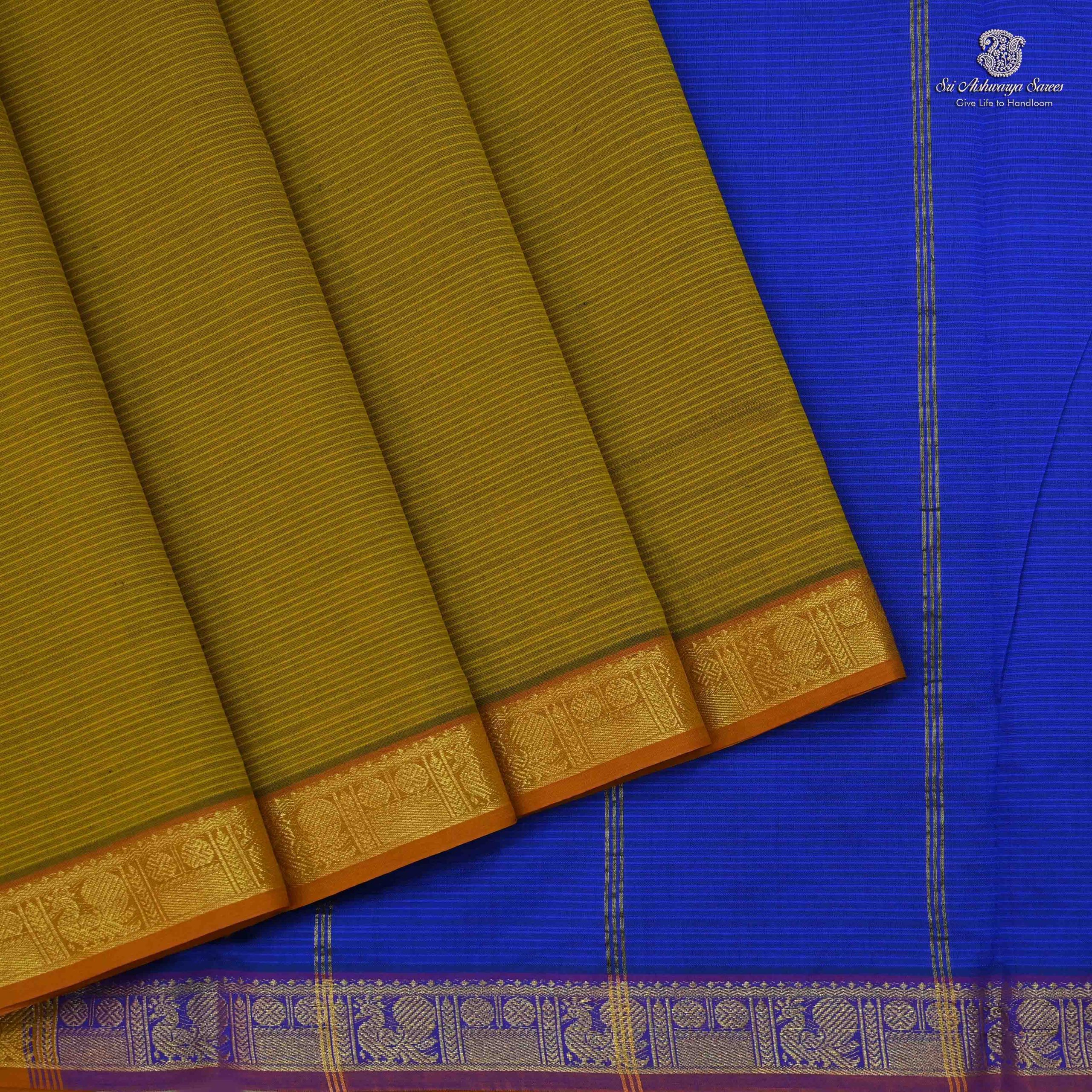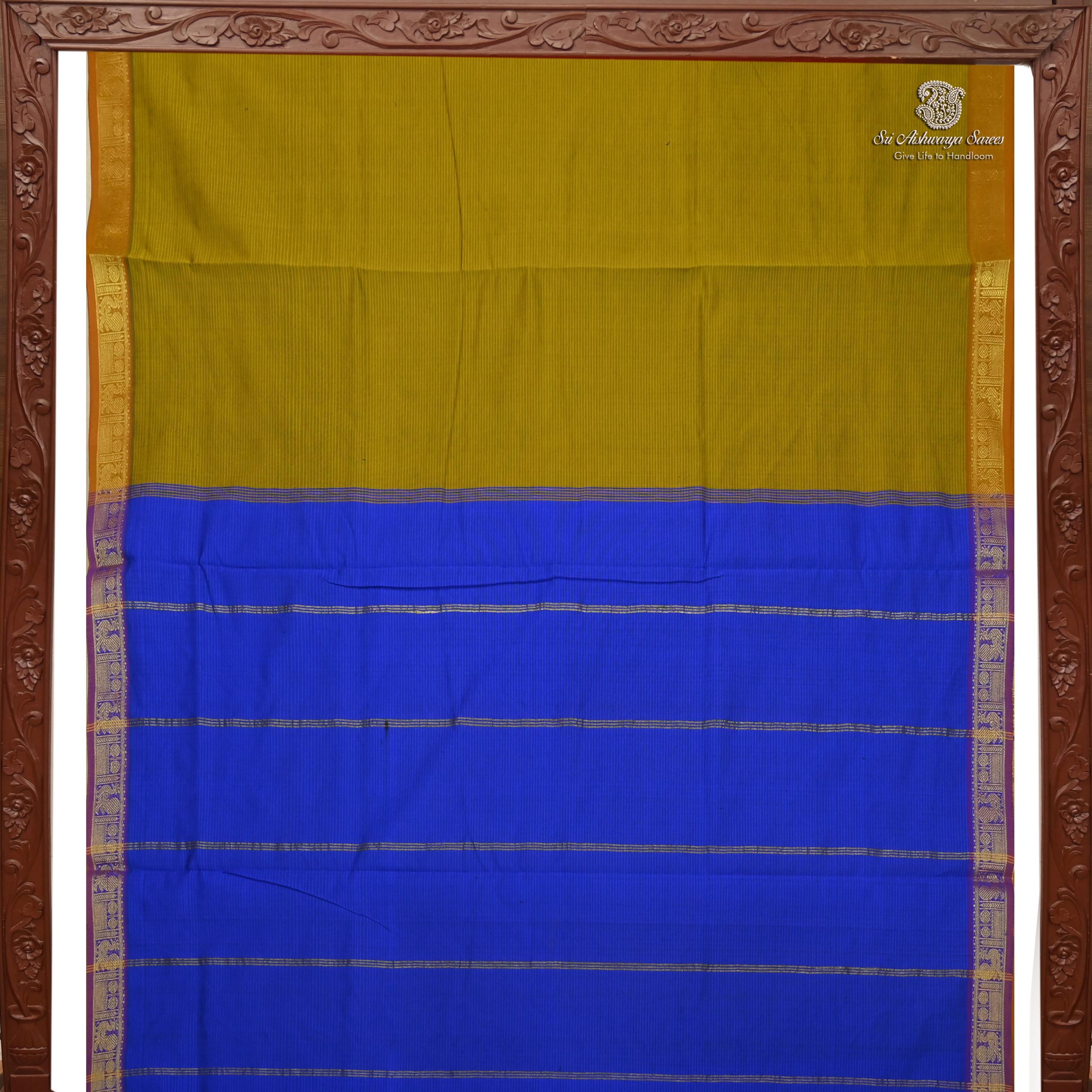 A beautiful 10-yard Madisar saree crafted in semi silk cotton, featuring a rich mehandi green body contrasted with a lively royal blue pallu.