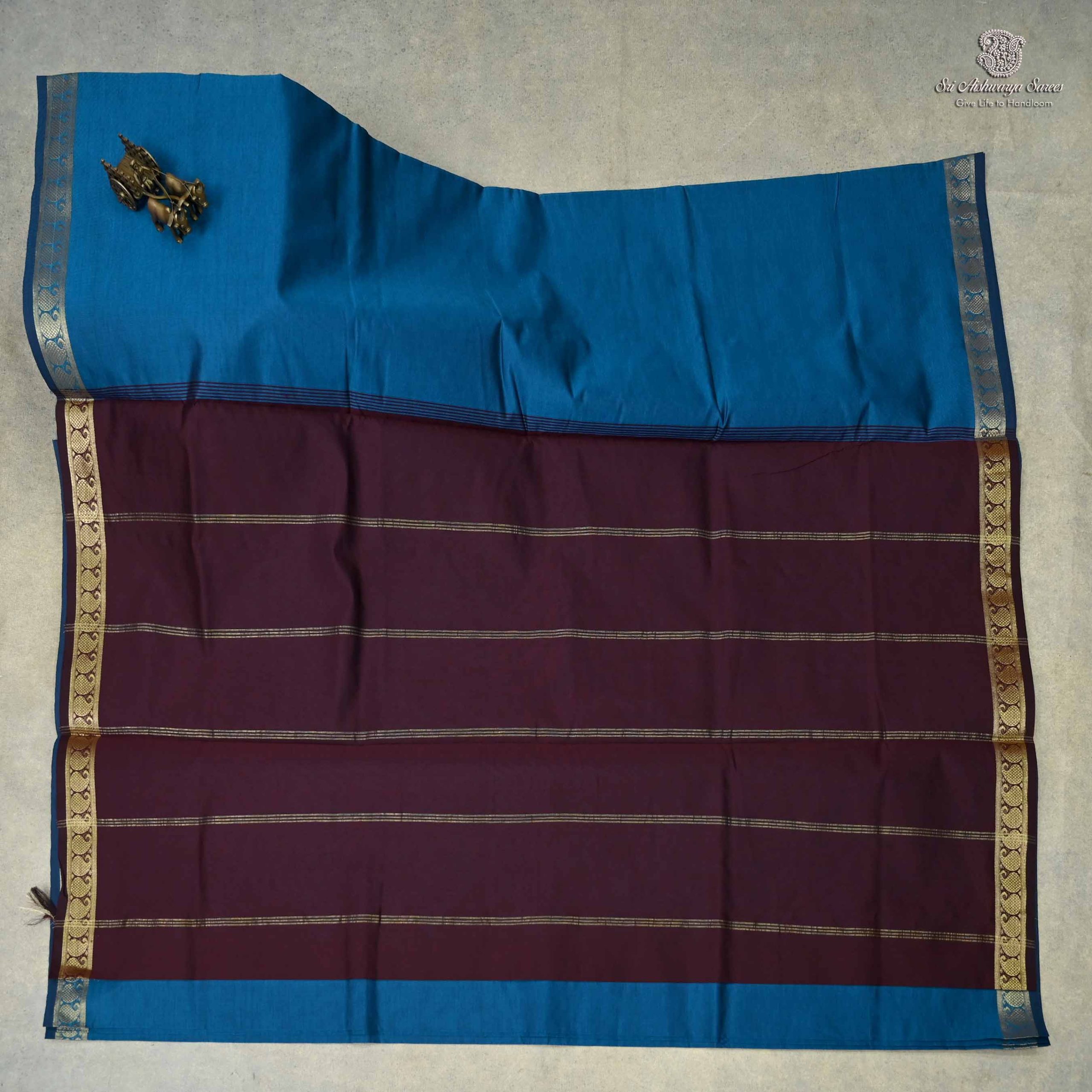 Elegant 10-yard saree in sea blue with a rich brown pallu and a classic plain border design.
