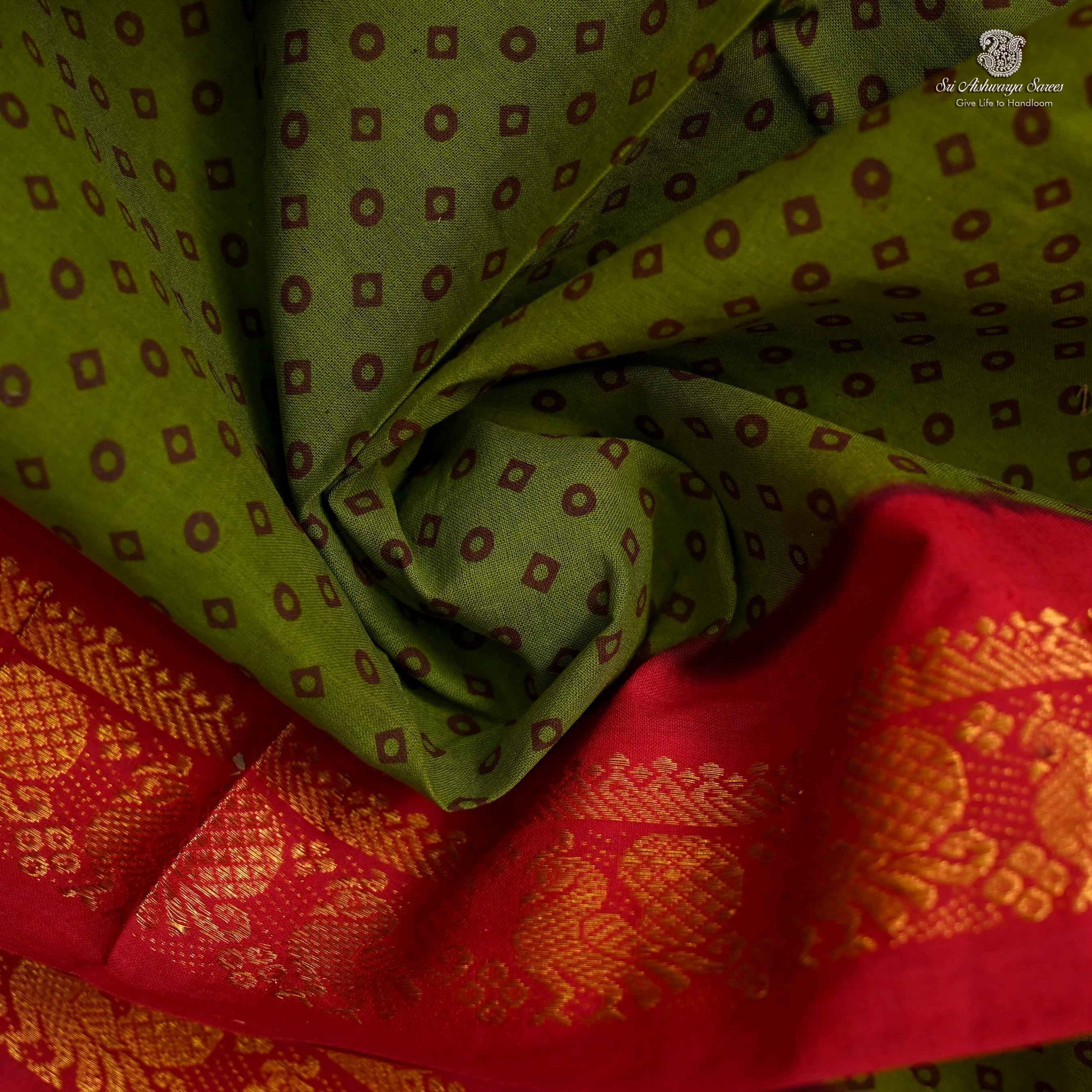 9 Yards Sungudi Cotton Sarees Olive Green colour SASTC0033476