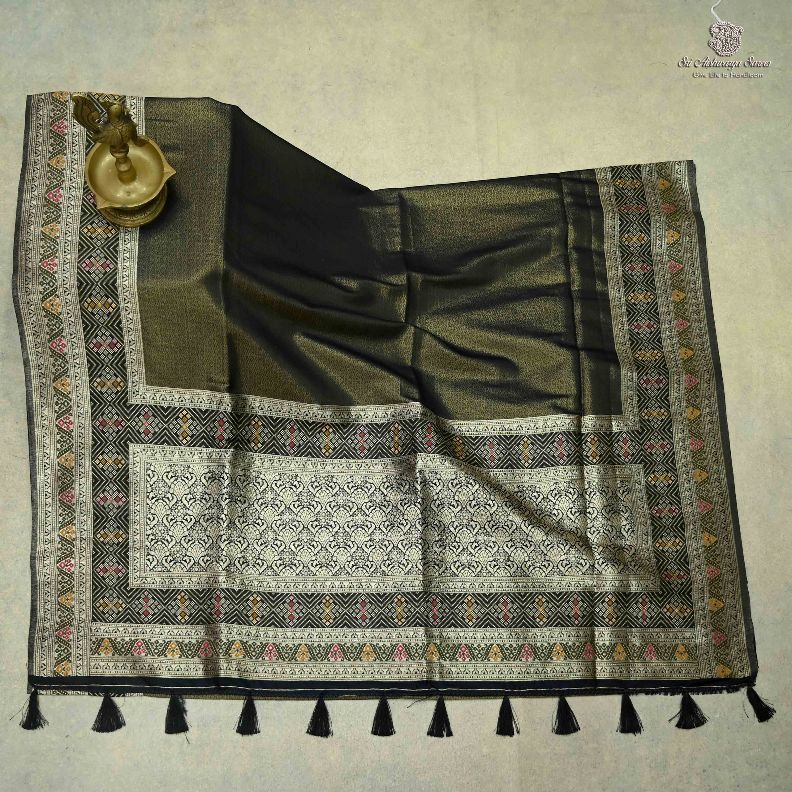 • A bottle-green fancy saree with classic designs on the body and border, paired with a matching self-design pallu and blouse. Perfect for those seeking elegant and timeless attire for any occasion.