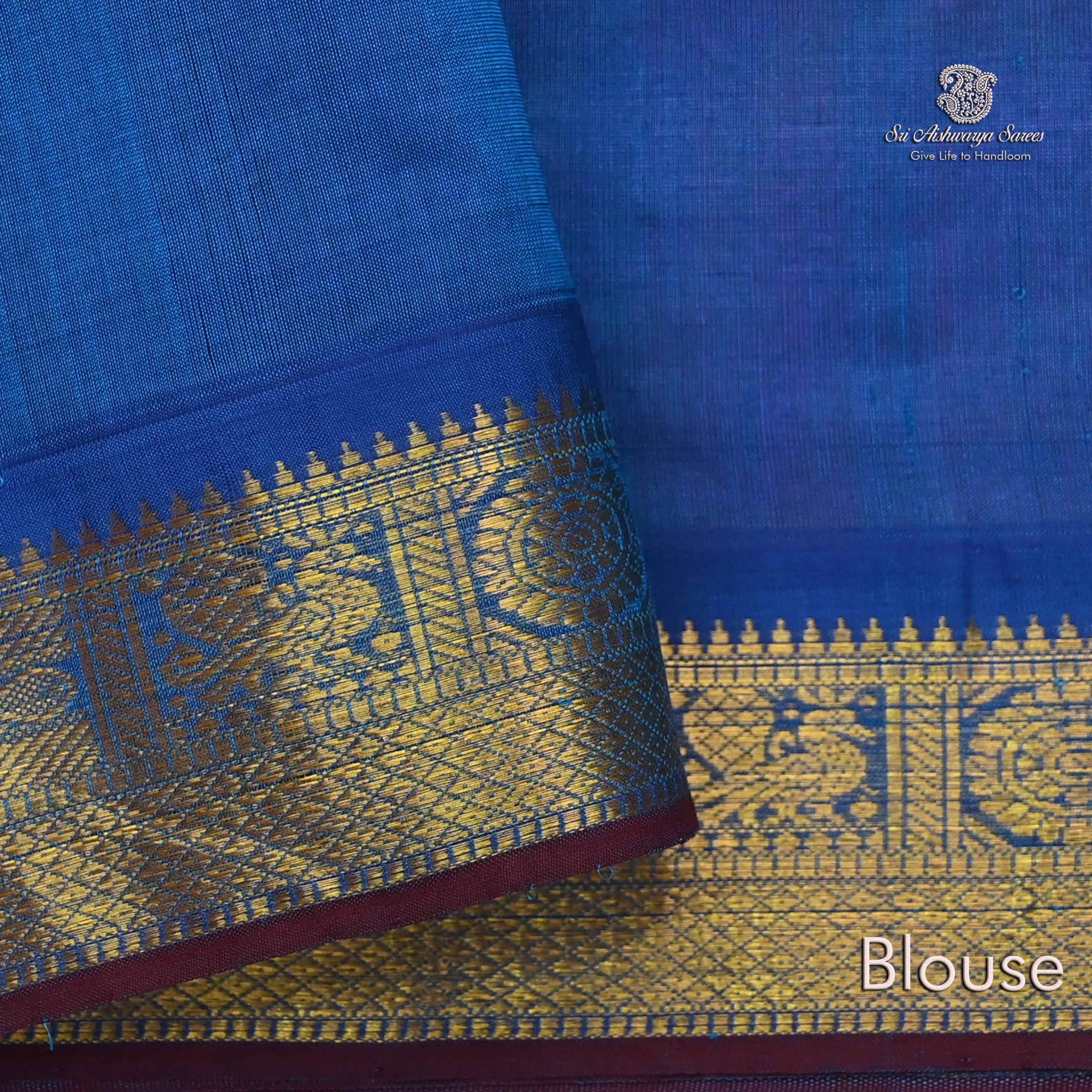 “Handloom pure silk cotton saree with a vibrant hot pink body, traditional korvai border, contrasting peacock blue rich pallu, and matching contrast blouse – an elegant and timeless weave.”