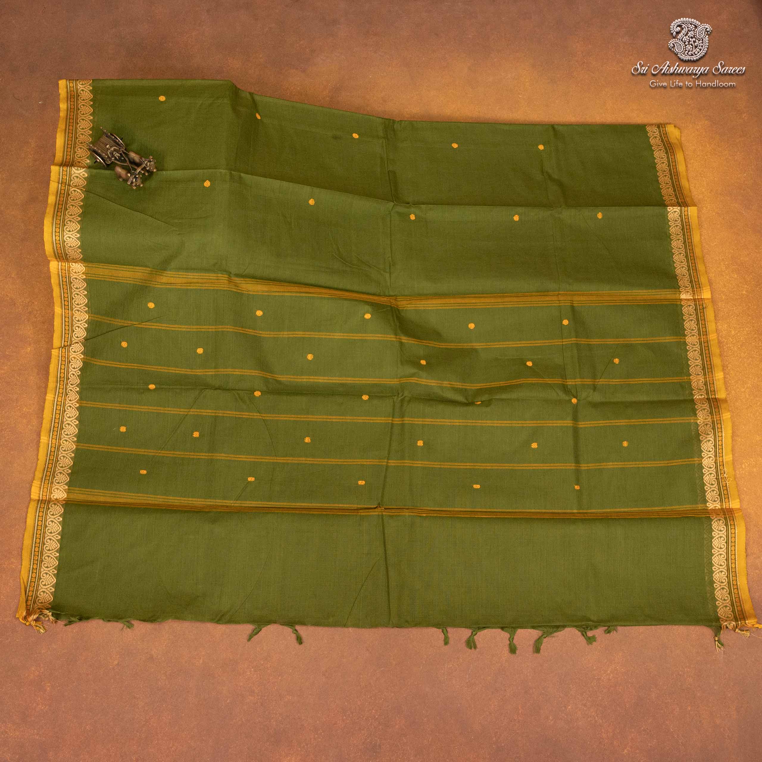A Army Green cotton saree drapes with effortless grace, offering breathable comfort and a soft, natural texture against the skin. Its subtle weave and earthy elegance make it perfect for both everyday charm and special gatherings.