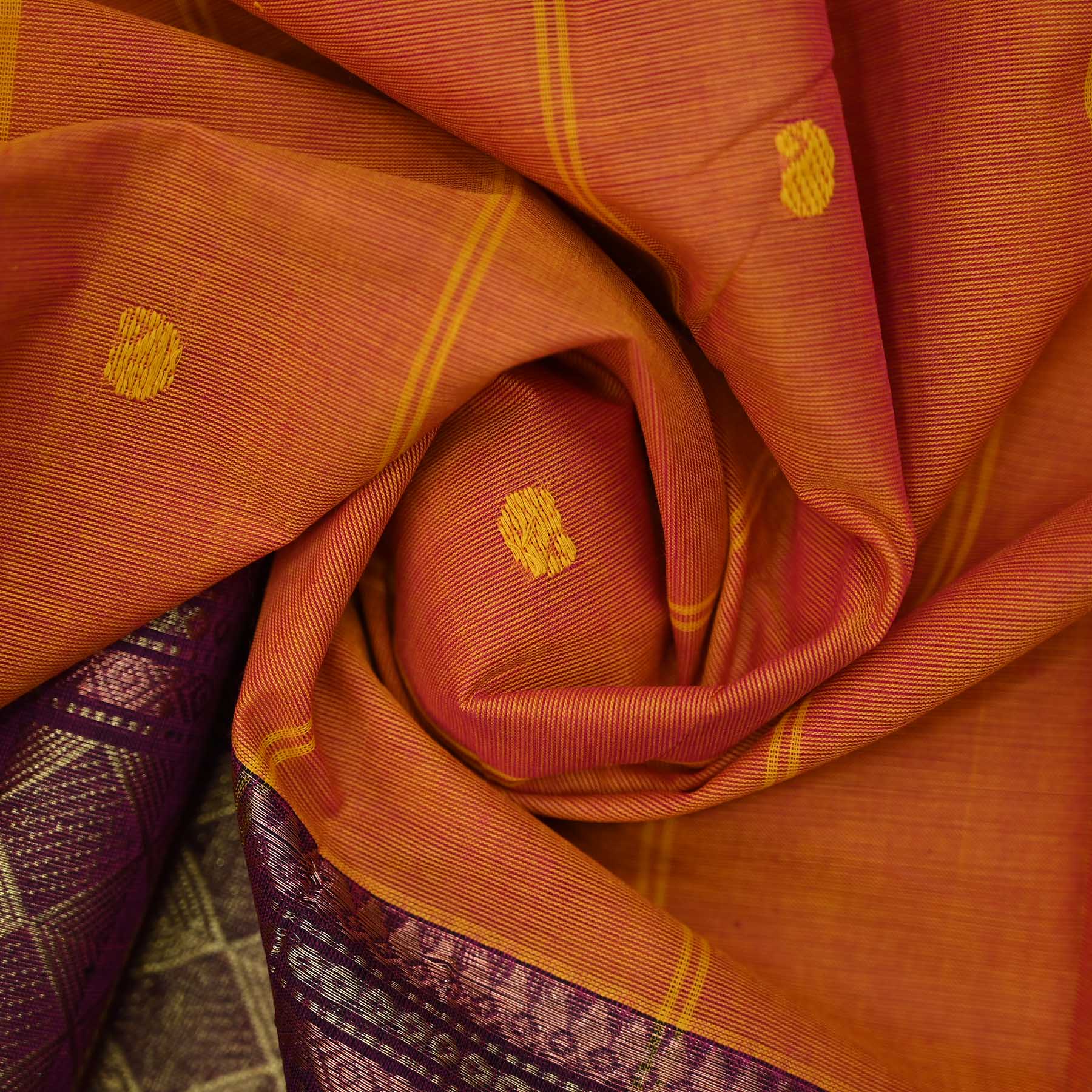 “Bright Orange Color fine cotton saree with a traditional border design and delicate small motifs woven all over the body — a graceful blend of heritage and everyday charm.”