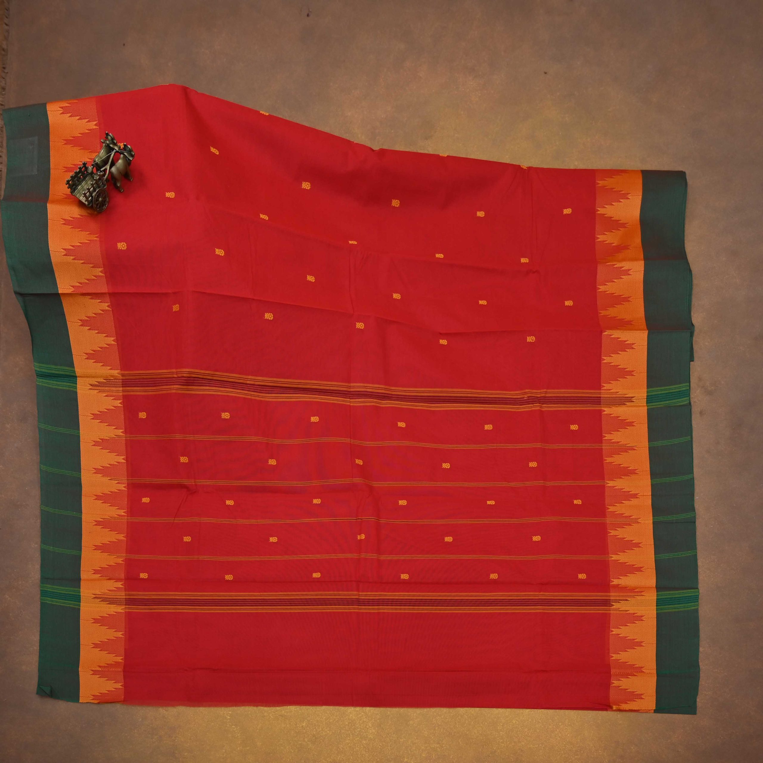 “Bright Red Color fine cotton saree with a traditional border design and delicate small motifs woven all over the body — a graceful blend of heritage and everyday charm.”