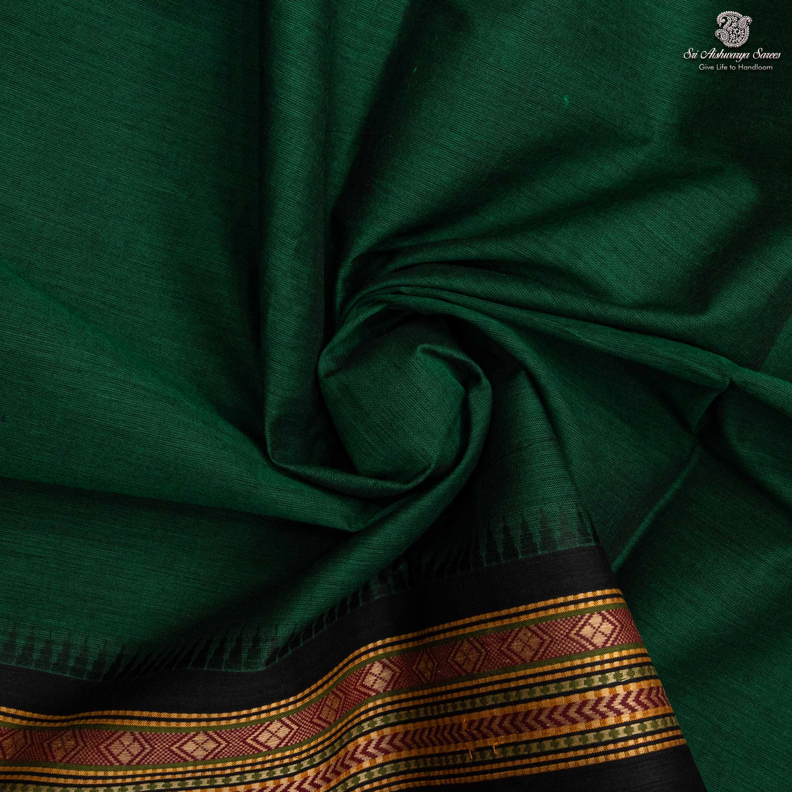 A Dark Green cotton saree drapes with effortless grace, offering breathable comfort and a soft, natural texture against the skin. Its subtle weave and earthy elegance make it perfect for both everyday charm and special gatherings.