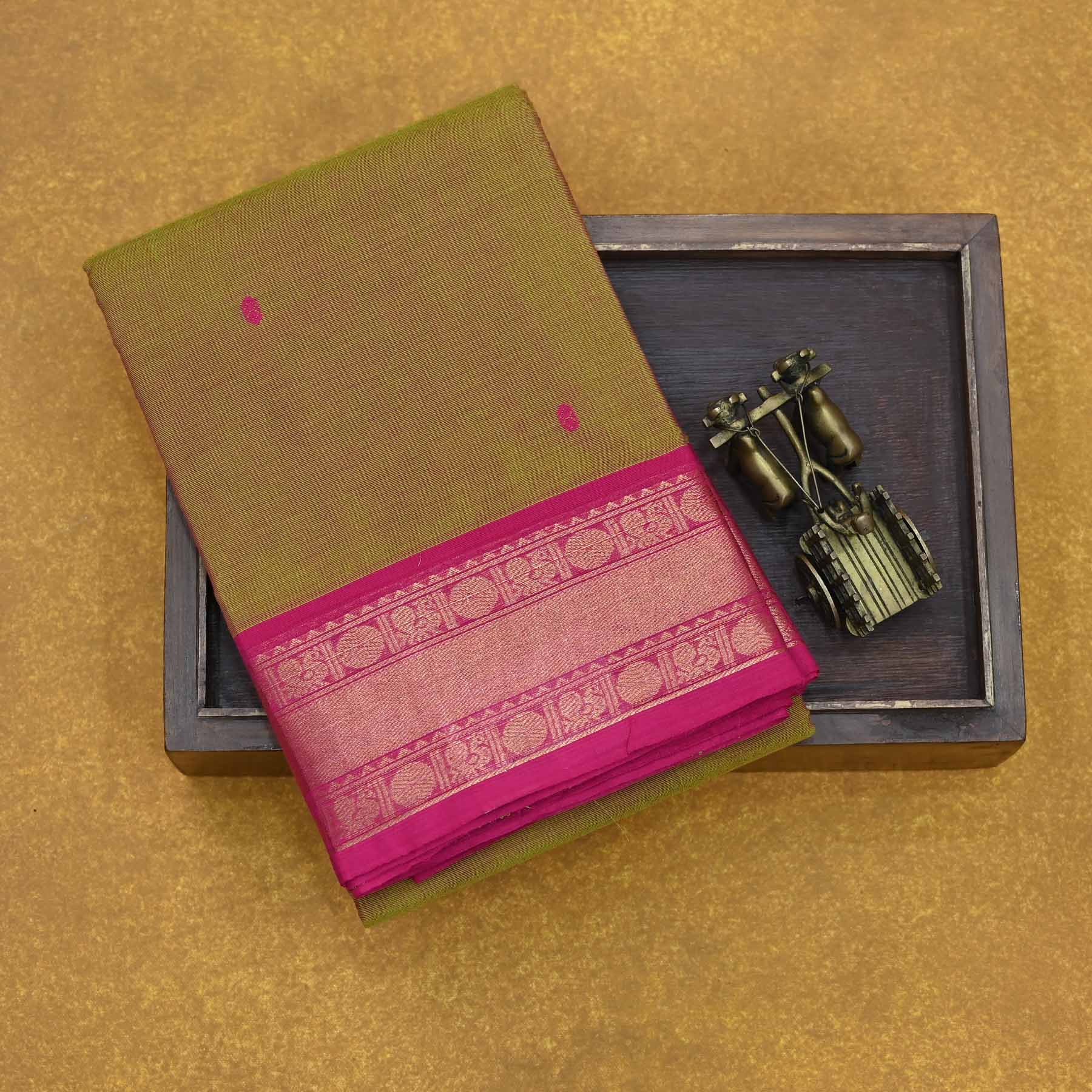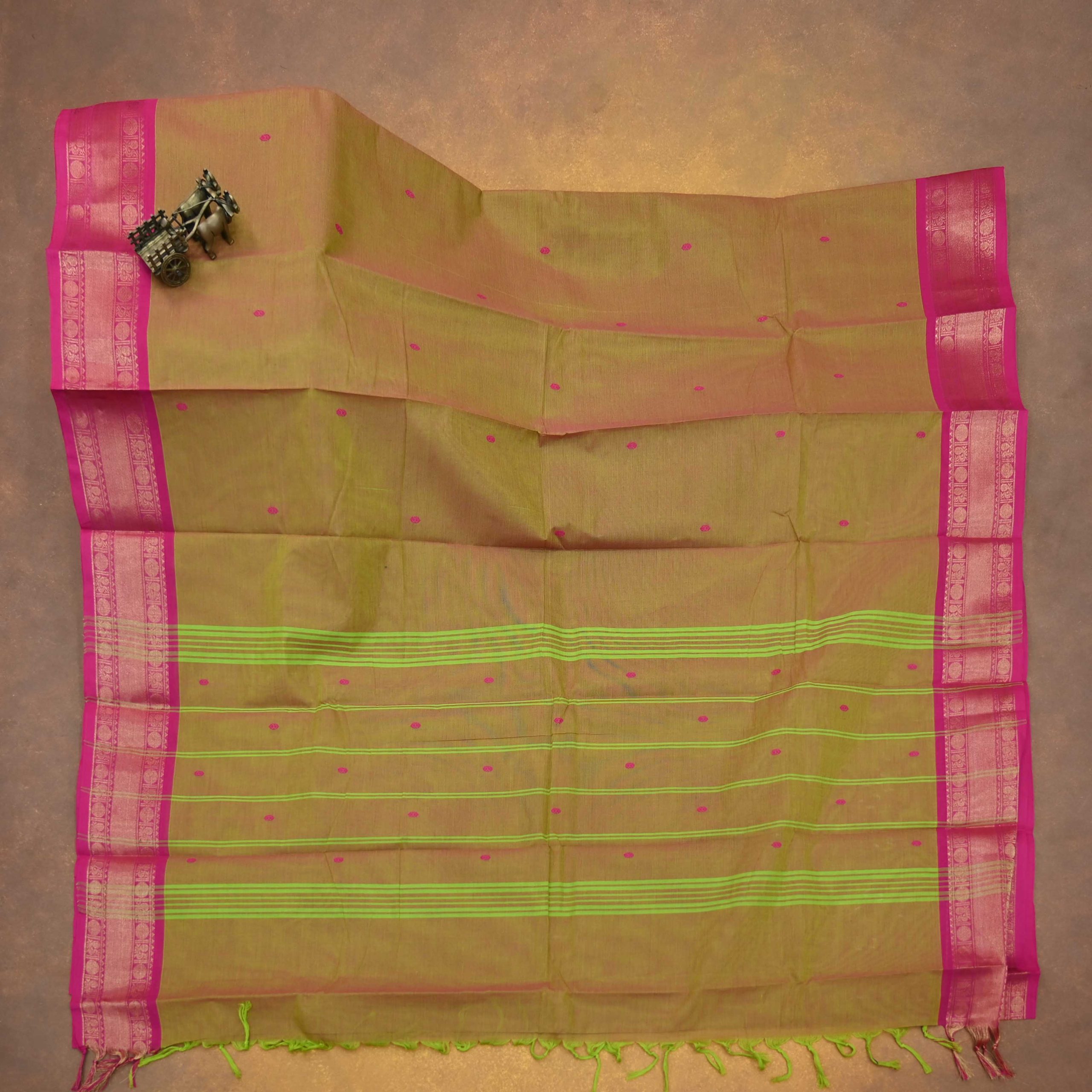 “Dual Shade Green Color fine cotton saree with a traditional border design and delicate small motifs woven all over the body — a graceful blend of heritage and everyday charm.”