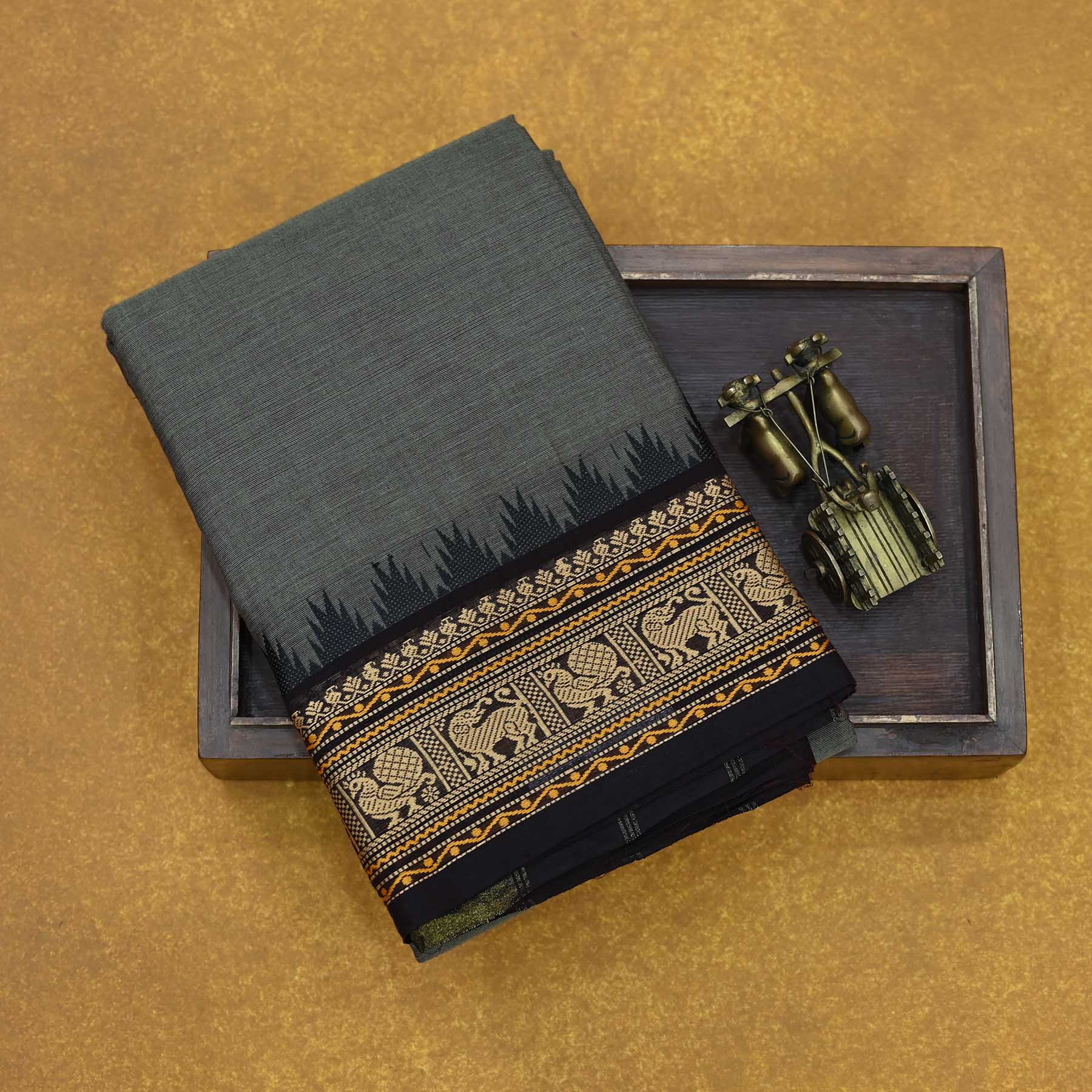 “Gray Color fine cotton saree with a traditional border design and delicate small motifs woven all over the body — a graceful blend of heritage and everyday charm.”
