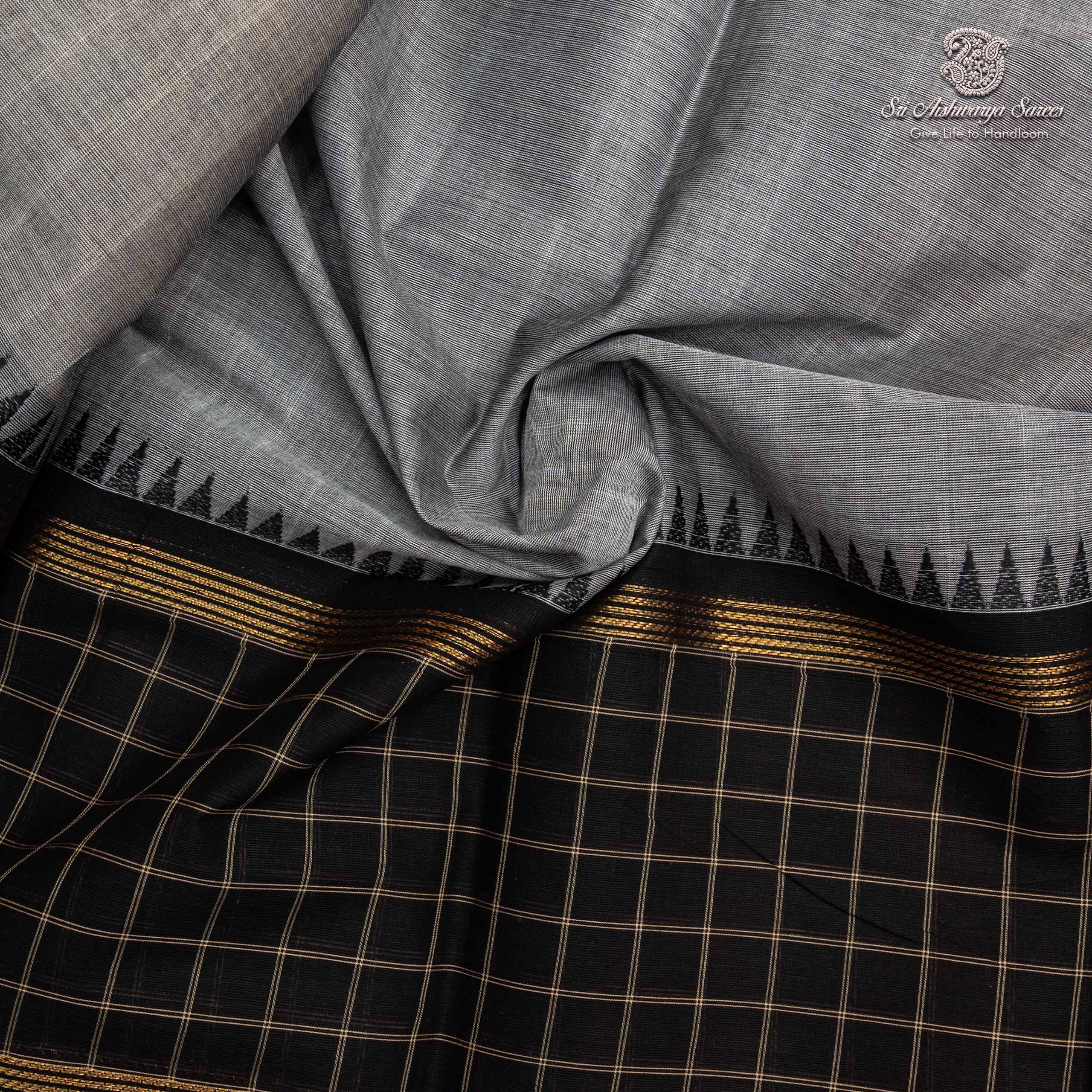 A Light Grey cotton saree drapes with effortless grace, offering breathable comfort and a soft, natural texture against the skin. Its subtle weave and earthy elegance make it perfect for both everyday charm and special gatherings.