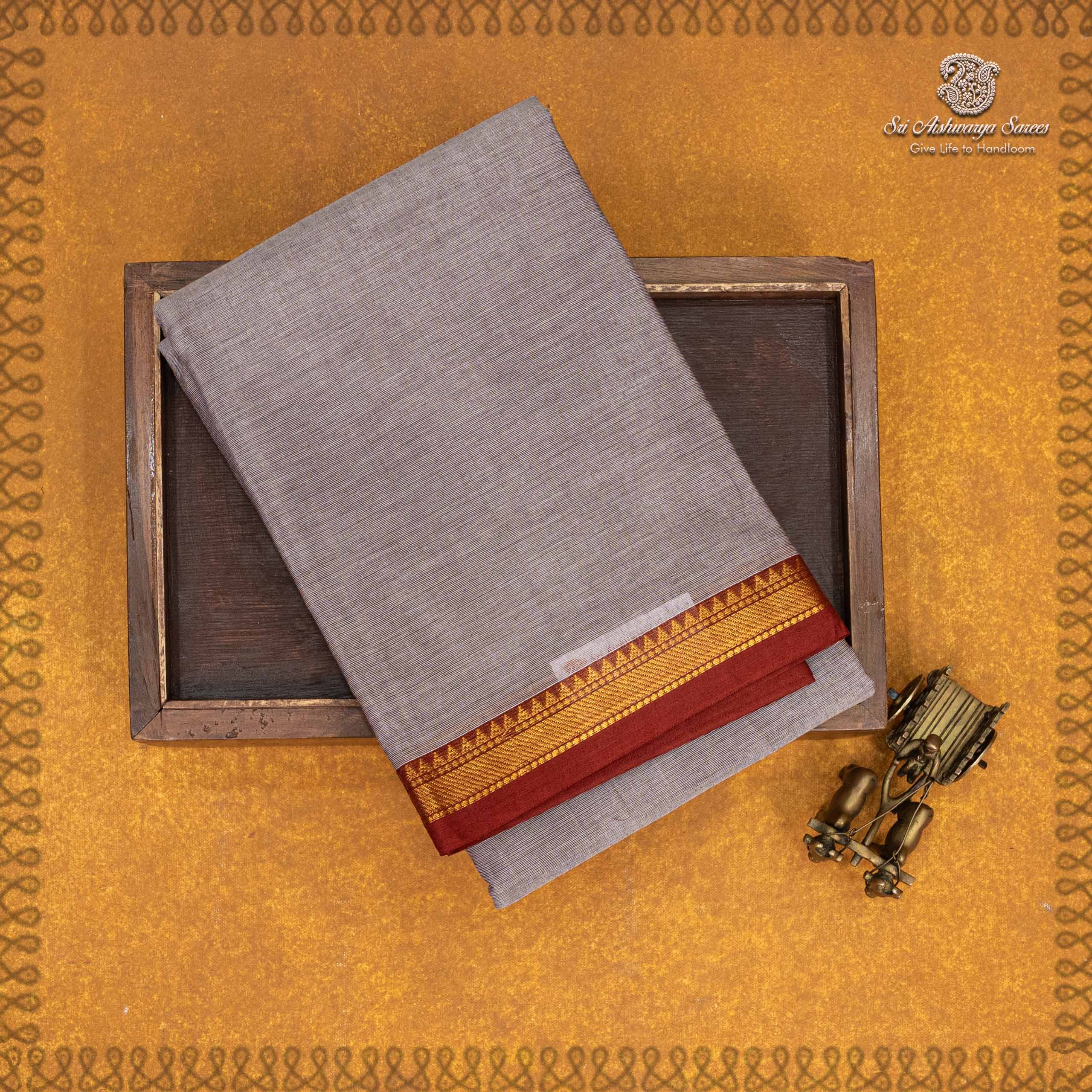 A Pale Silver cotton saree drapes with effortless grace, offering breathable comfort and a soft, natural texture against the skin. Its subtle weave and earthy elegance make it perfect for both everyday charm and special gatherings.
