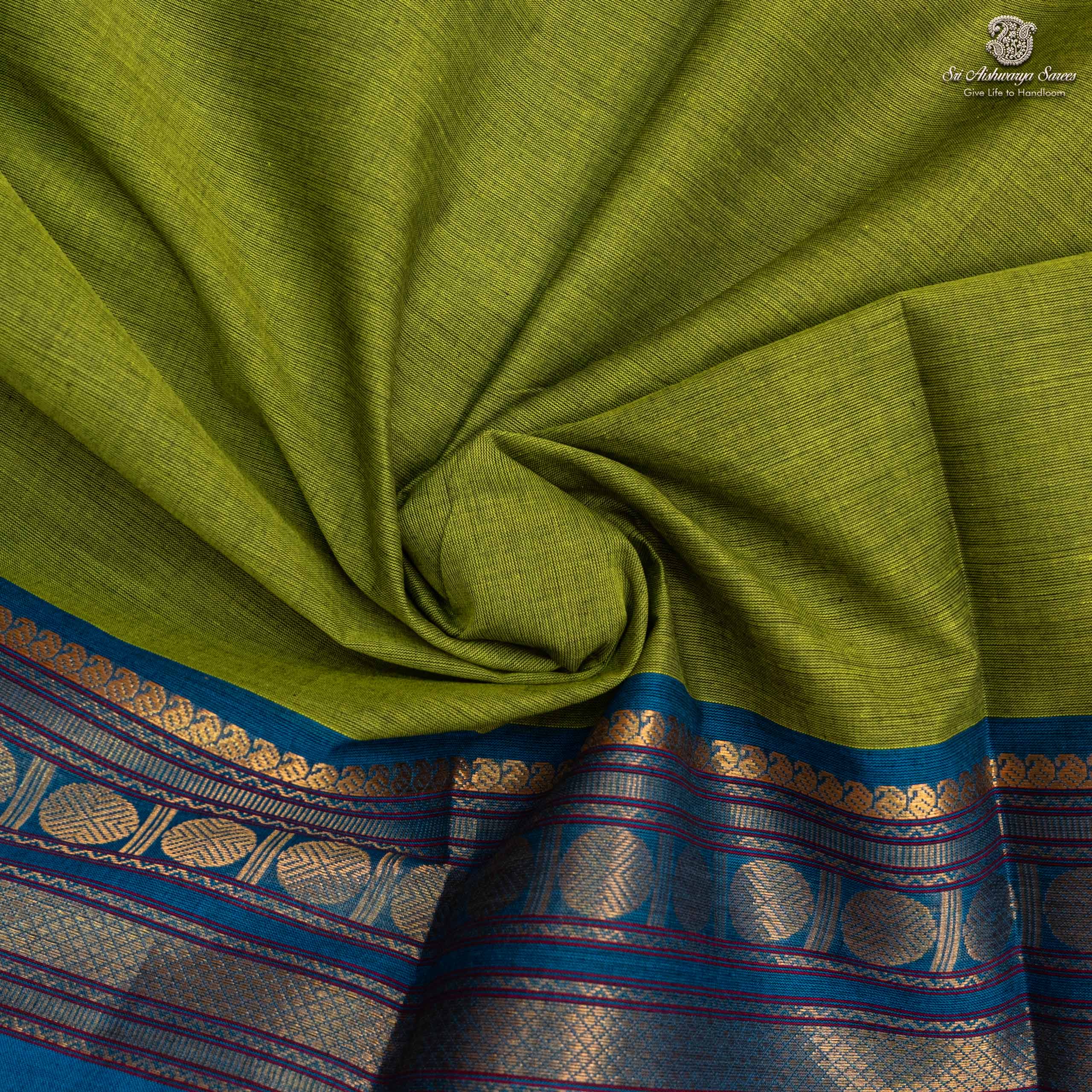 A Wasabi cotton saree drapes with effortless grace, offering breathable comfort and a soft, natural texture against the skin. Its subtle weave and earthy elegance make it perfect for both everyday charm and special gatherings.
