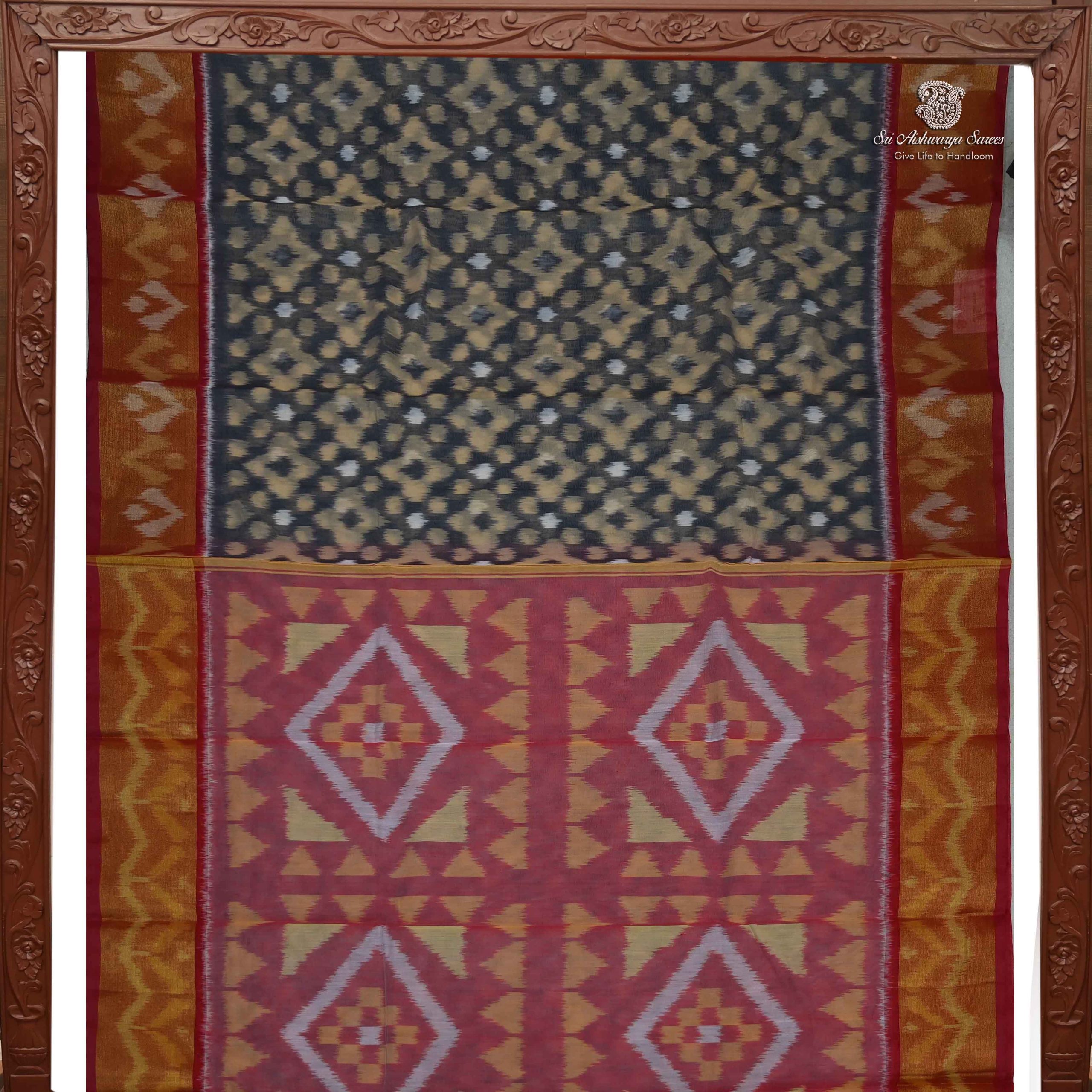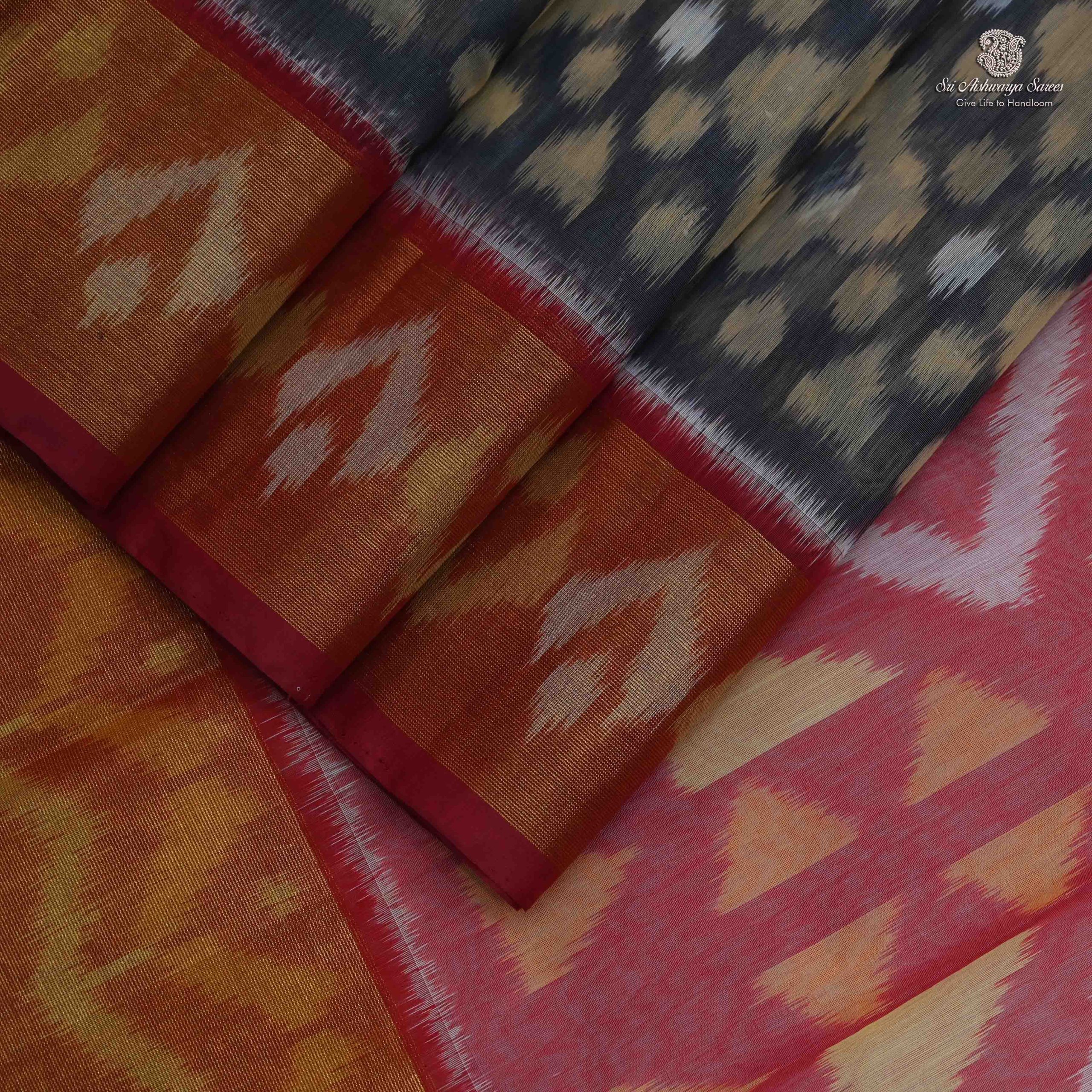 • Kora Silk Cotton sarees with a stunning Gray body adorned in intricate ikkat patterns exude elegance. Complemented by a matching Navy Blue pallu and blouse with a shimmering zari border, it’s a perfect blend of tradition and style.