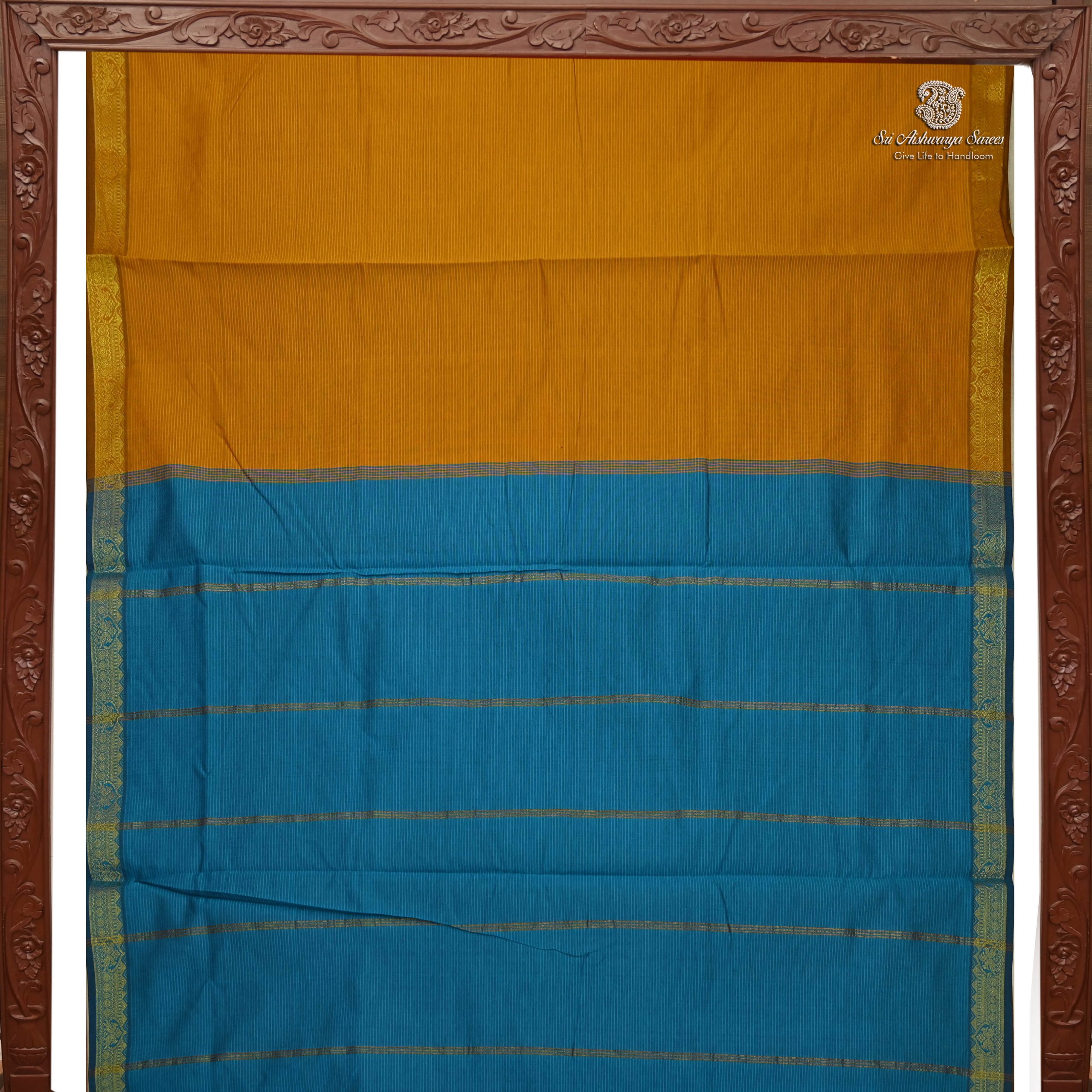 A beautiful 10-yard Madisar saree crafted in semi silk cotton, featuring a rich oil mustard body contrasted with a sea blue pallu.