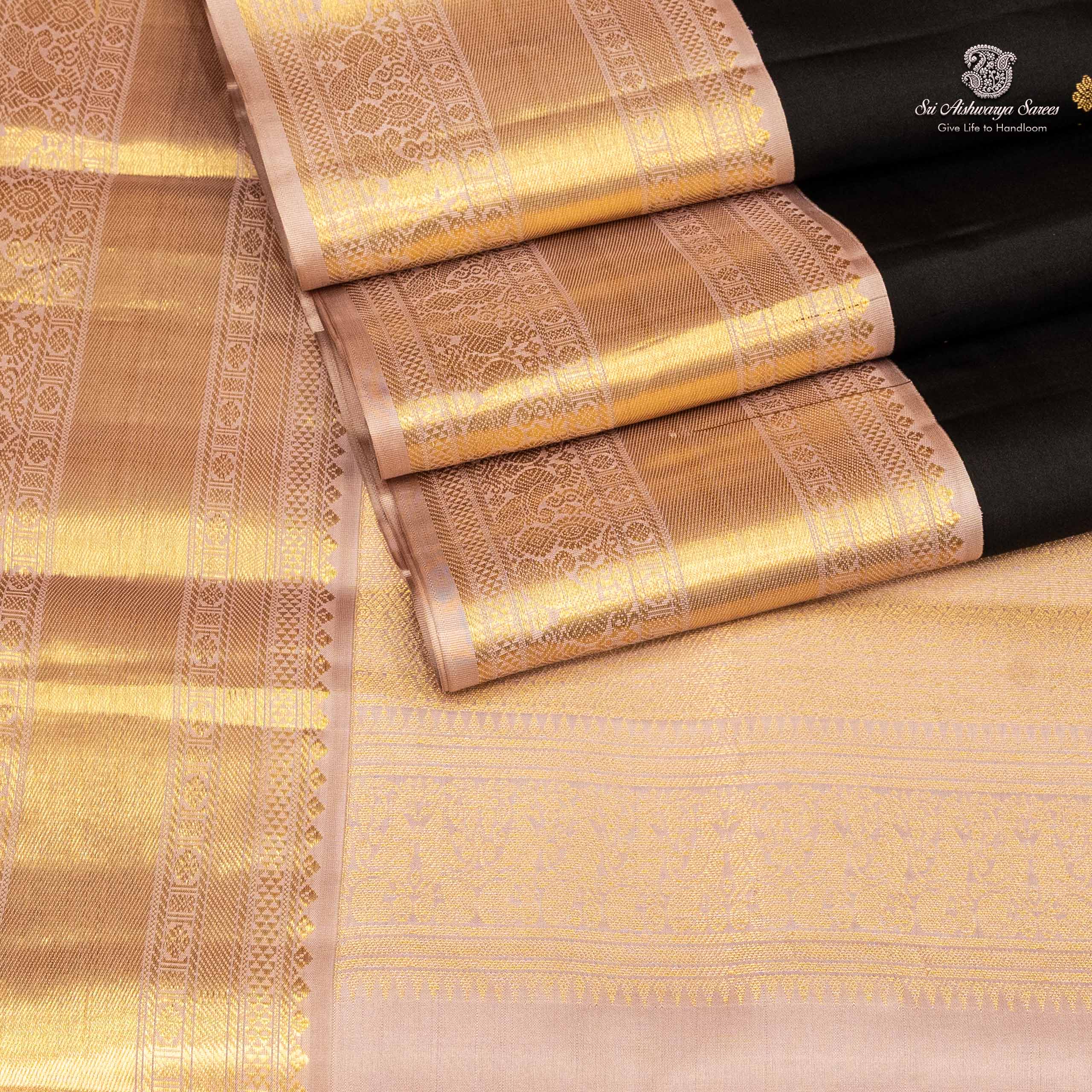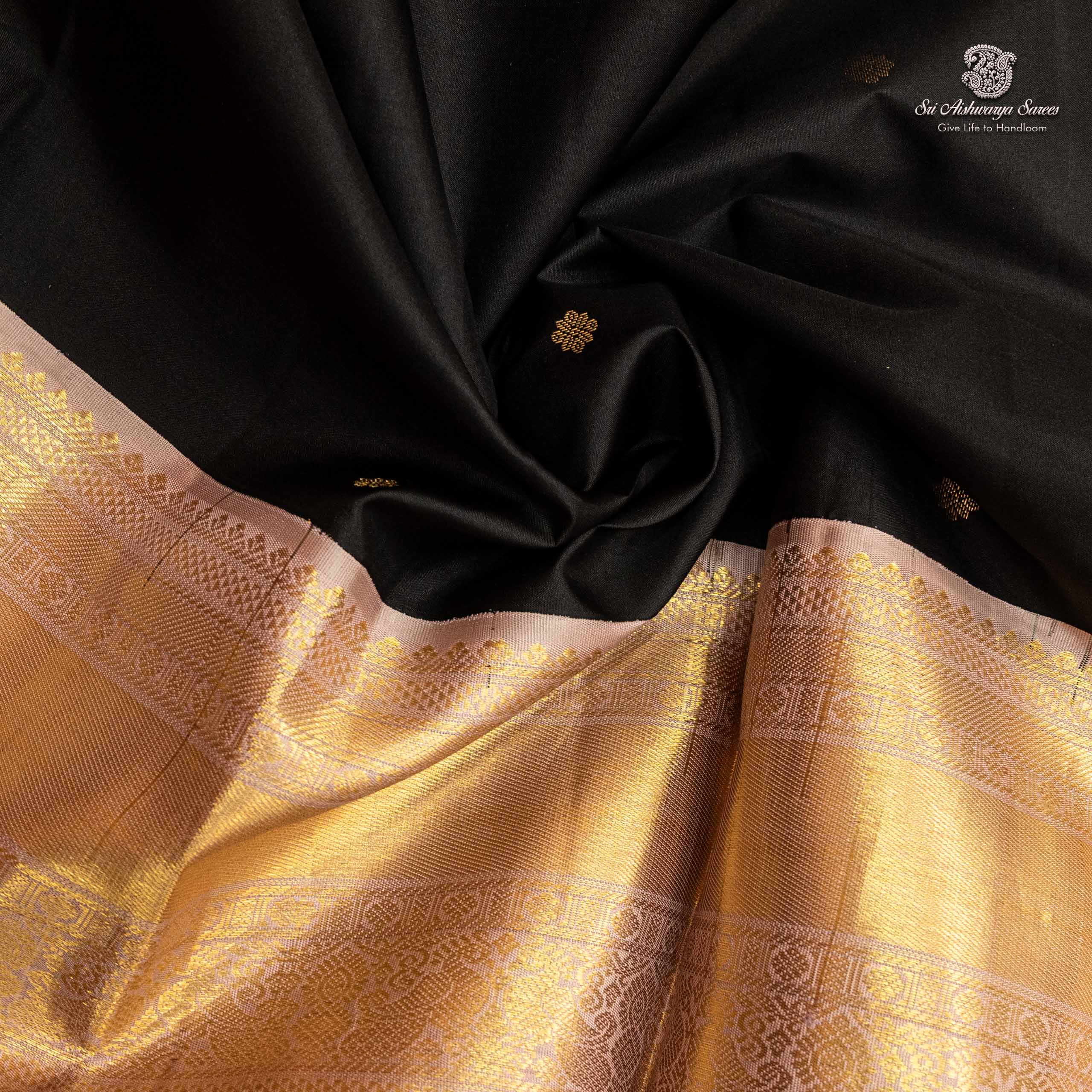 • A classic pure silk saree in timeless black, exuding understated elegance. The ivory pallu and blouse offer a graceful contrast, creating a look of refined sophistication.