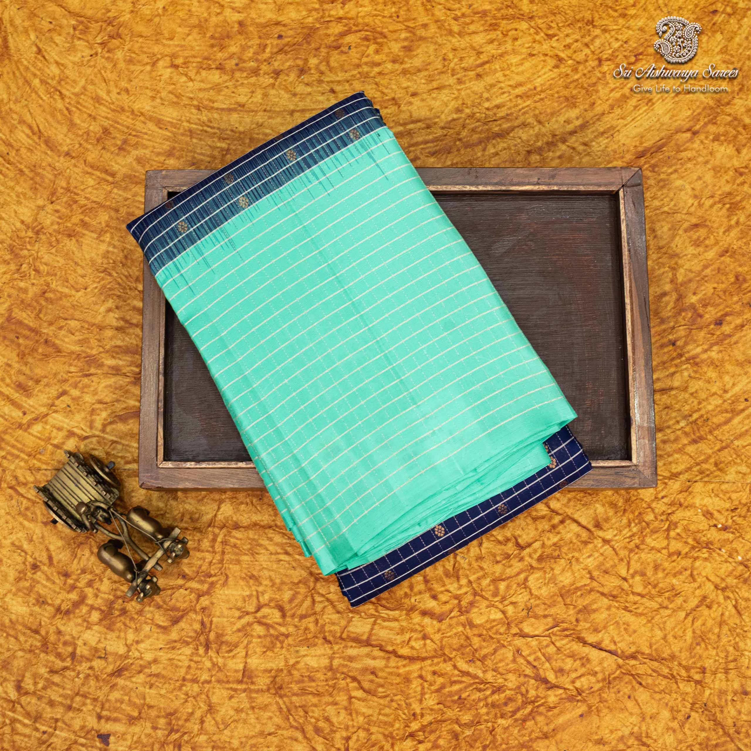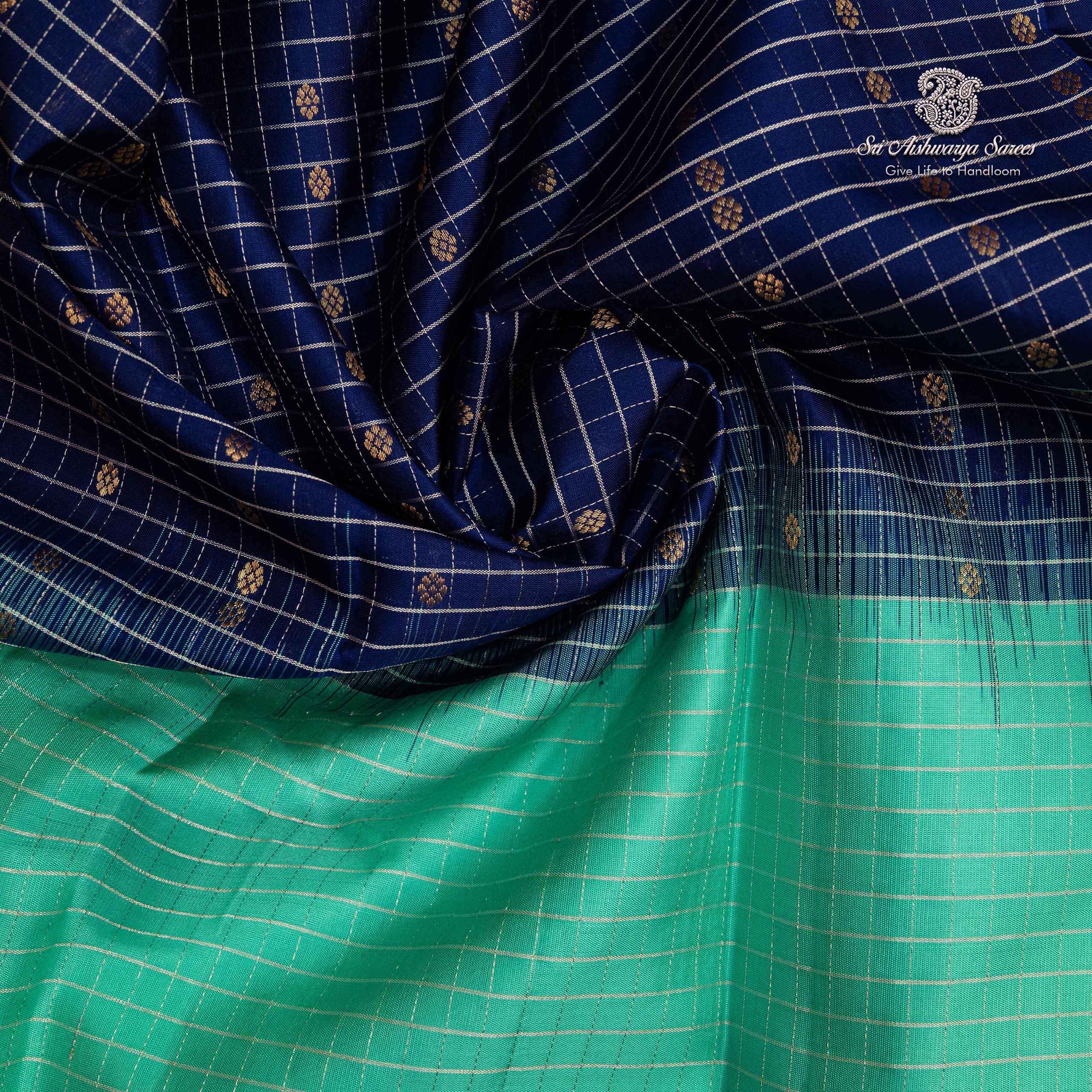 • A dark navy blue pure silk saree with all over body kattam butta that exudes timeless sophistication and refined charm.