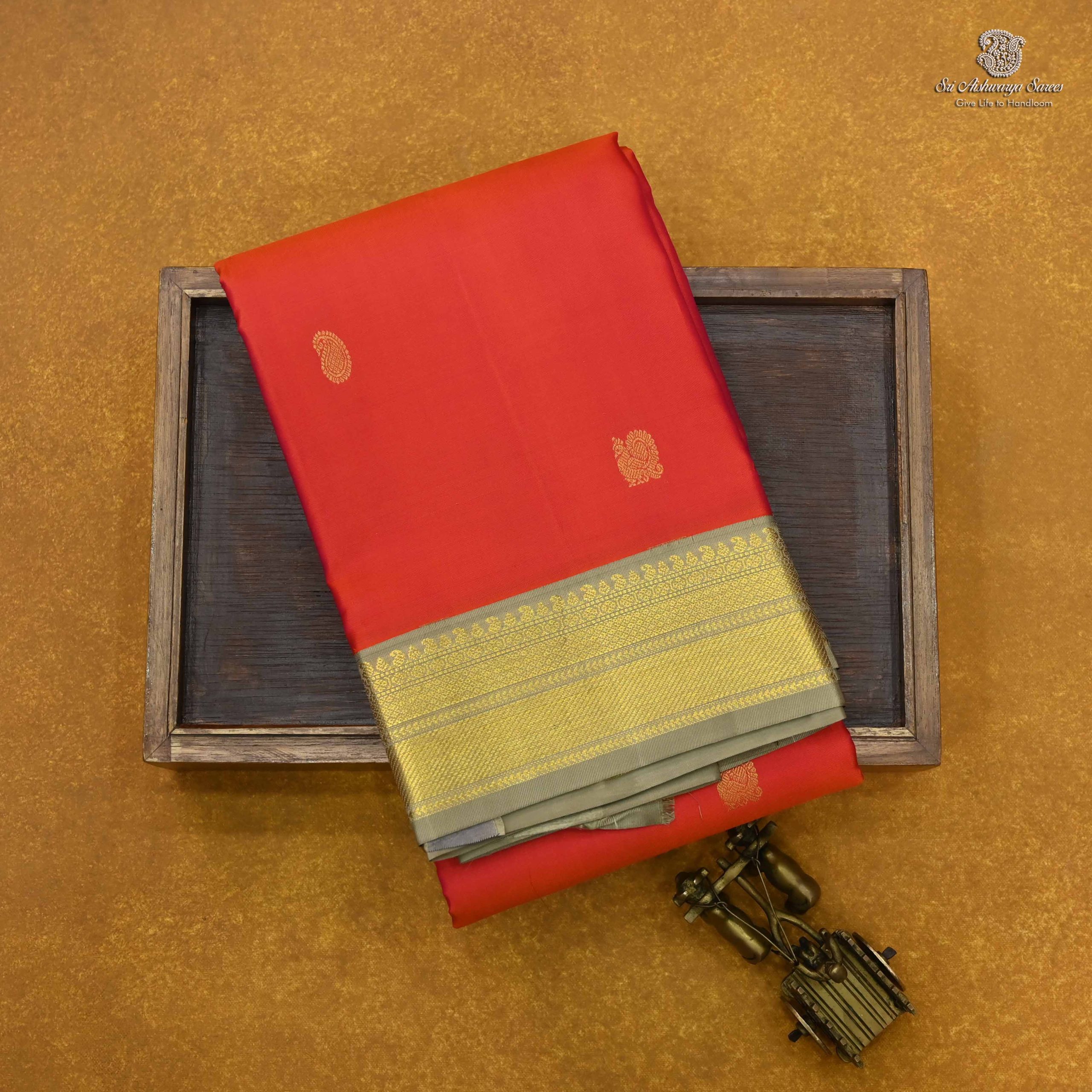 Pure silk saree in a radiant dual shade of orange interwoven with soft pink tones, creating a vibrant yet refined drape. Paired with a striking light grey contrast blouse and matching pallu, the saree offers a modern balance of brightness and understated elegance.