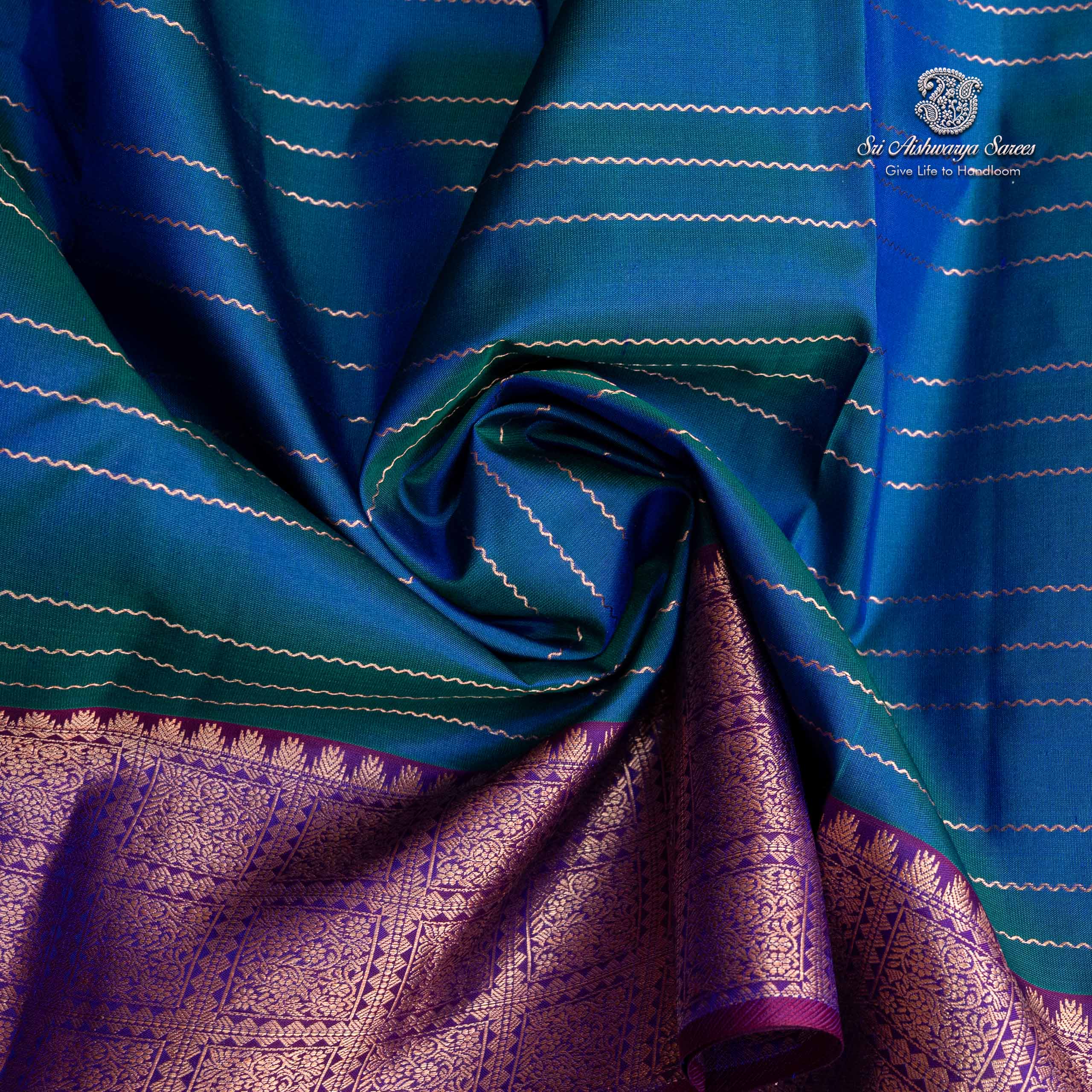 • A radiant dual-shade peacock blue pure silk saree adorned with delicate veldhari woven gracefully across the body, creating a subtle rhythm of shimmer and paired with a nice purple color blouse and matching pallu.