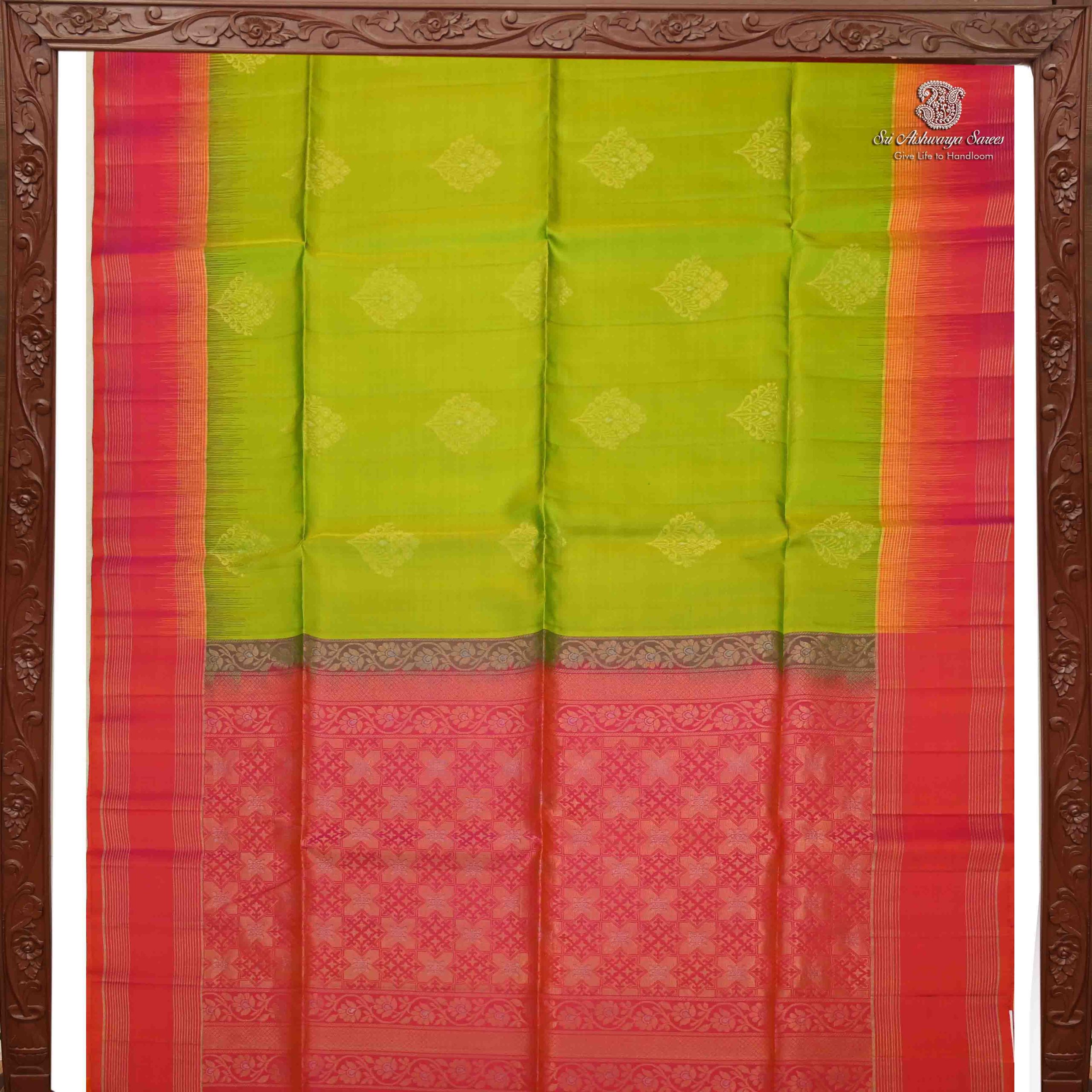 The saree comes with a 5.5-meter drape and a 0.70-meter blouse piece, giving you the flexibility to customize your style. The enchanting fluorescent green shade has been crafted to radiate vibrancy while maintaining a regal appeal. This stunning color allows the saree to be paired effortlessly with contrasting blouses and statement jewelry, making it a versatile choice for both traditional and modern looks.