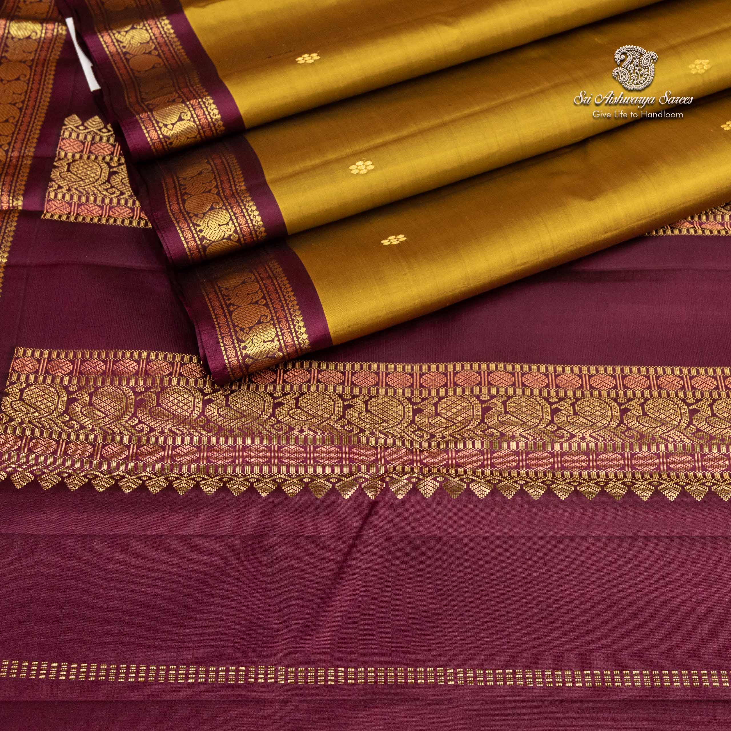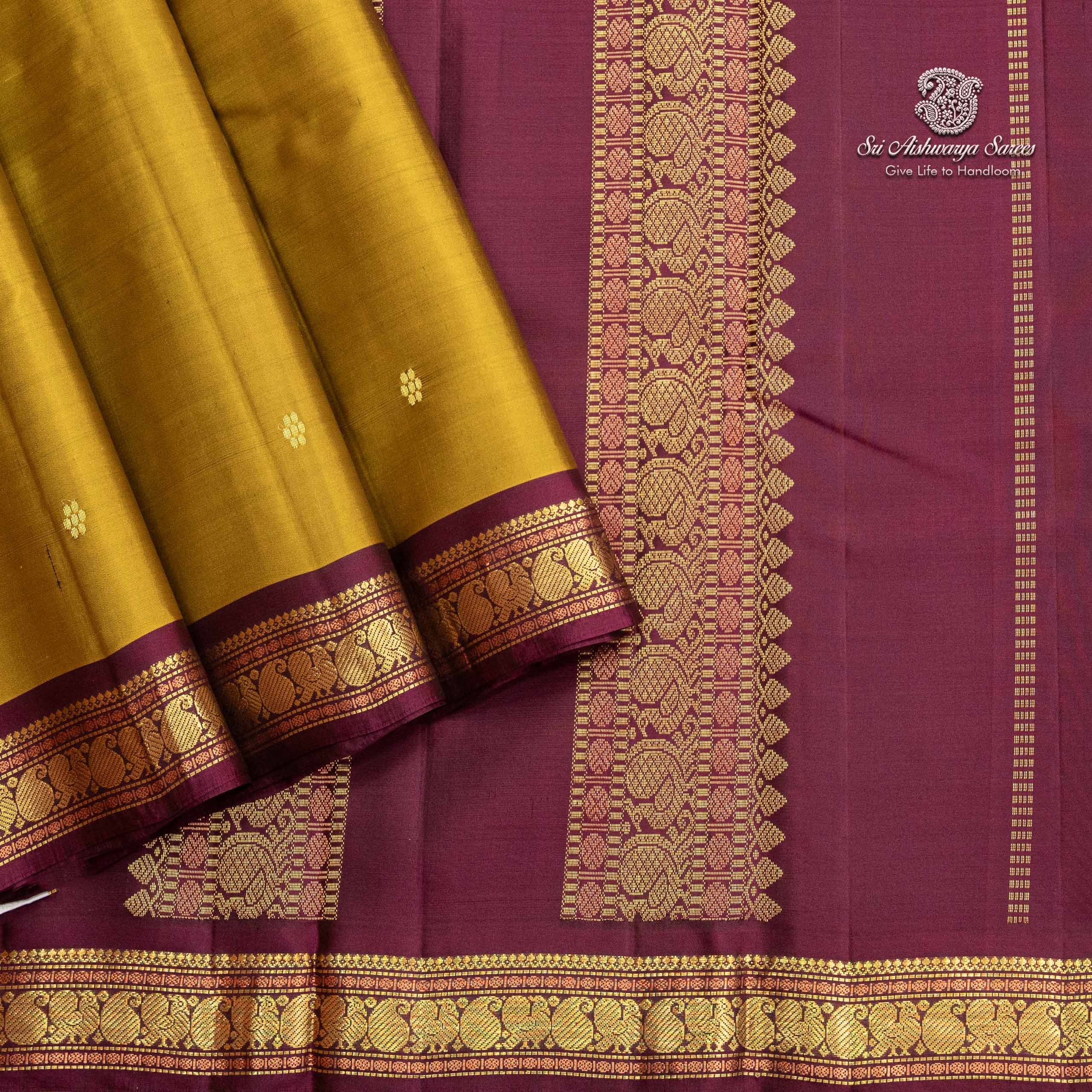 • A radiant pure silk saree in golden yellow, adorned with elegant butta woven across the body. The deep purple blouse and pallu add a regal contrast, completing the look with timeless charm.