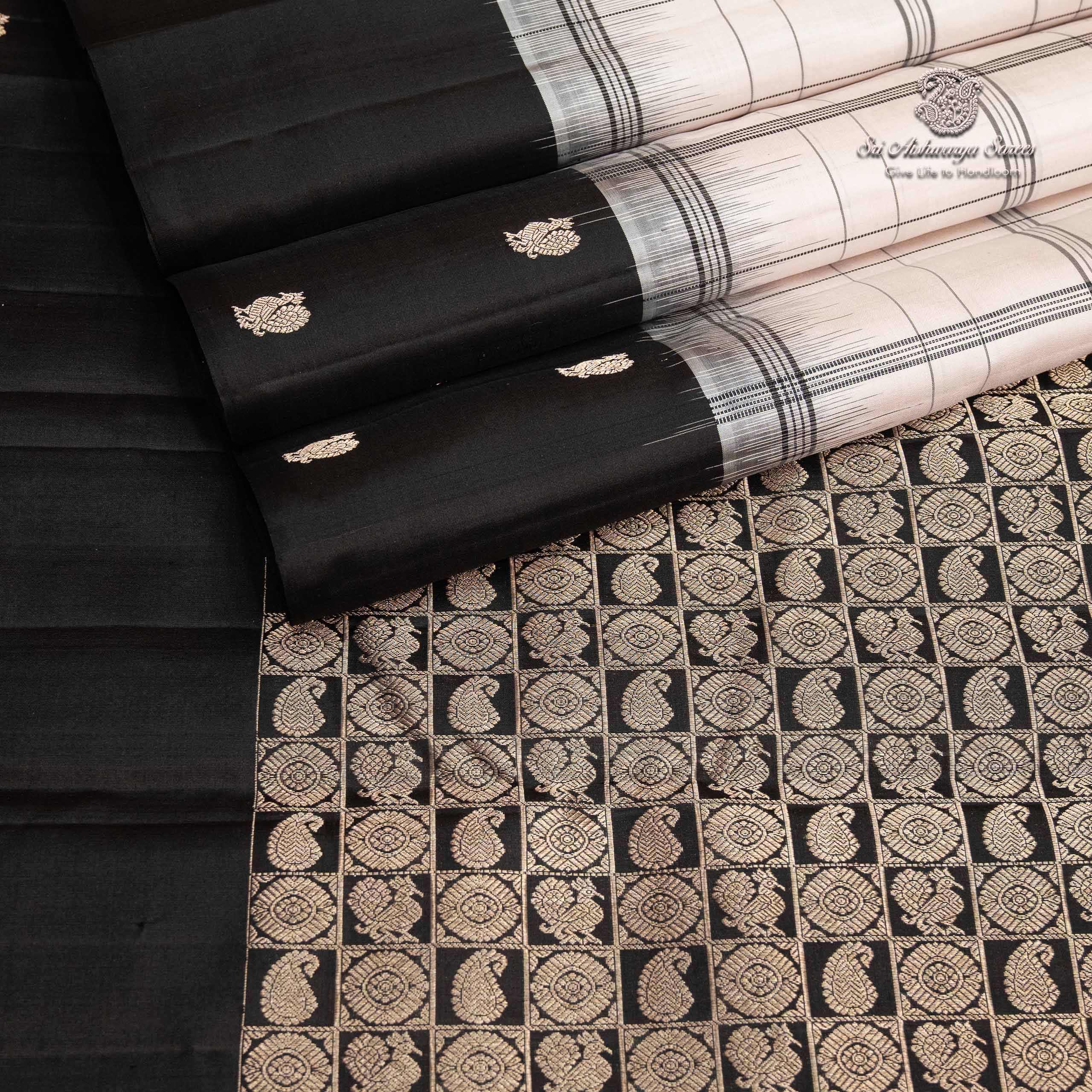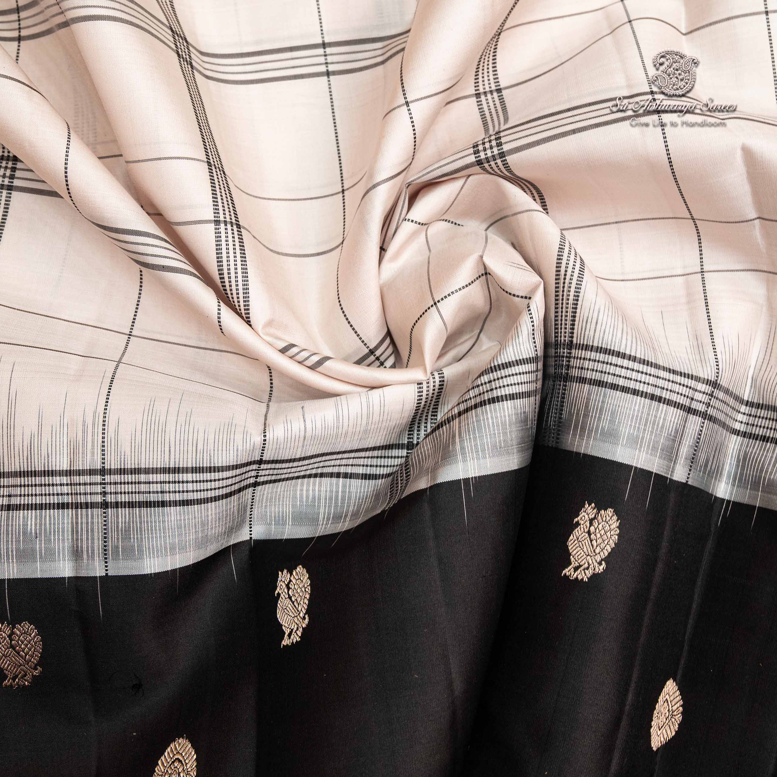 • An elegant ivory white pure silk saree adorned with classic checks that lend subtle structure and charm. Paired with a vibrant black color blouse creates a look that is graceful and effortlessly refined.