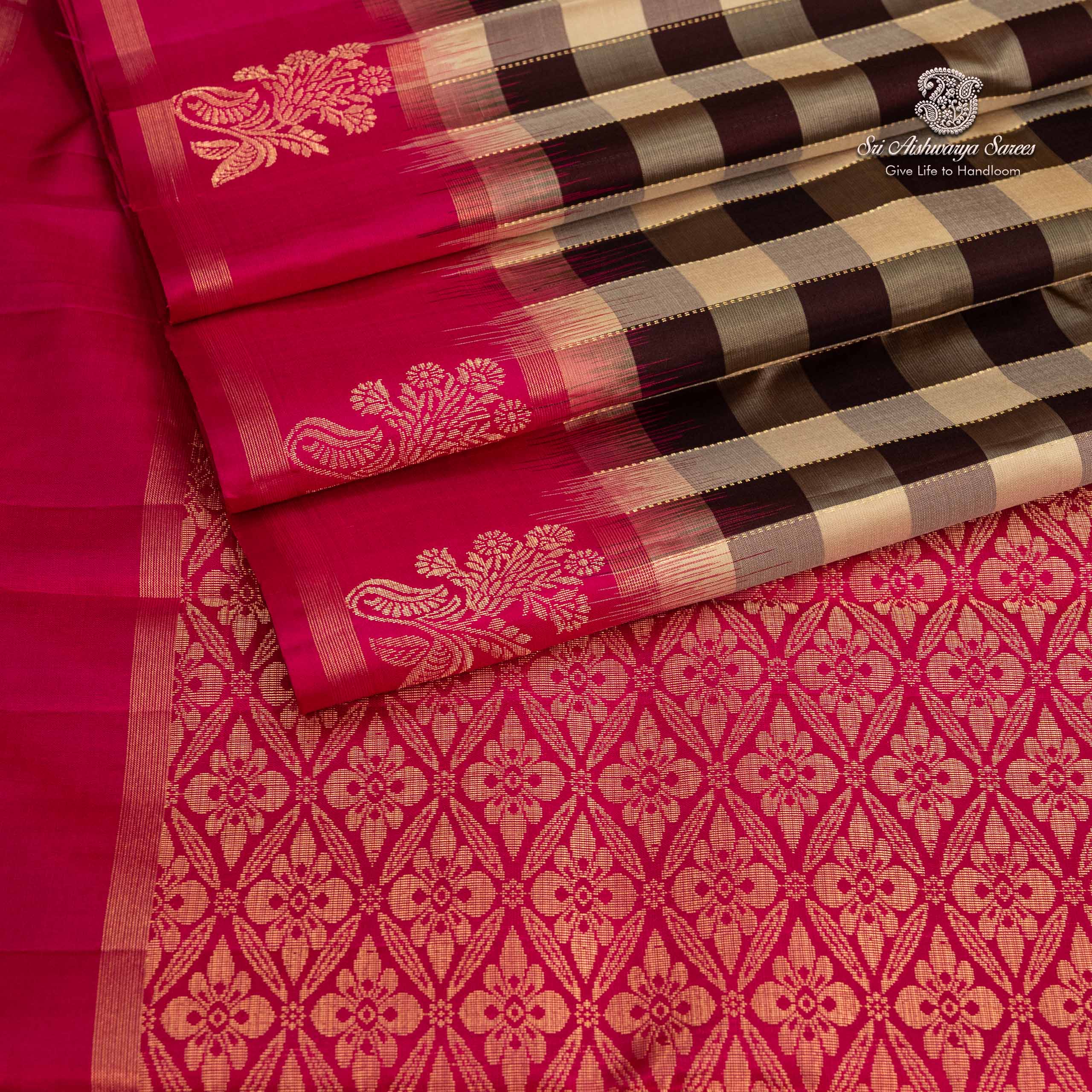 • A vibrant multi-color checks pure silk saree that brings playful energy and classic charm to the weave. Paired with a striking rani pink blouse, it adds a bold, feminine finish that beautifully elevates the look.