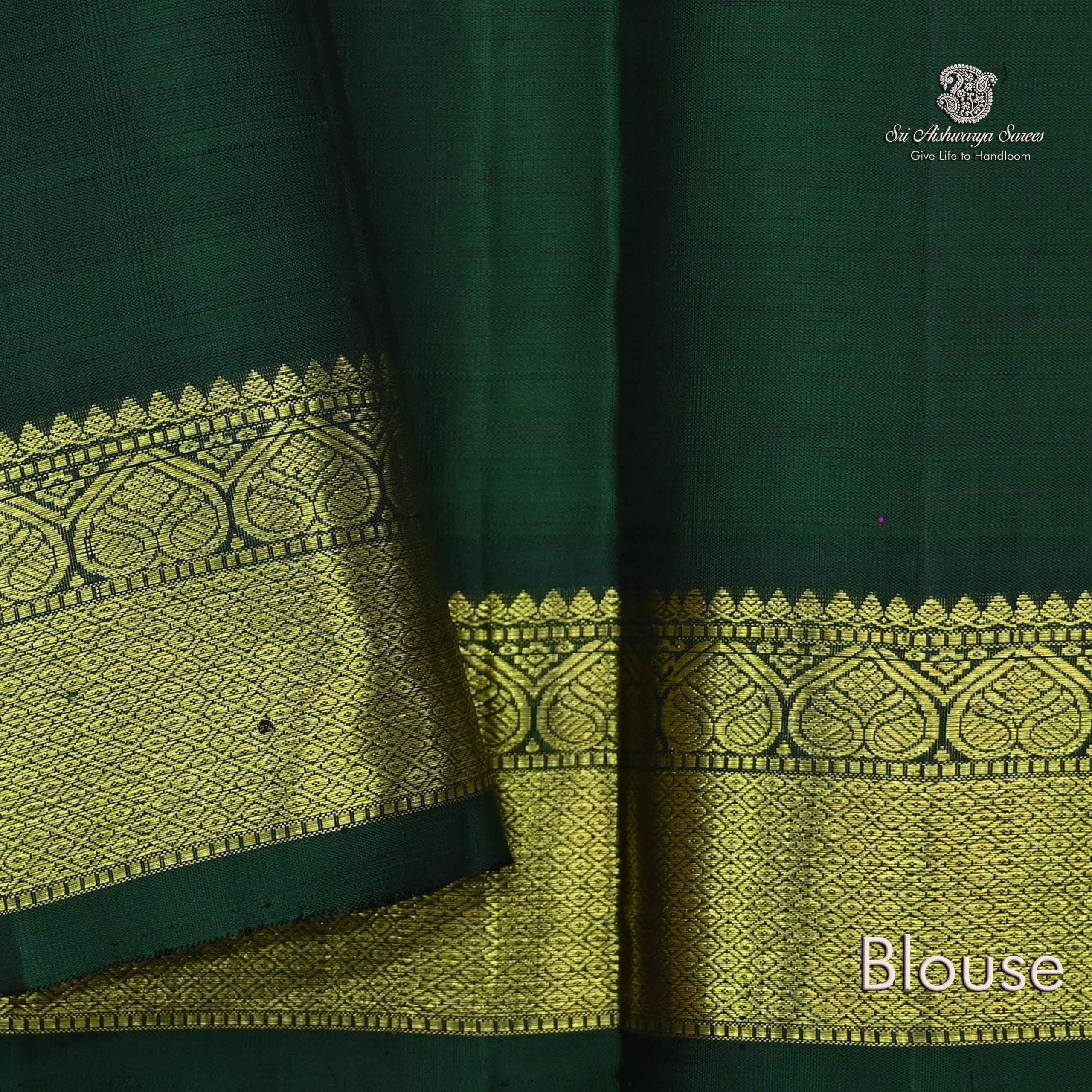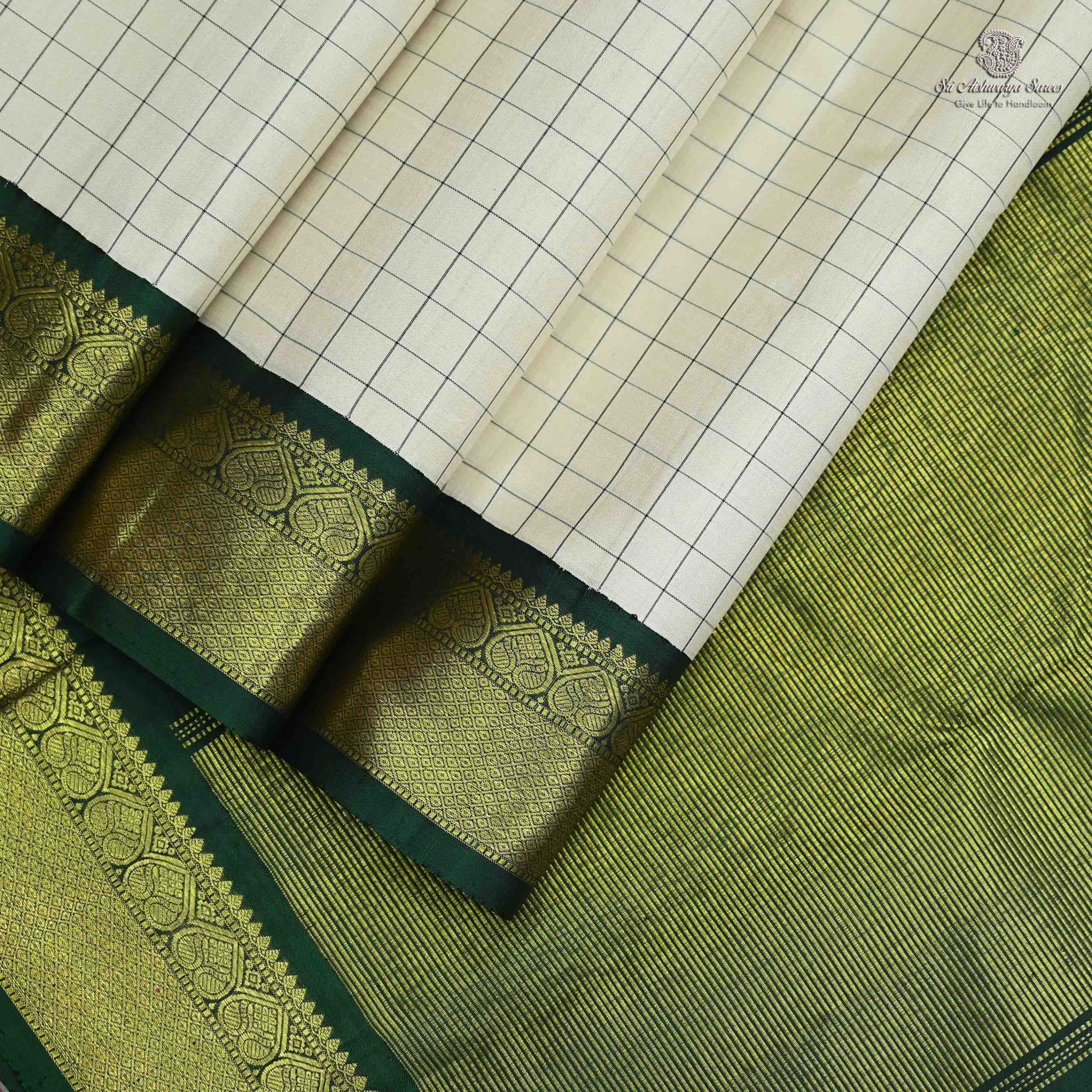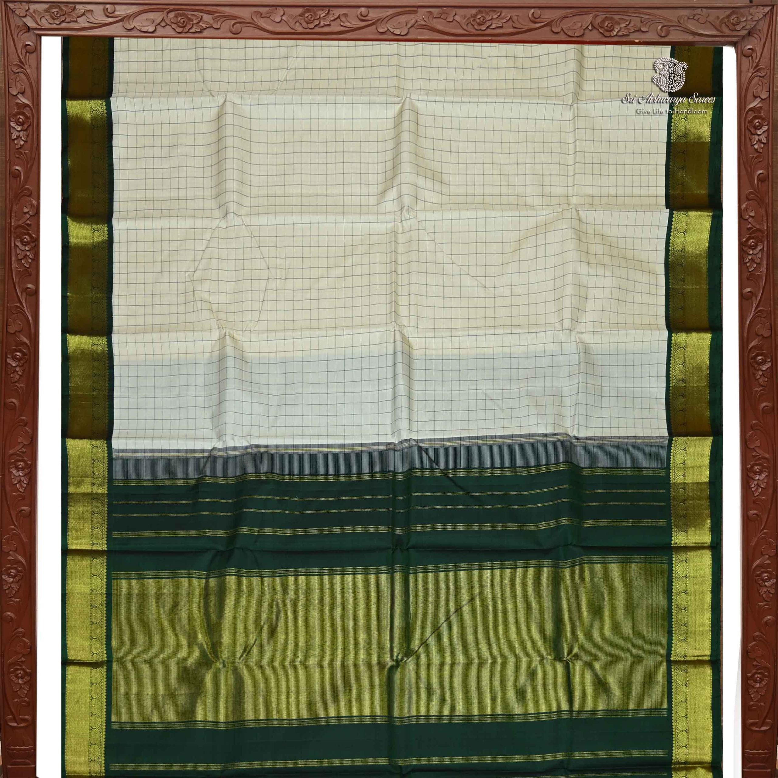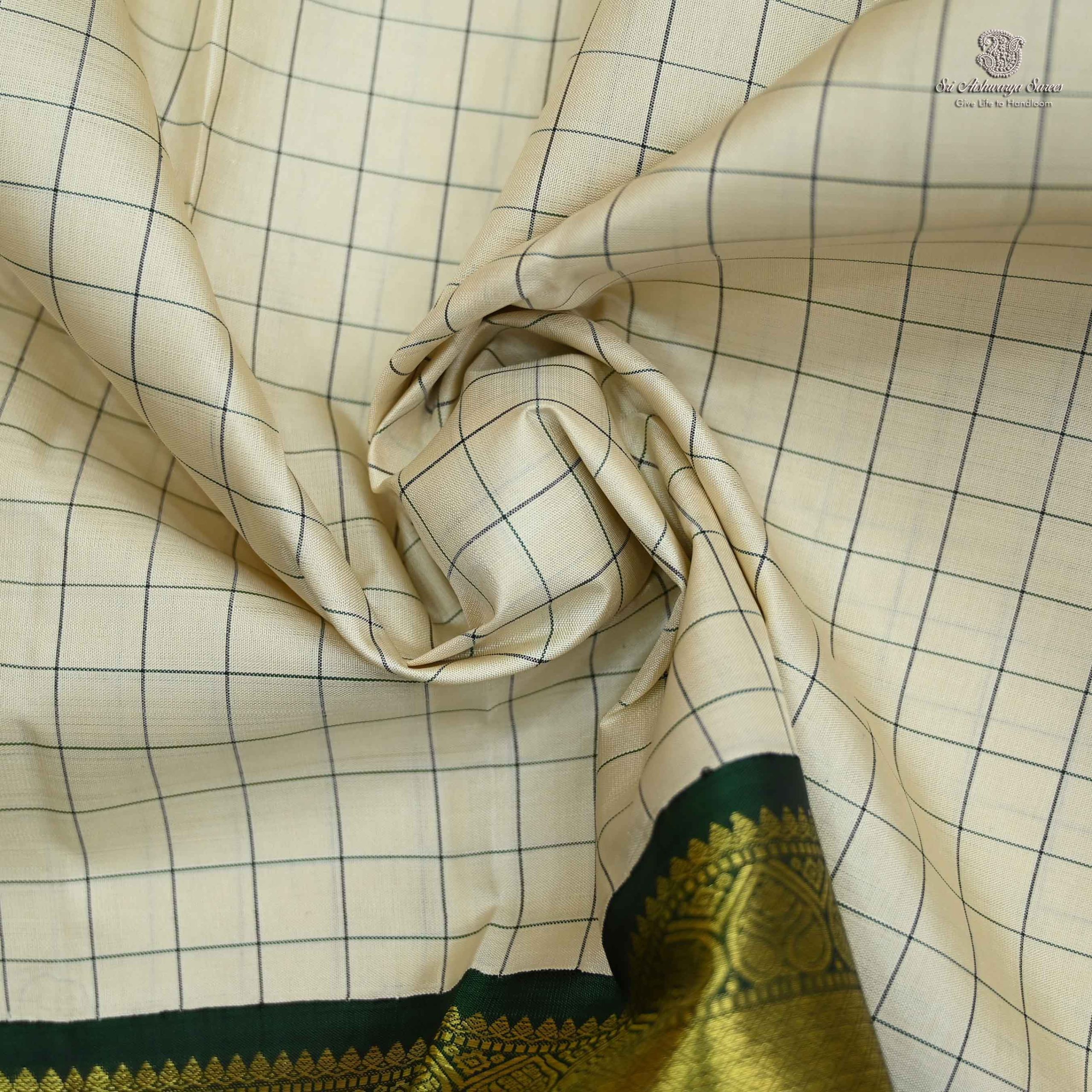 • Pure silk saree in off-white, adorned with elegant small checks all over the body. Paired with a deep green pallu and blouse, finished with a traditional golden zari border. An ideal pick for festive occasions, cultural events, or traditional functions.