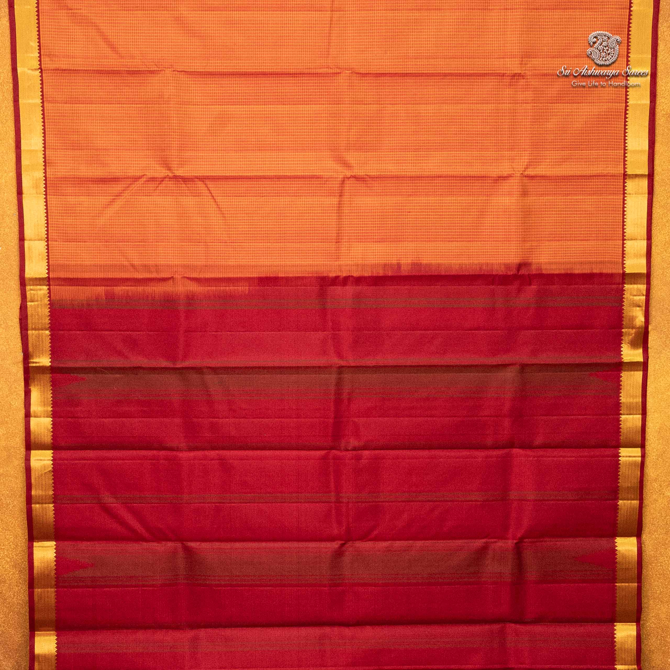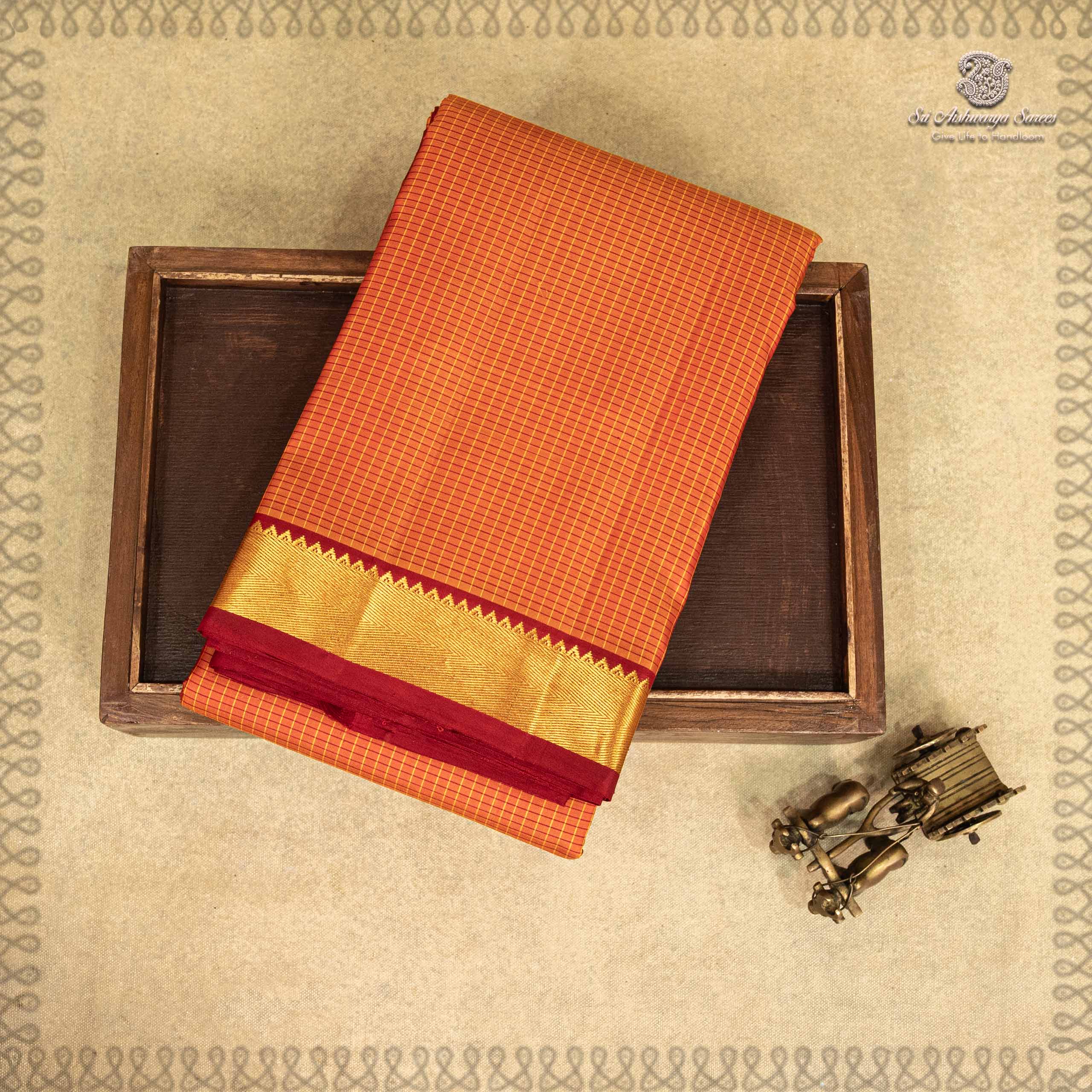 • A vibrant pure silk saree in a orange hue, adorned with classic kattam woven across the body. The rich maroon pallu and blouse add a bold contrast, completing the look with timeless elegance.