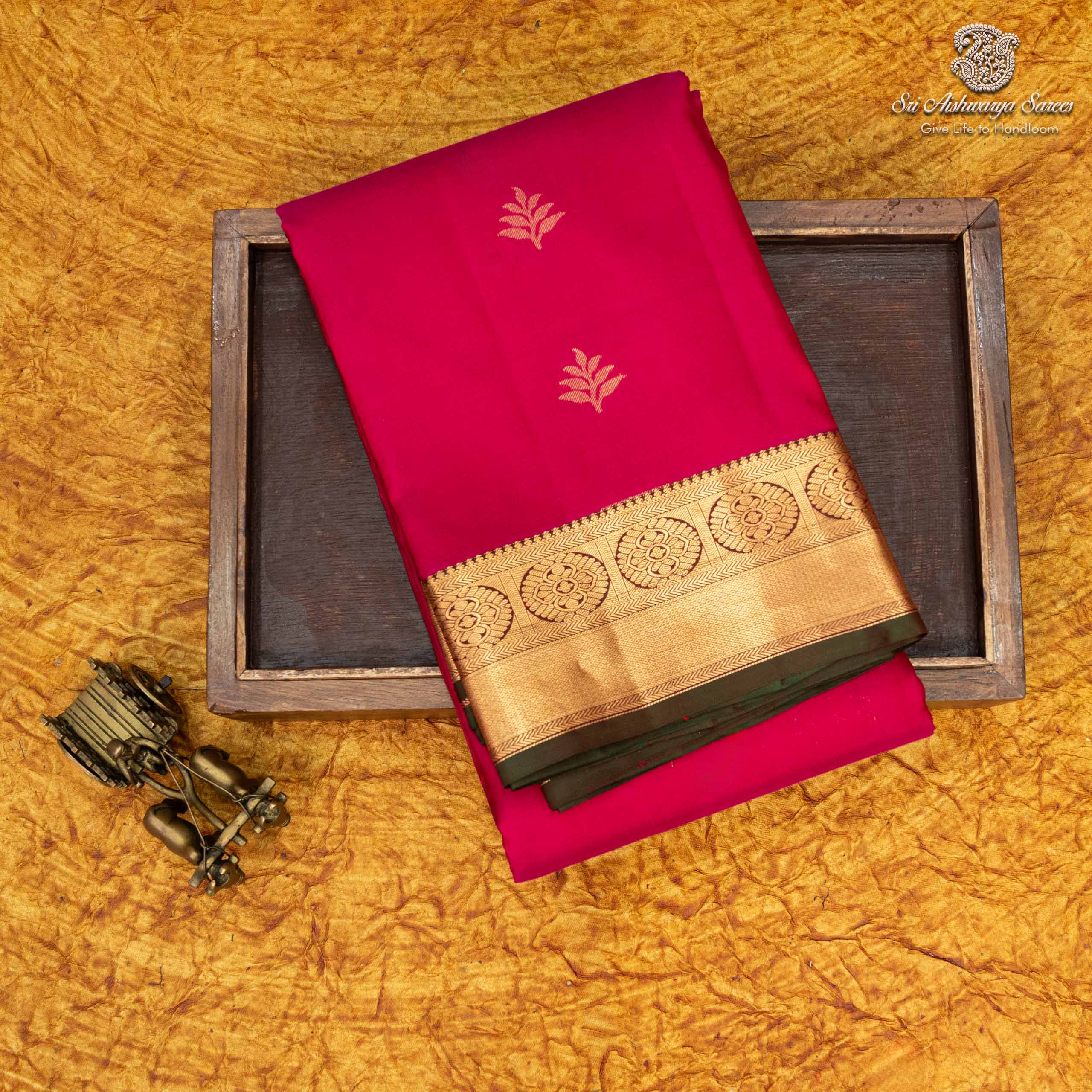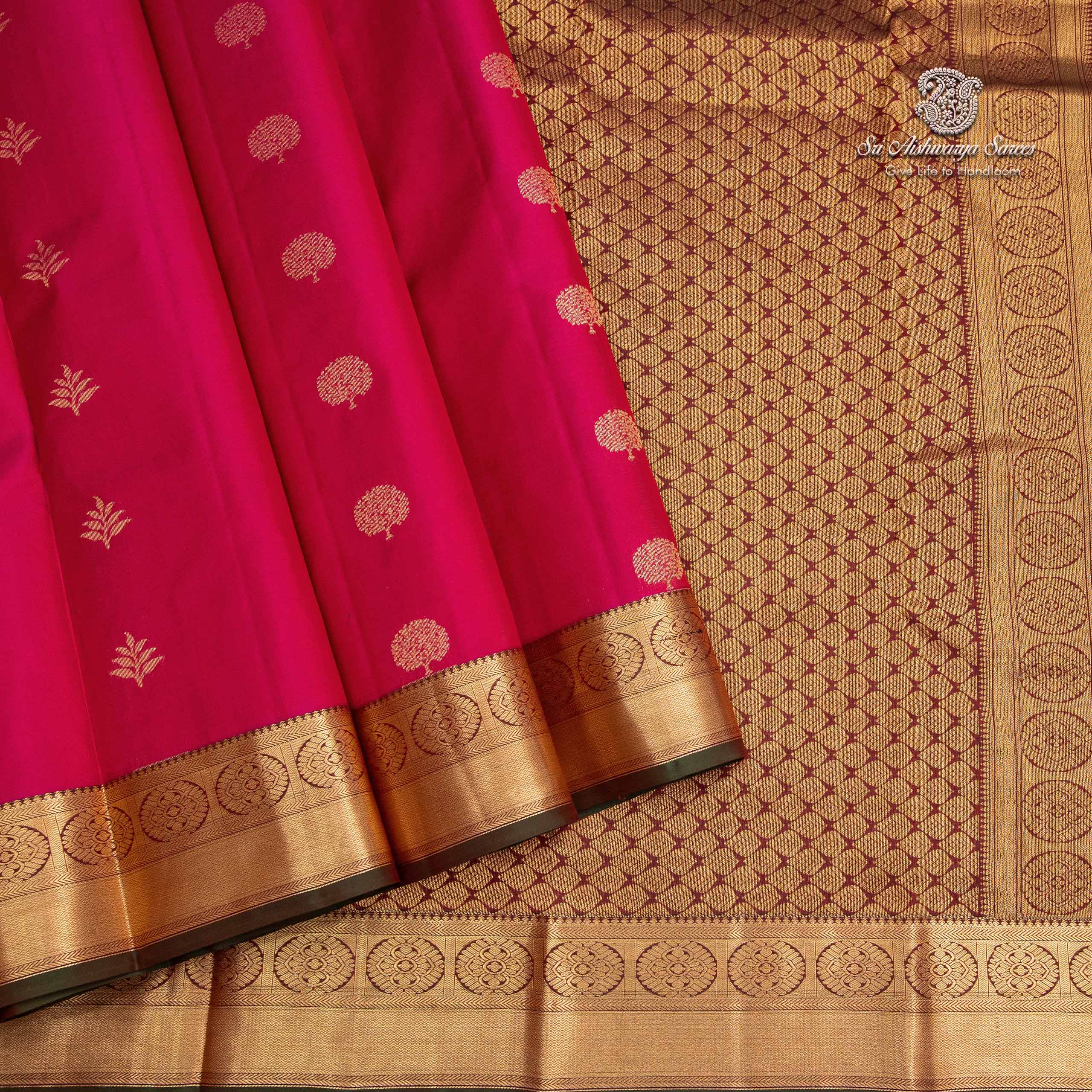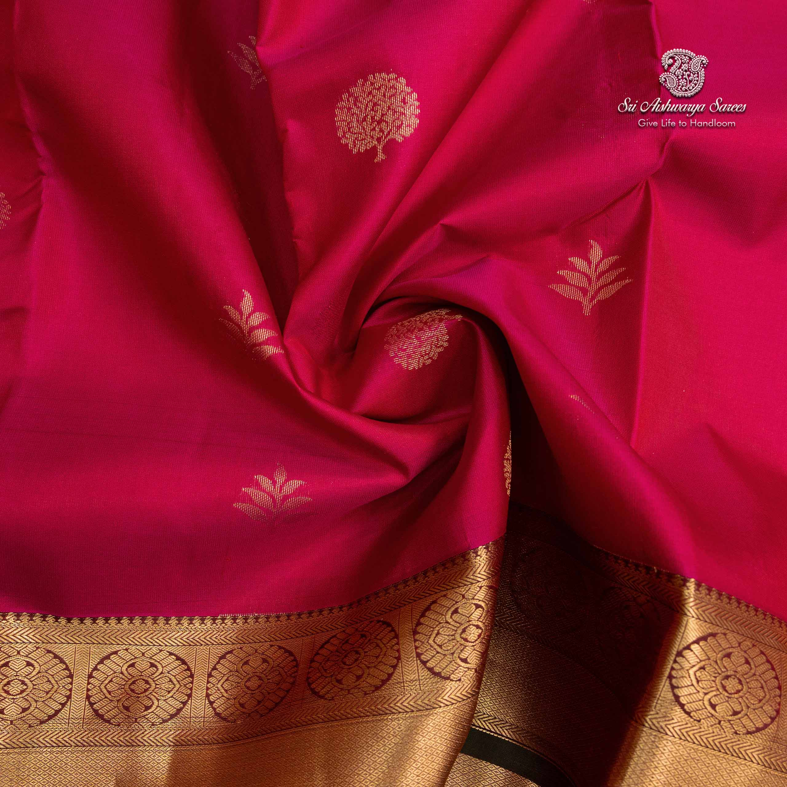A vibrant rani pink pure silk saree adorned with intricate leaf and tree motifs, beautifully woven to reflect nature’s charm.