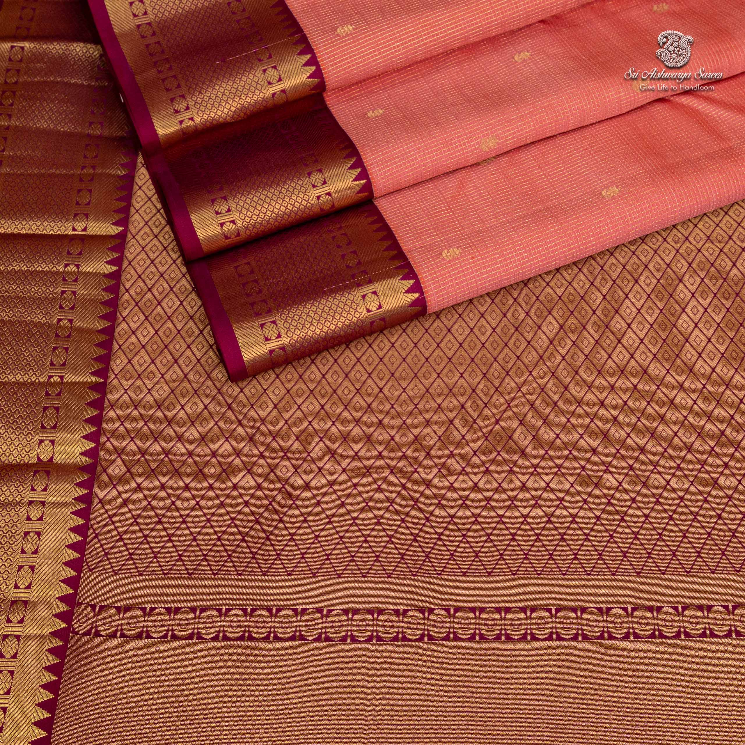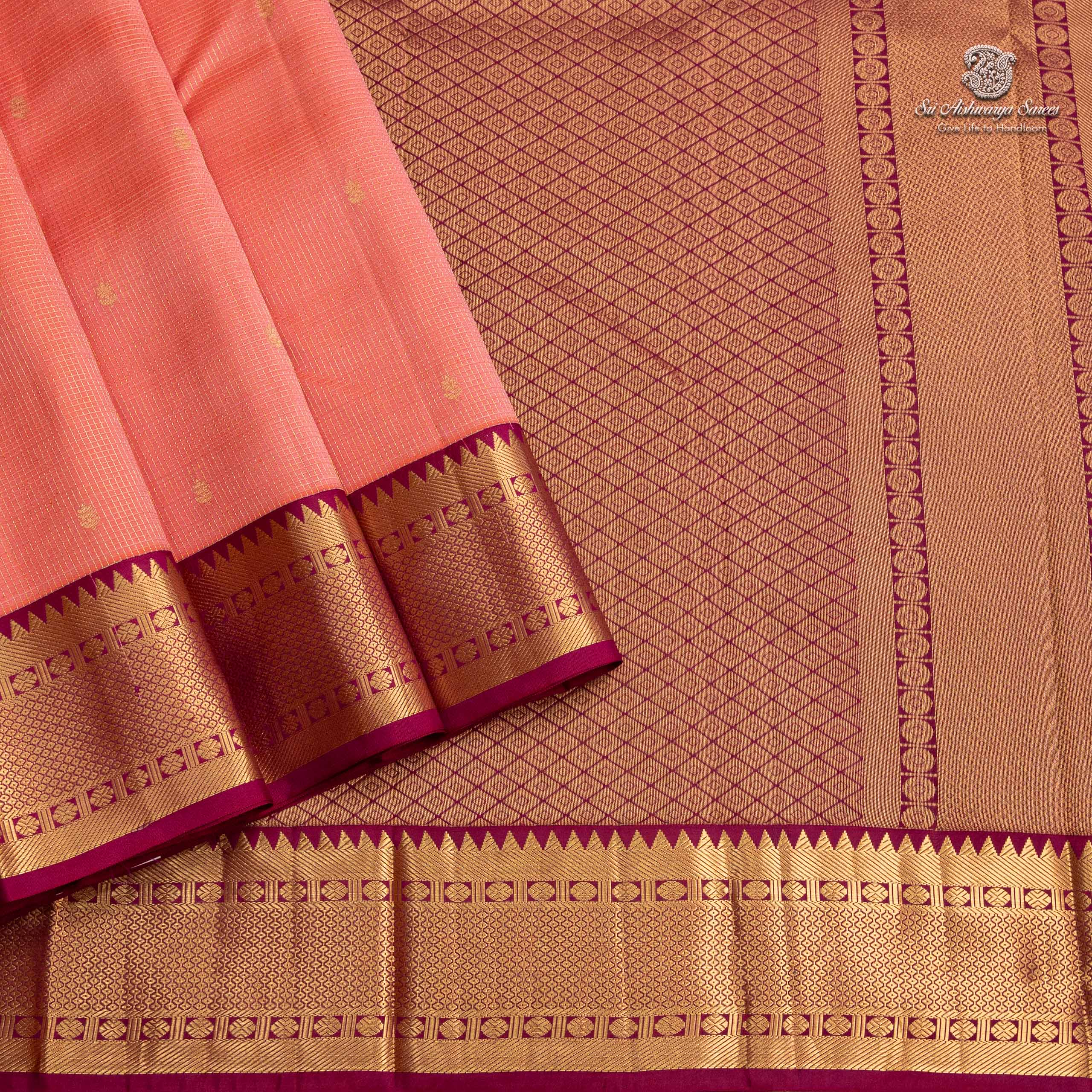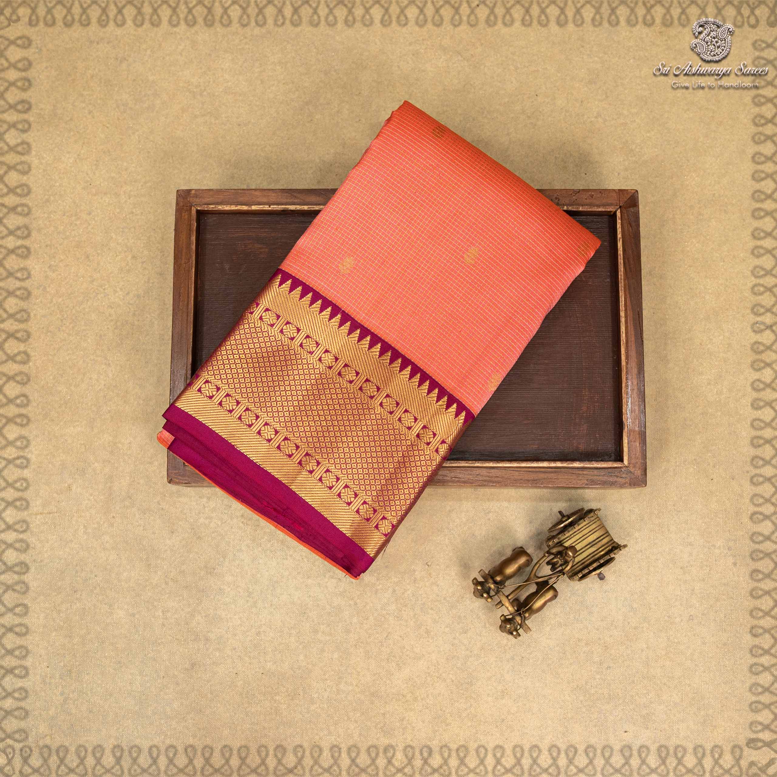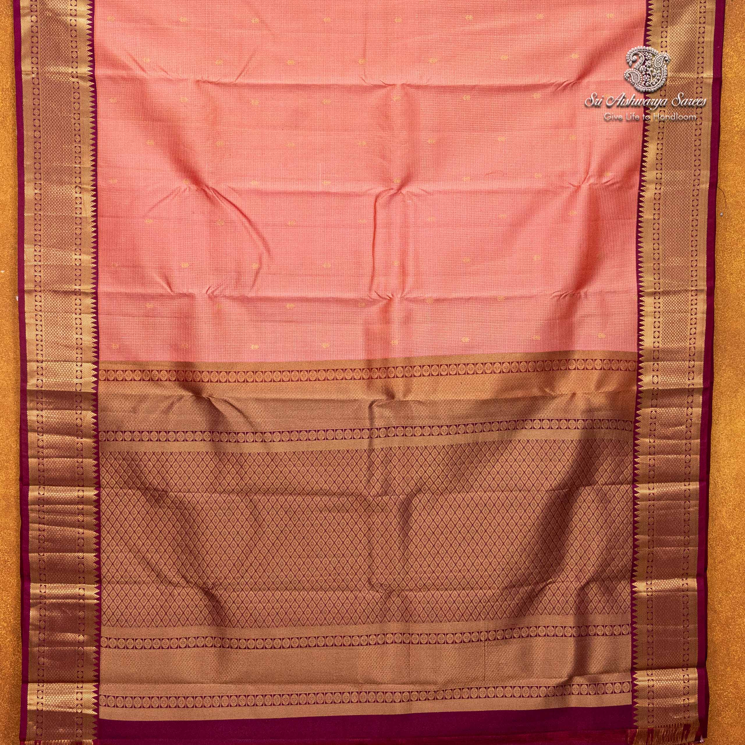 • A vibrant pure silk saree in rose pink, adorned with elegant zari kattam woven across the body. The deep magenta blouse adds a rich contrast, enhancing its regal and graceful appeal.