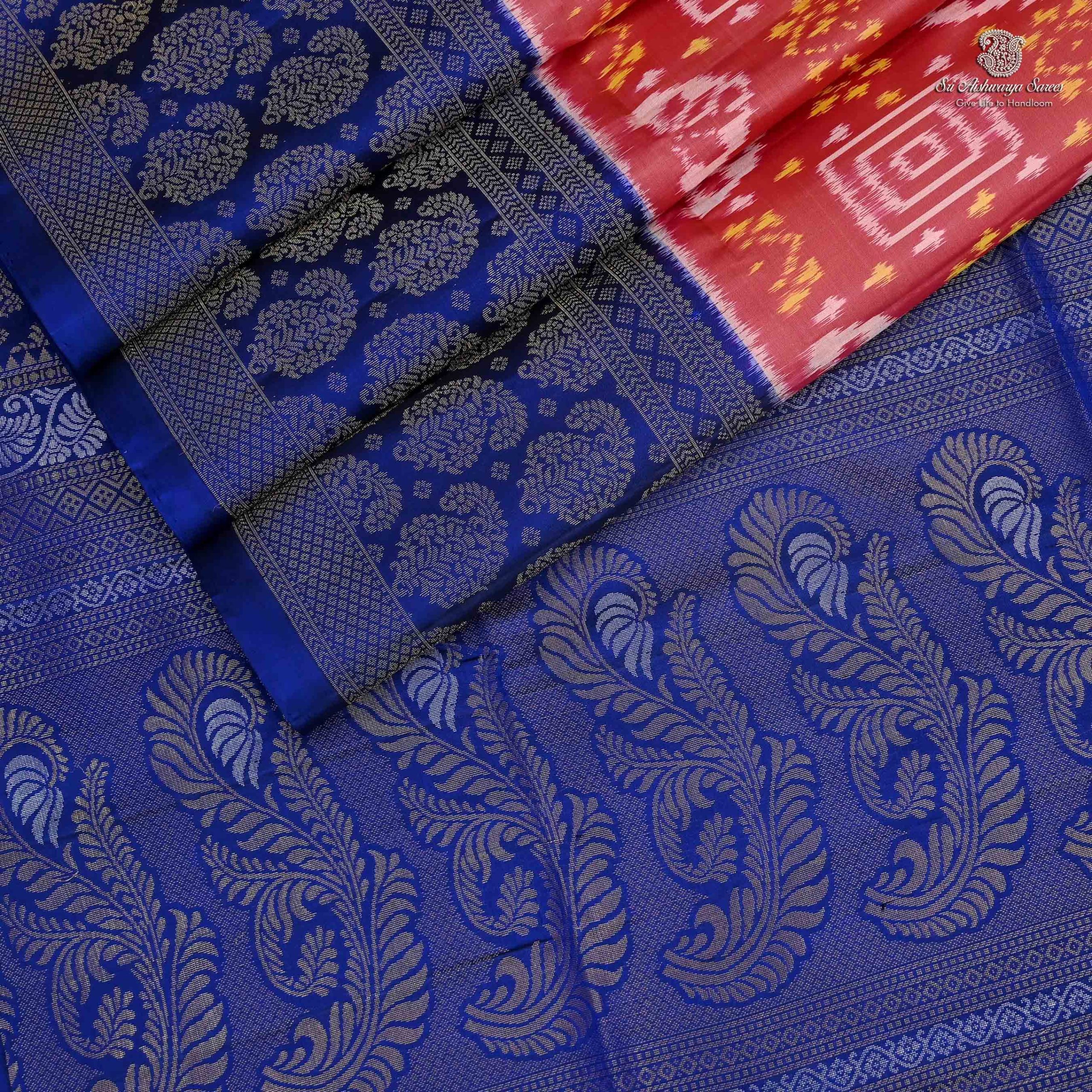 • Pure silk saree in rouge pink with elegant ikkat patterns on the body, paired with a rich dark blue pallu and blouse. The contrast adds a striking appeal to the traditional design. Ideal for those who enjoy making a bold statement at weddings and receptions.