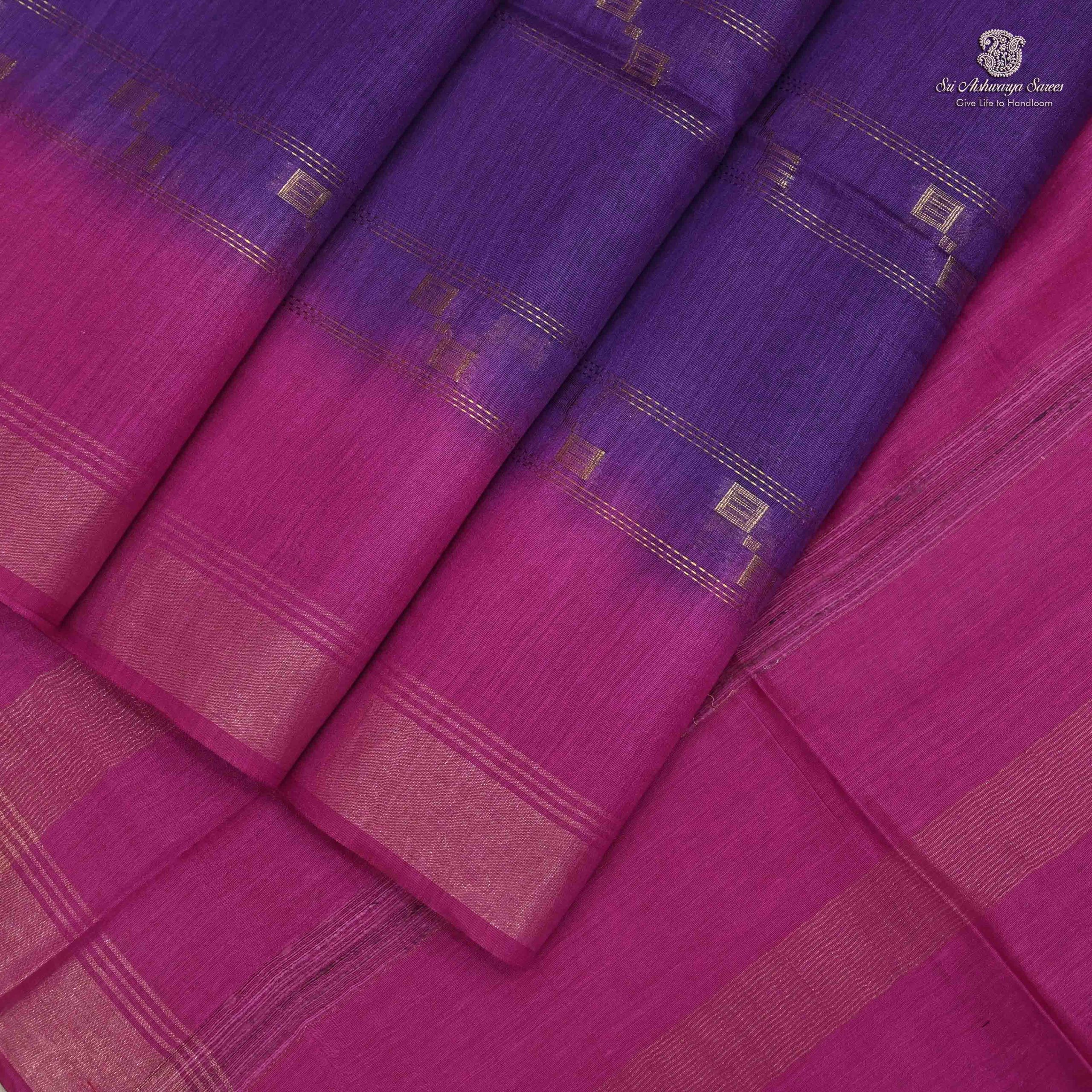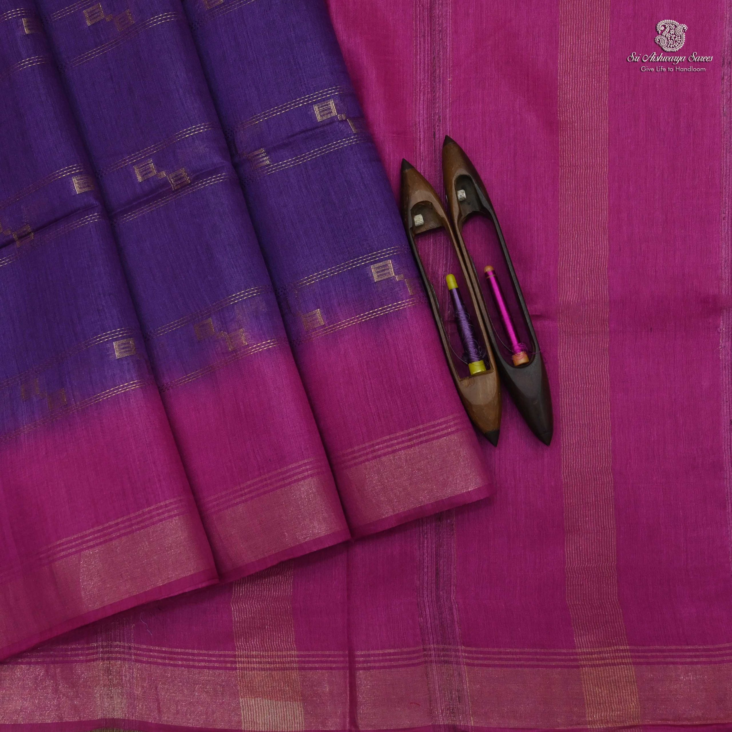 “Elegant Pure Tussar Silk Saree in rich purple body with dark pink pallu, adorned with graceful striped zari detailing for a timeless traditional look.”