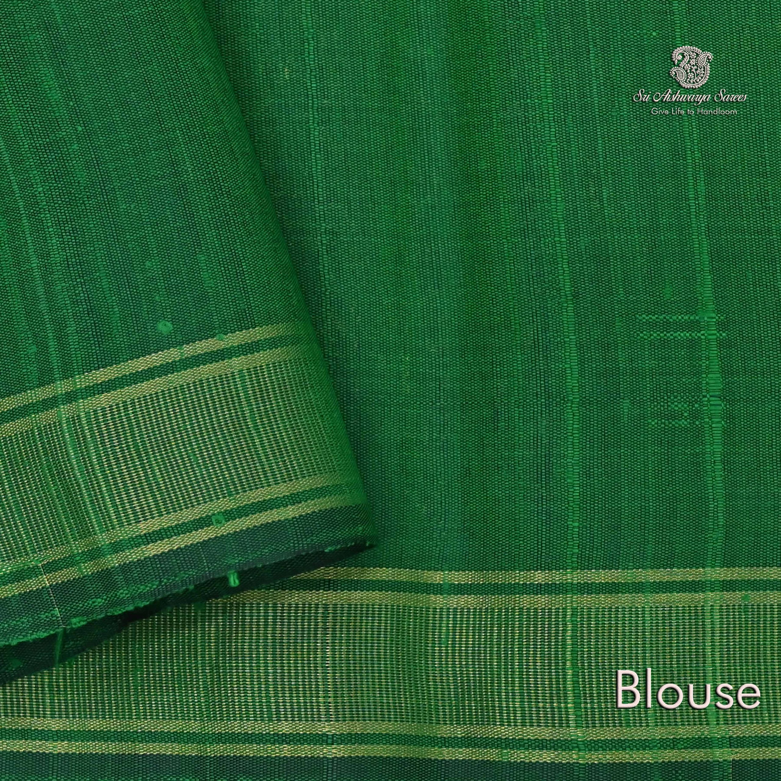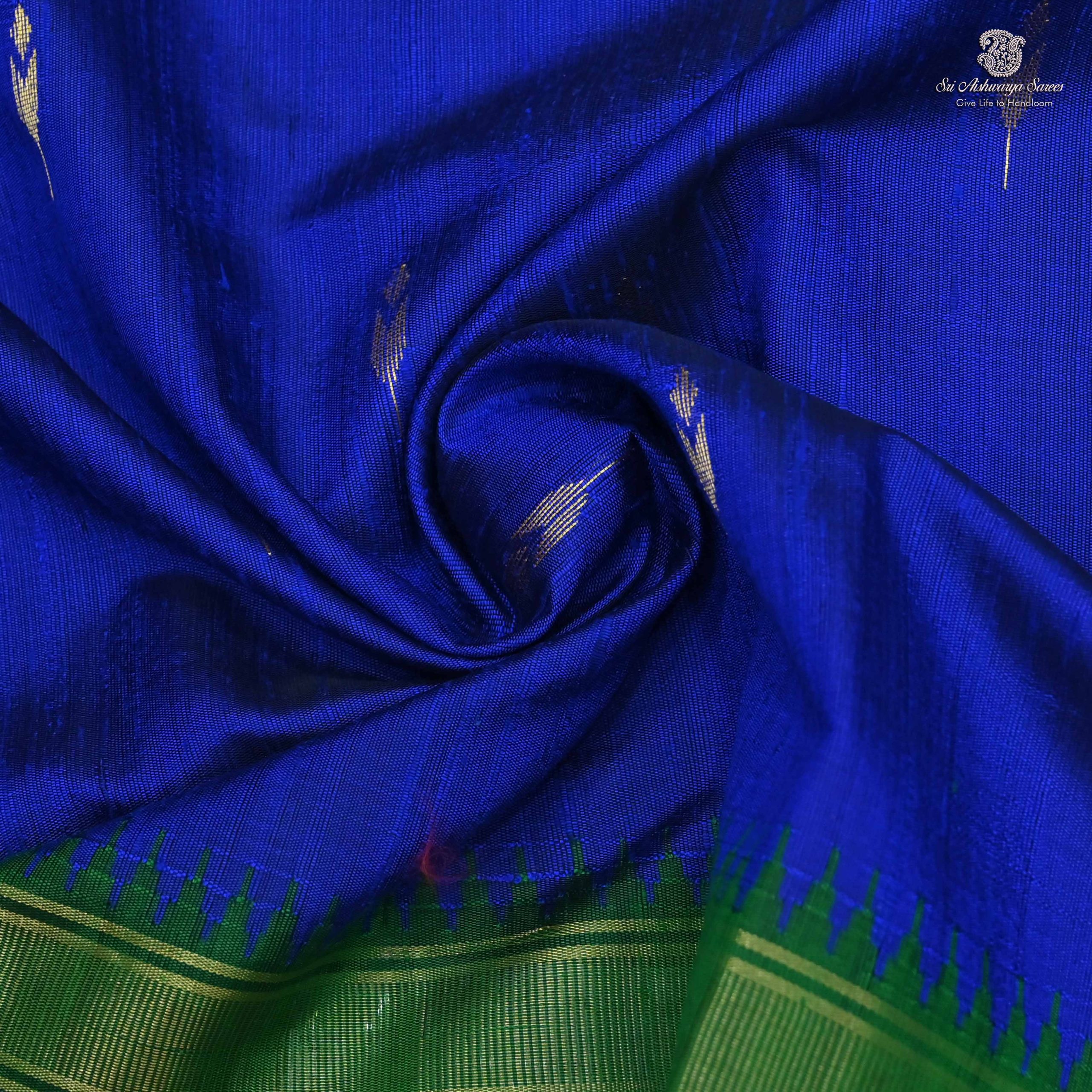 • Royal Blue pure raw silk saree features elegant butta designs, paired with a matching Green pallu and blouse. The traditional temple motif border enhances its timeless appeal. A perfect choice for those who admire classic elegance.