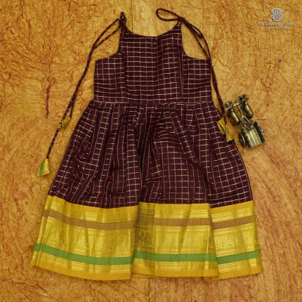 • Berry Blue readymade frock for 1 to 2-year girls, featuring a traditional temple motif zari border. Light and easy to wear. Ideal for small children at special family occasions.