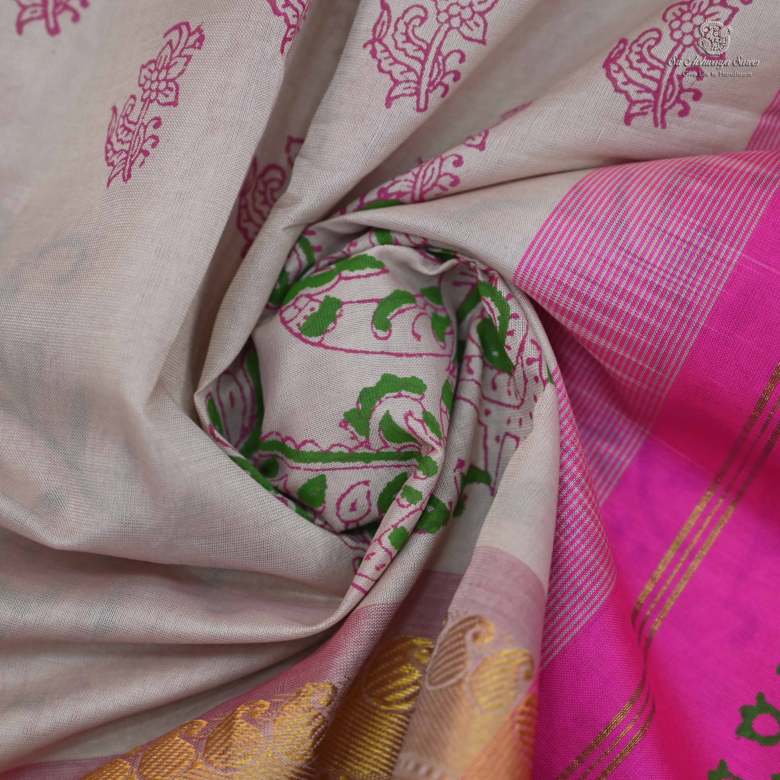 Elegant semi-silk saree featuring a Beige body and rich pallu, adorned with traditional hand block-printed peacock design.