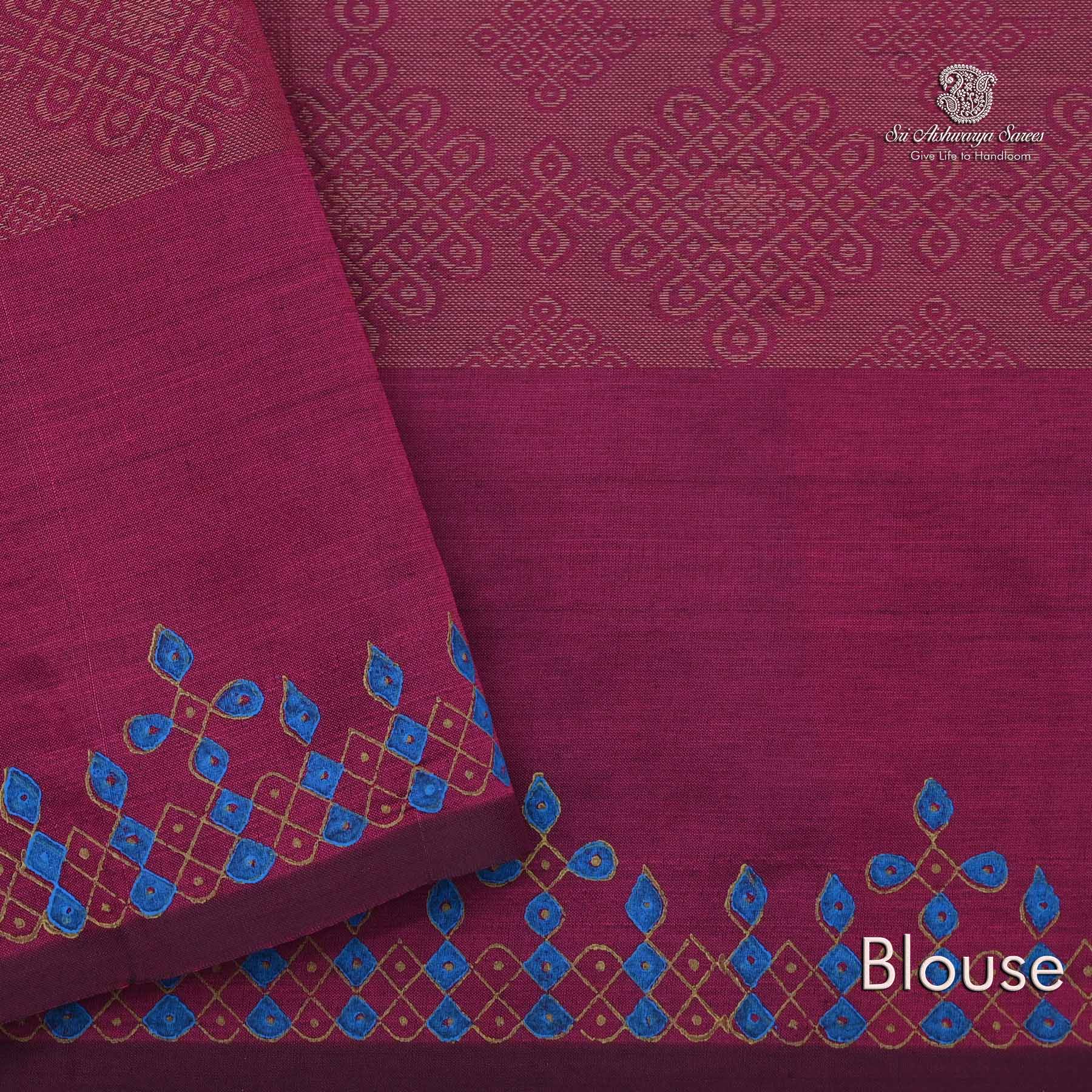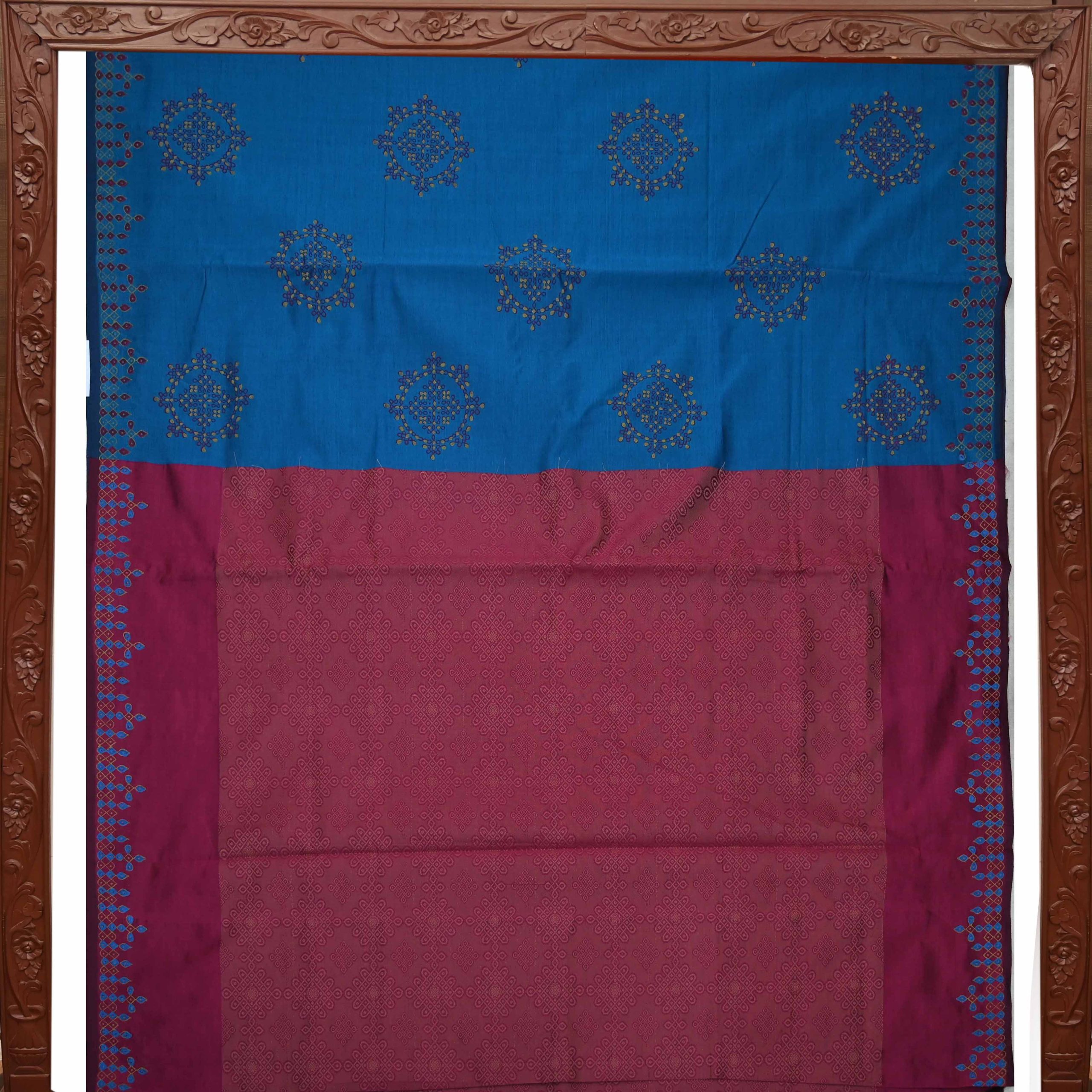 Elegant semi-silk saree featuring a Cerulean Blue body and rich pallu, adorned with traditional hand block-printed rangoli design.