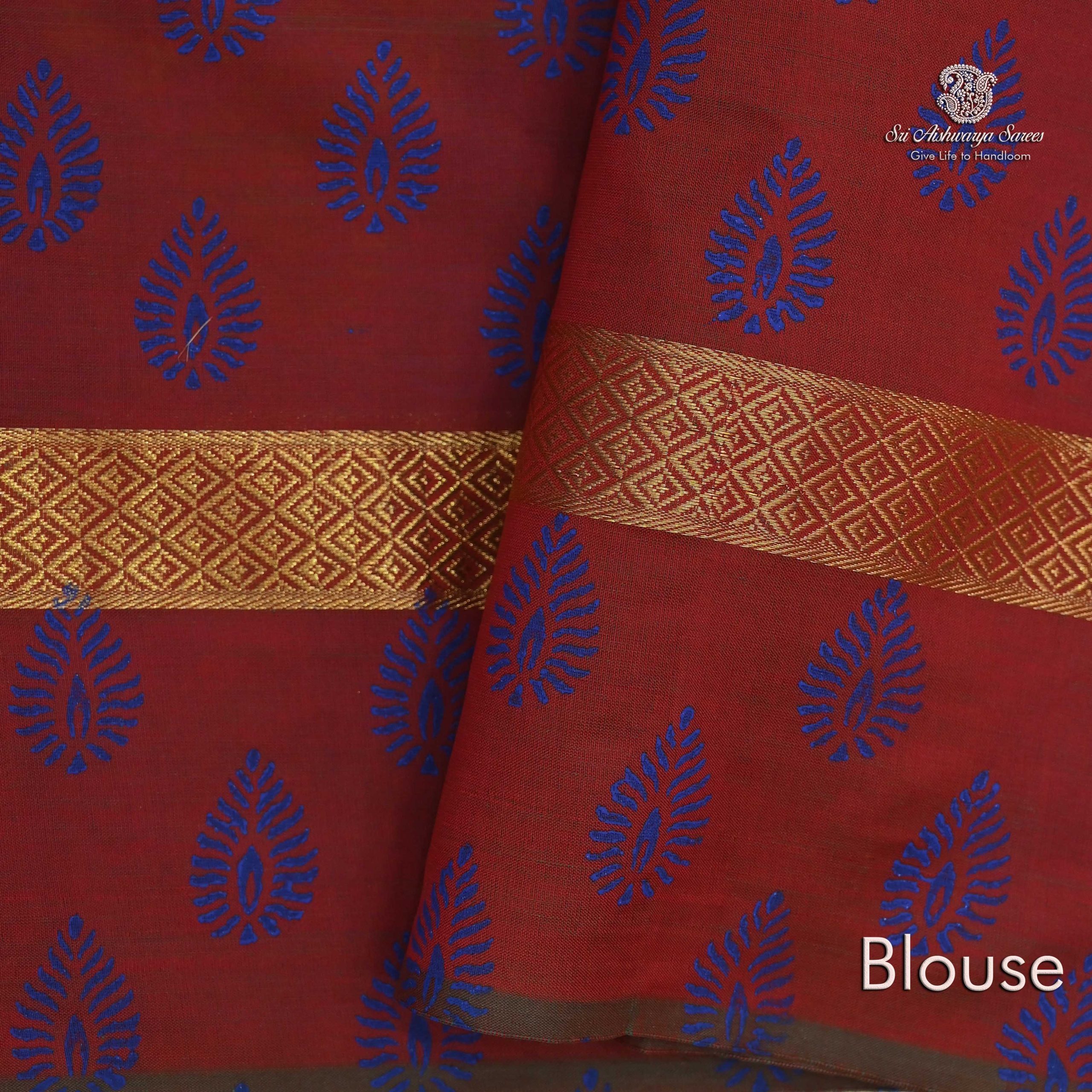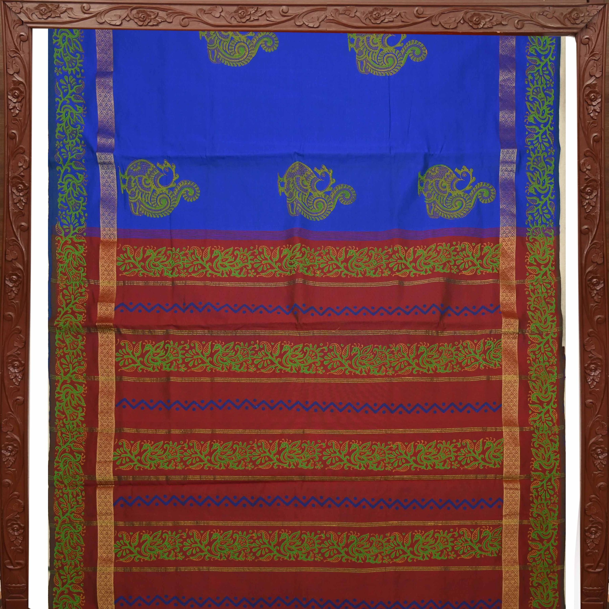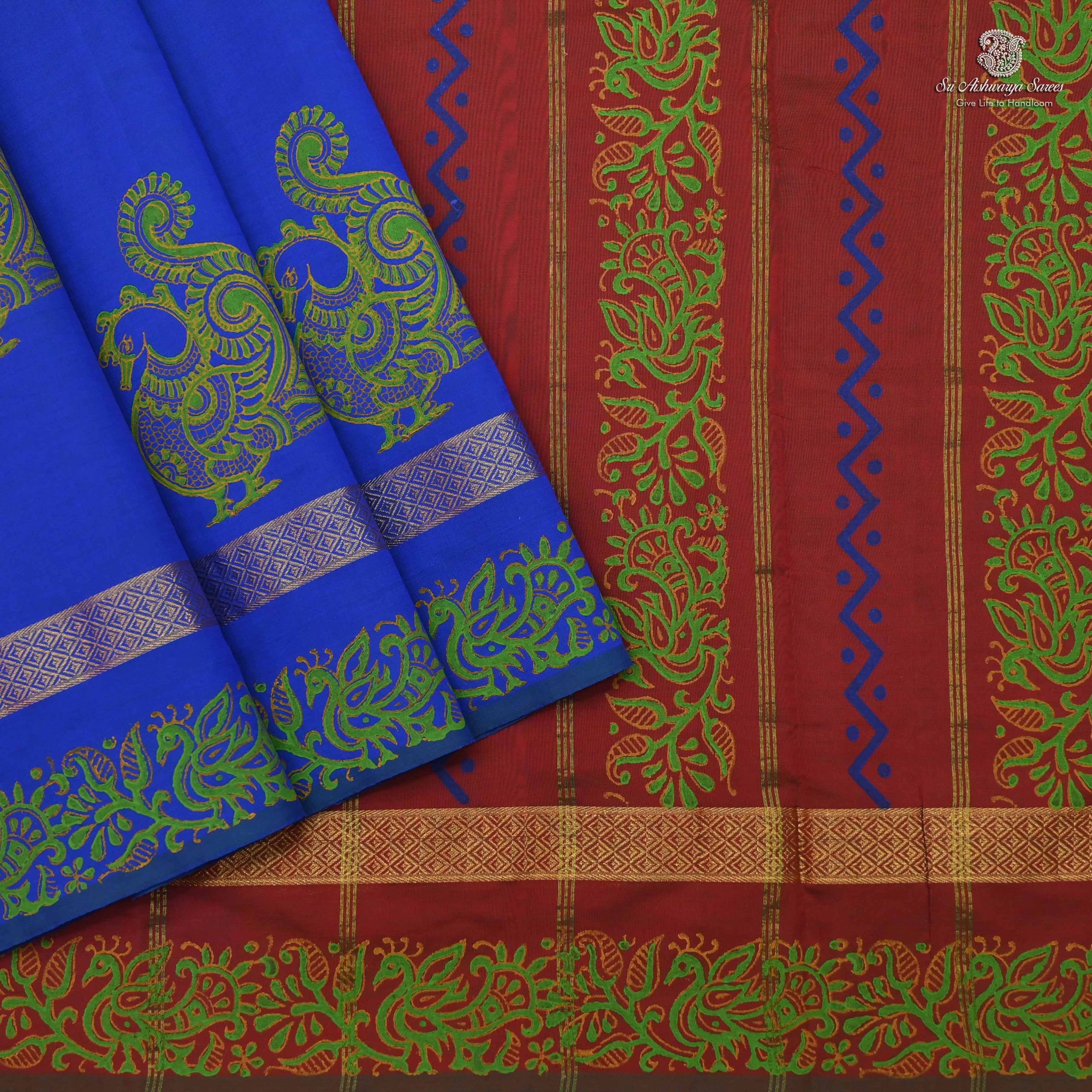 Elegant semi-silk saree featuring a Cobalt Blue body and rich printed pallu, adorned with traditional hand block-printed classical design.