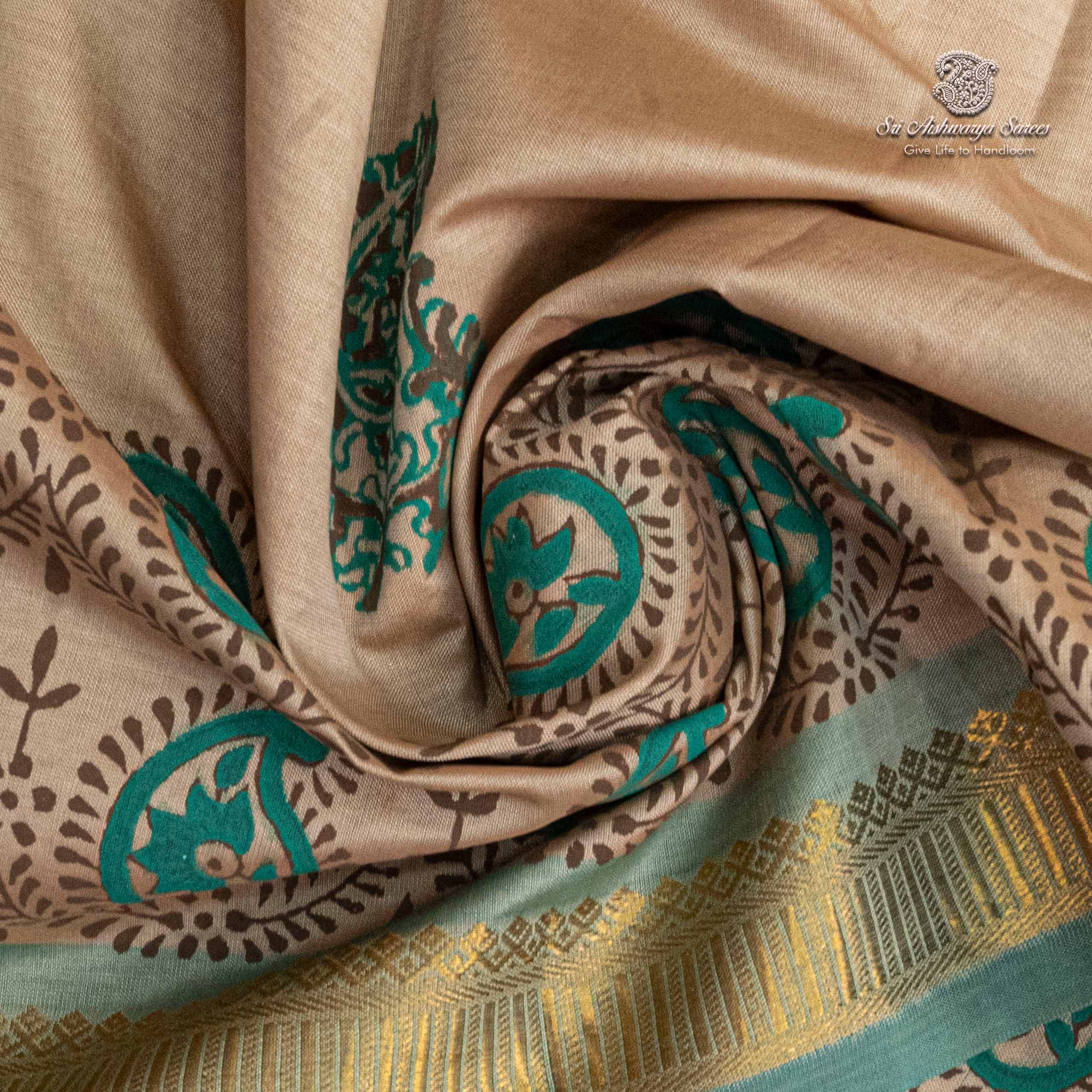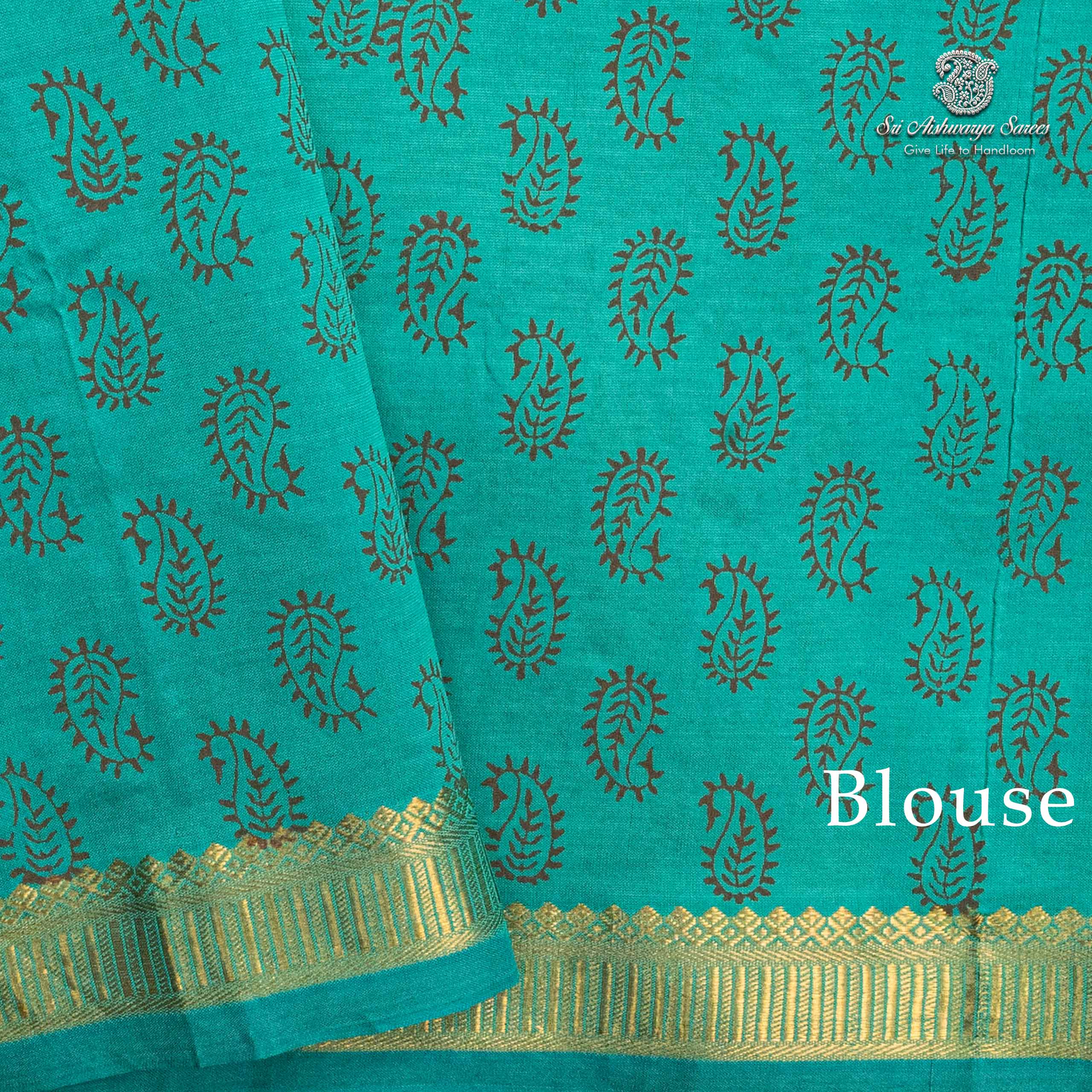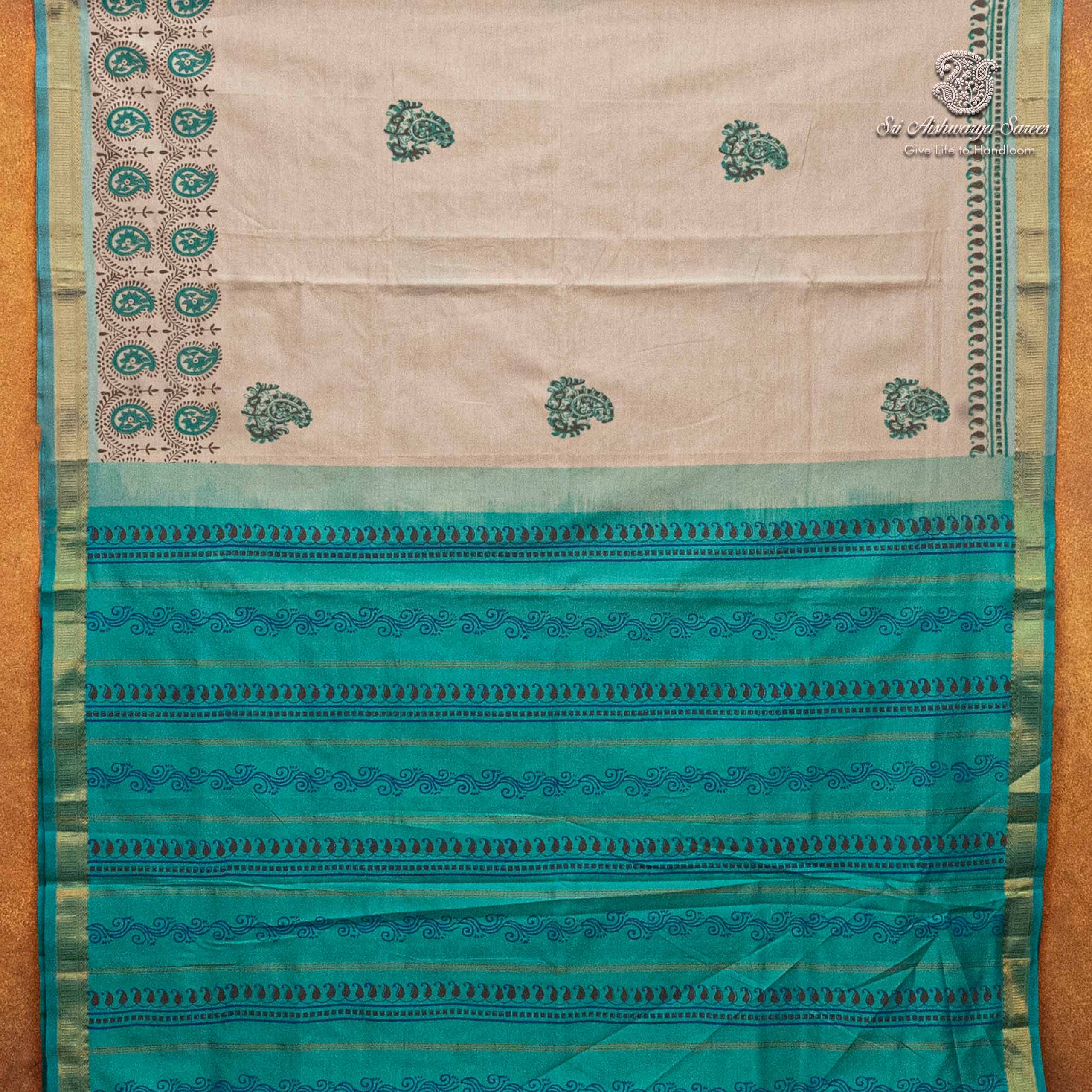Elegant semi-silk saree featuring a cream body and aqua green pallu, adorned with traditional hand block-print design.