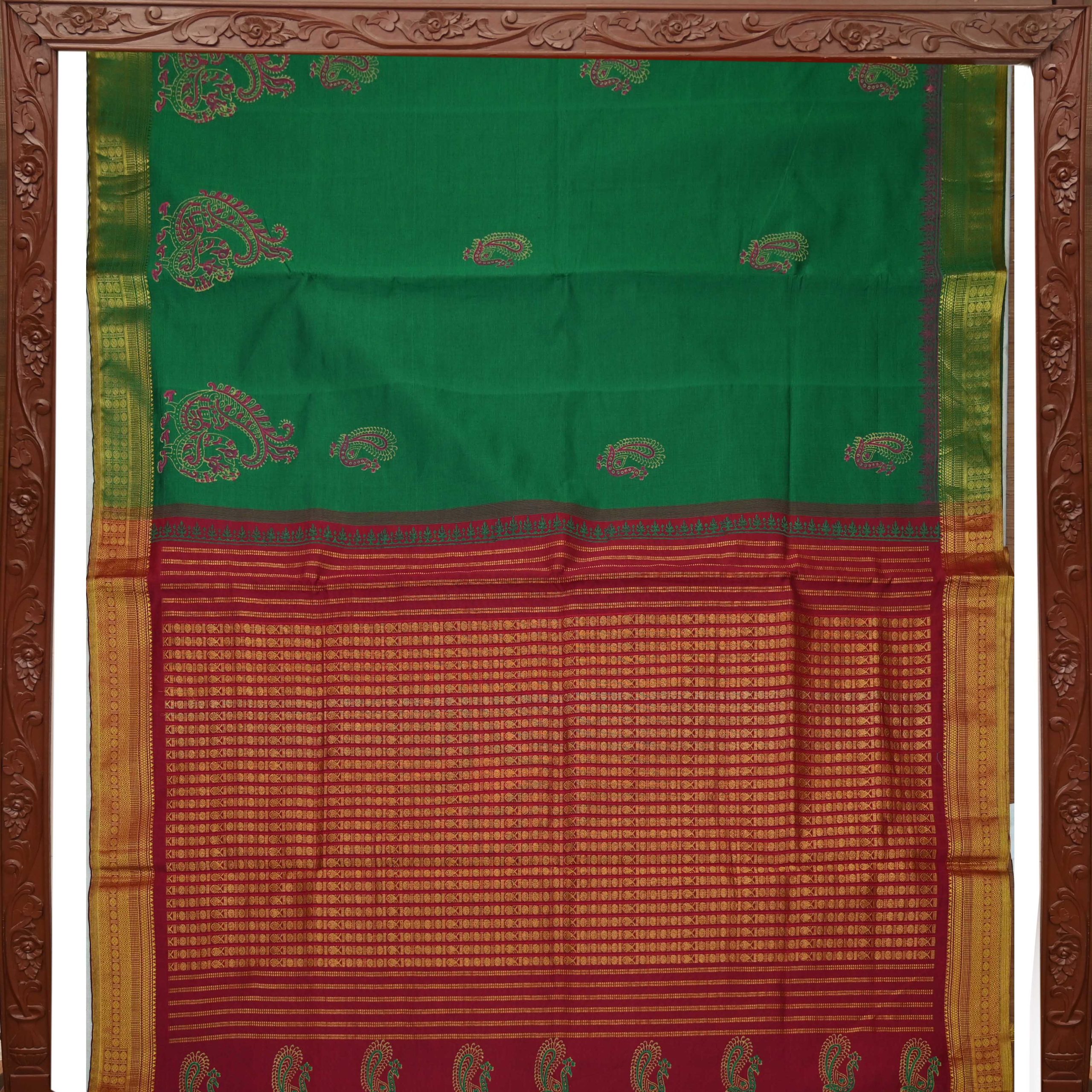 Elegant semi-silk saree featuring a Dark Green body and rich pallu, adorned with traditional hand block-printed rangoli design.