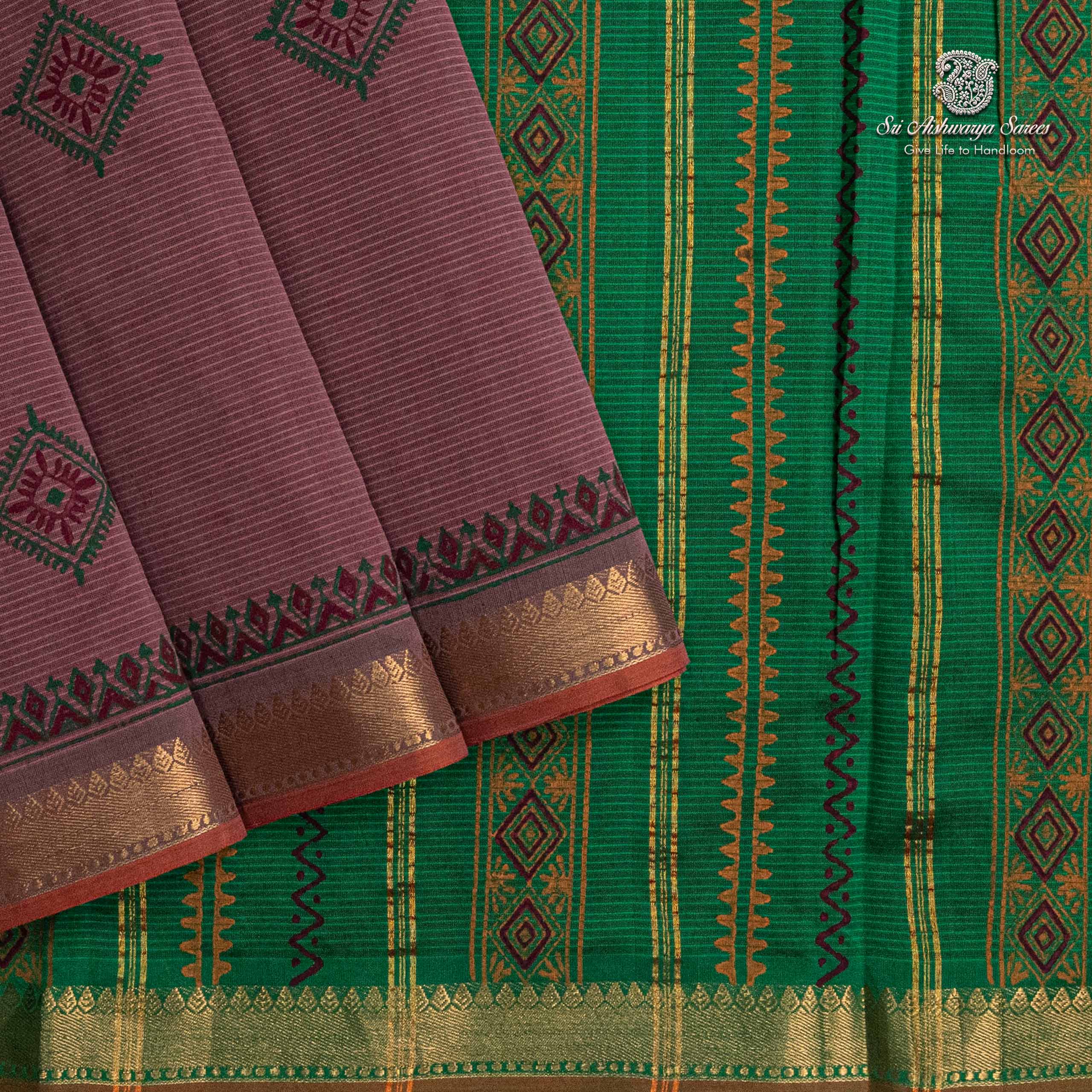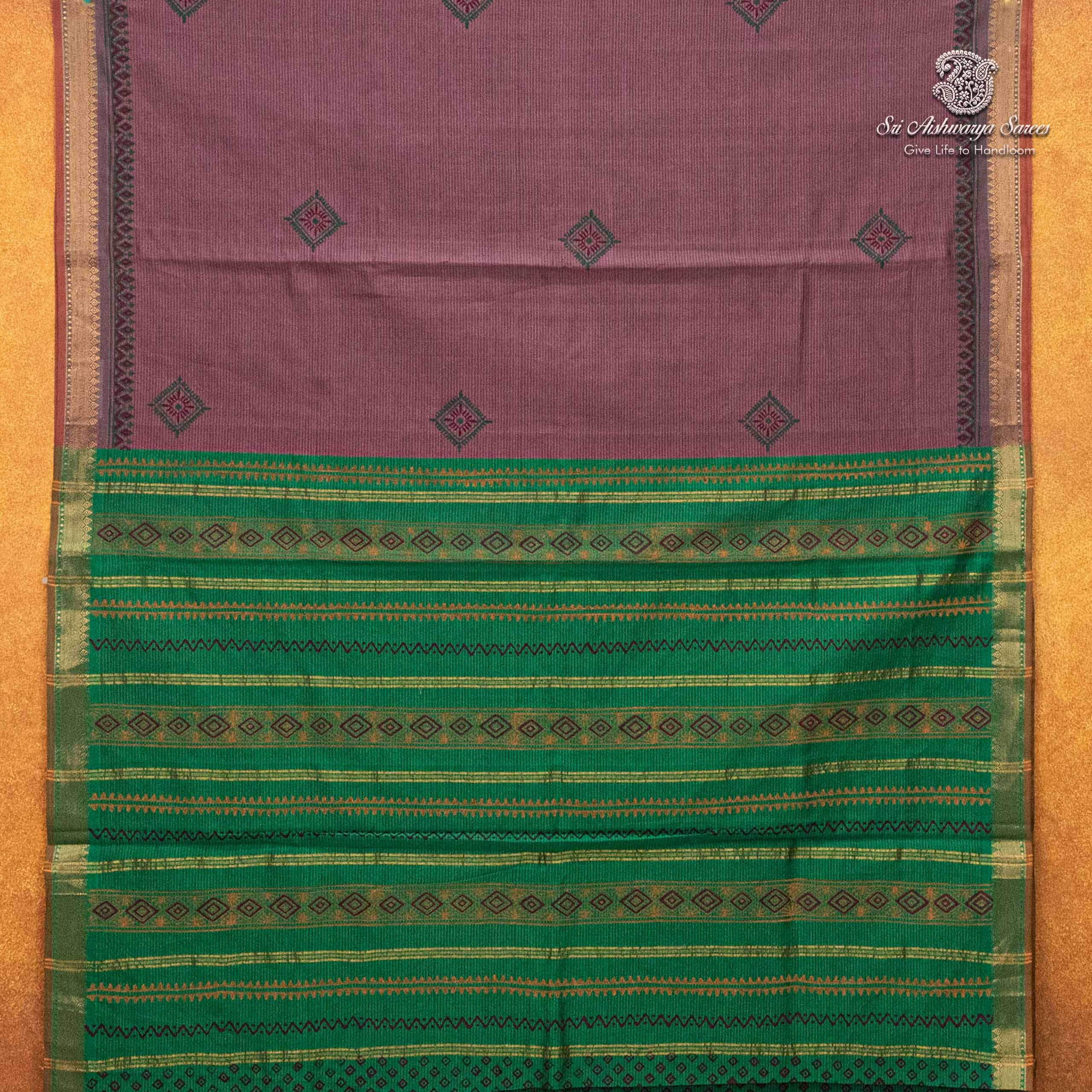Elegant semi-silk saree featuring a dusky mauve body and fun green pallu, adorned with traditional hand block-print design.