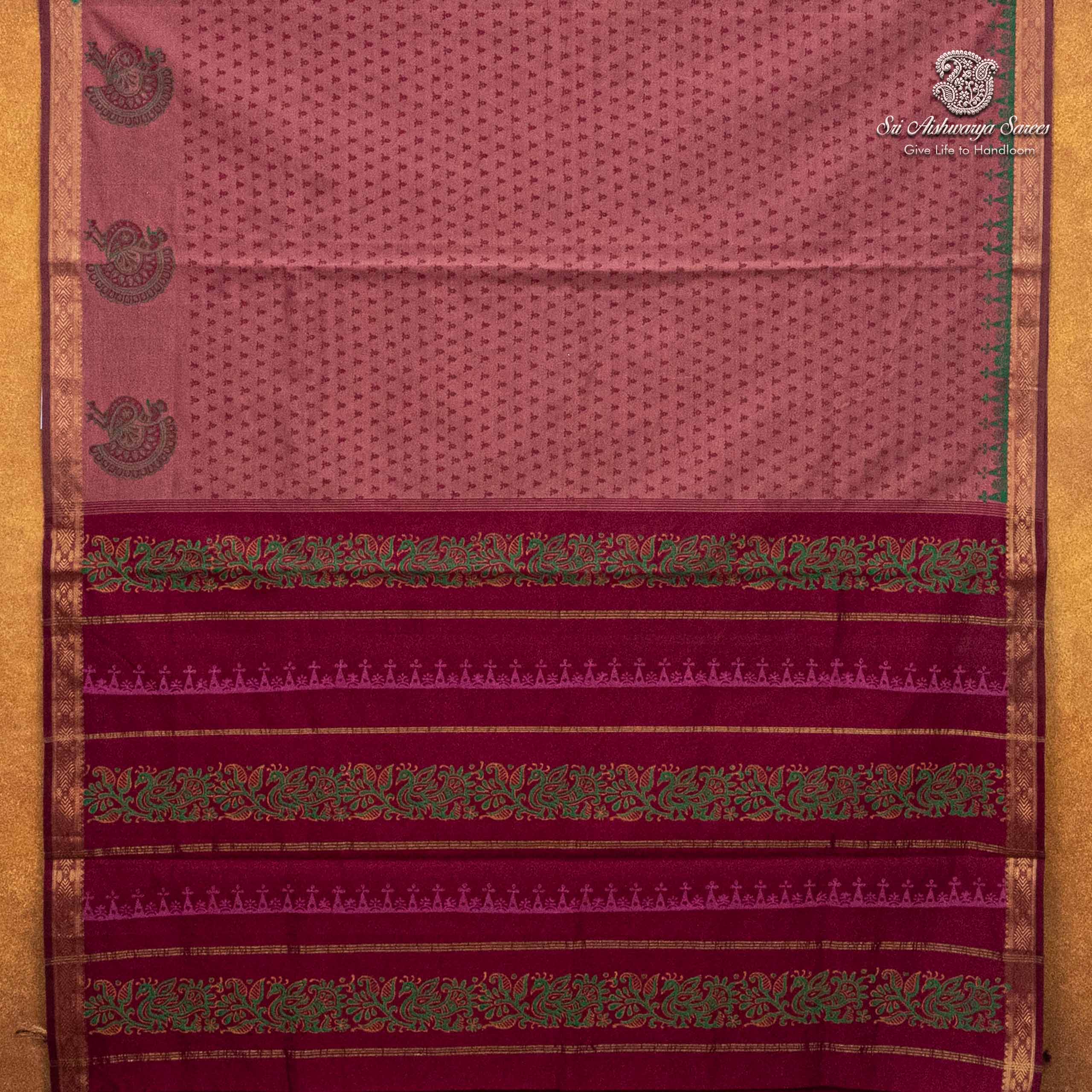 Elegant semi-silk saree featuring a faded red and marron pallu, adorned with traditional hand block-print design.