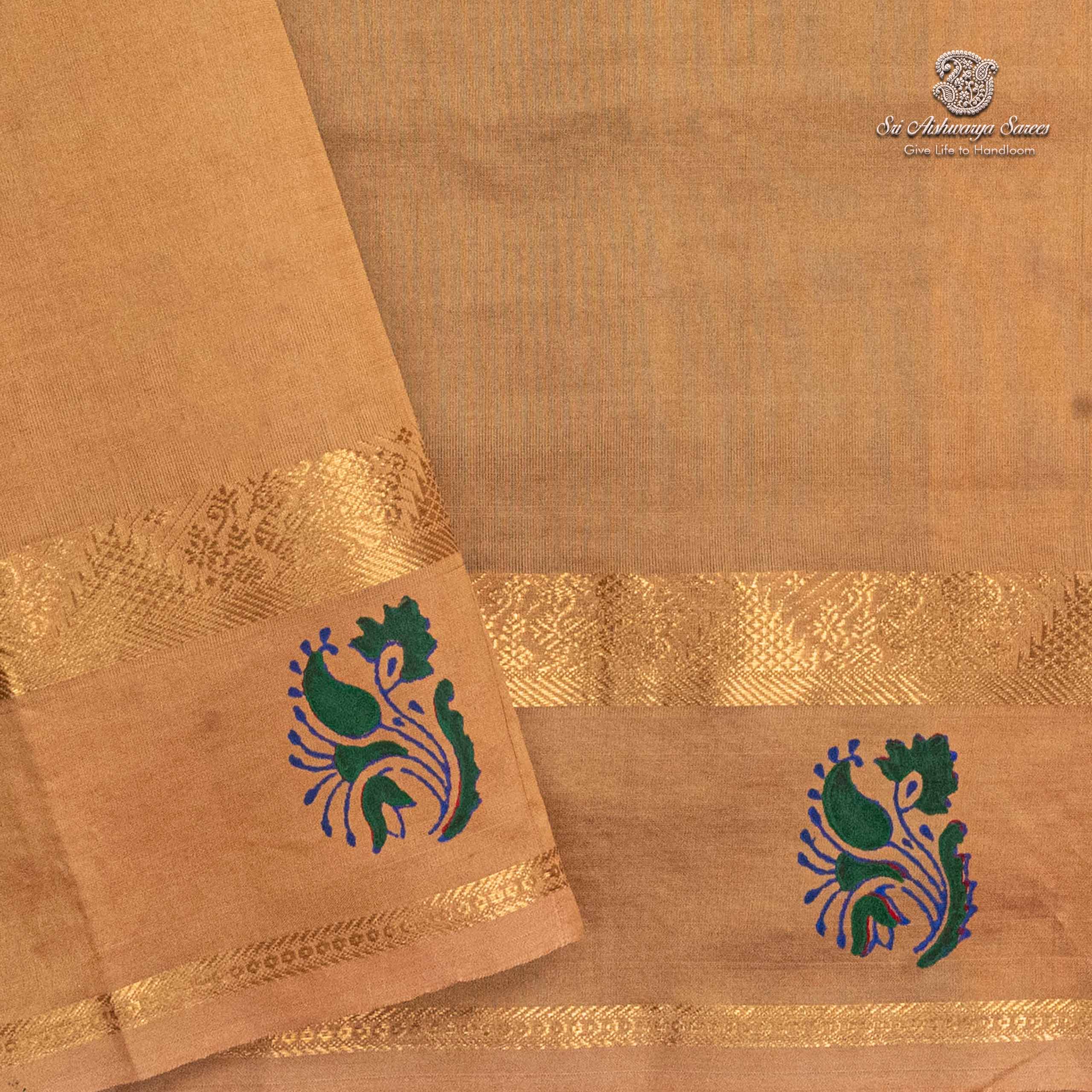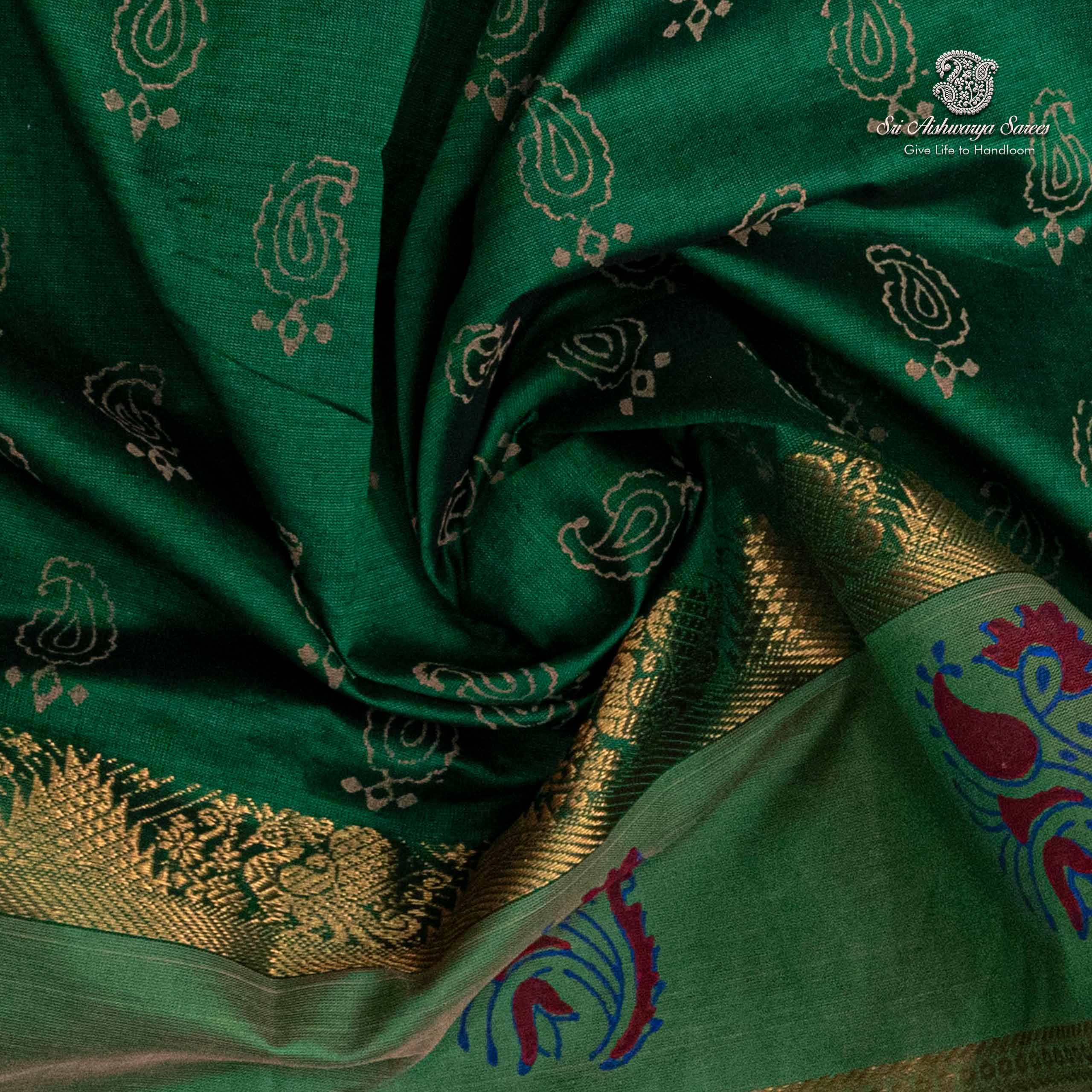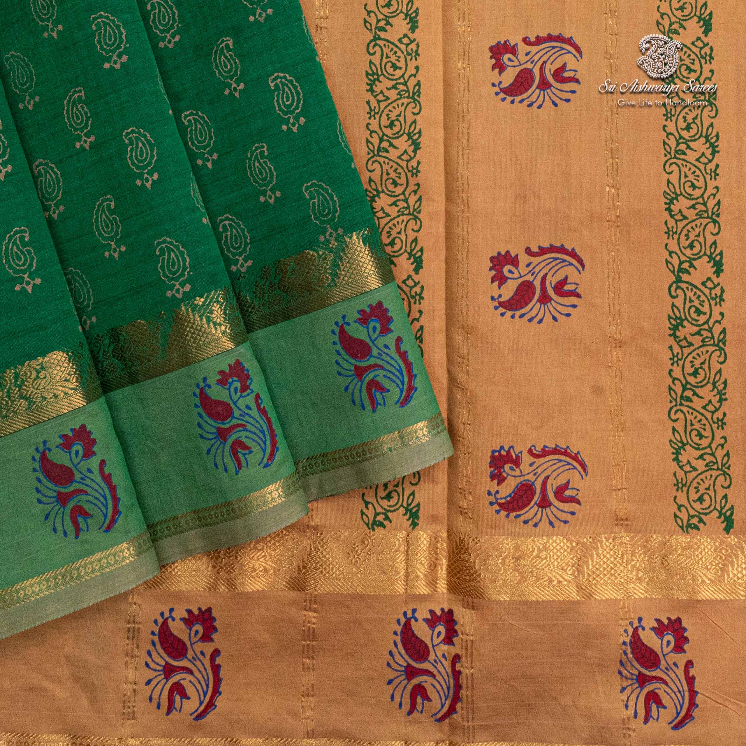 Elegant semi-silk saree featuring a fun green and tan pallu, adorned with traditional hand block-print design.