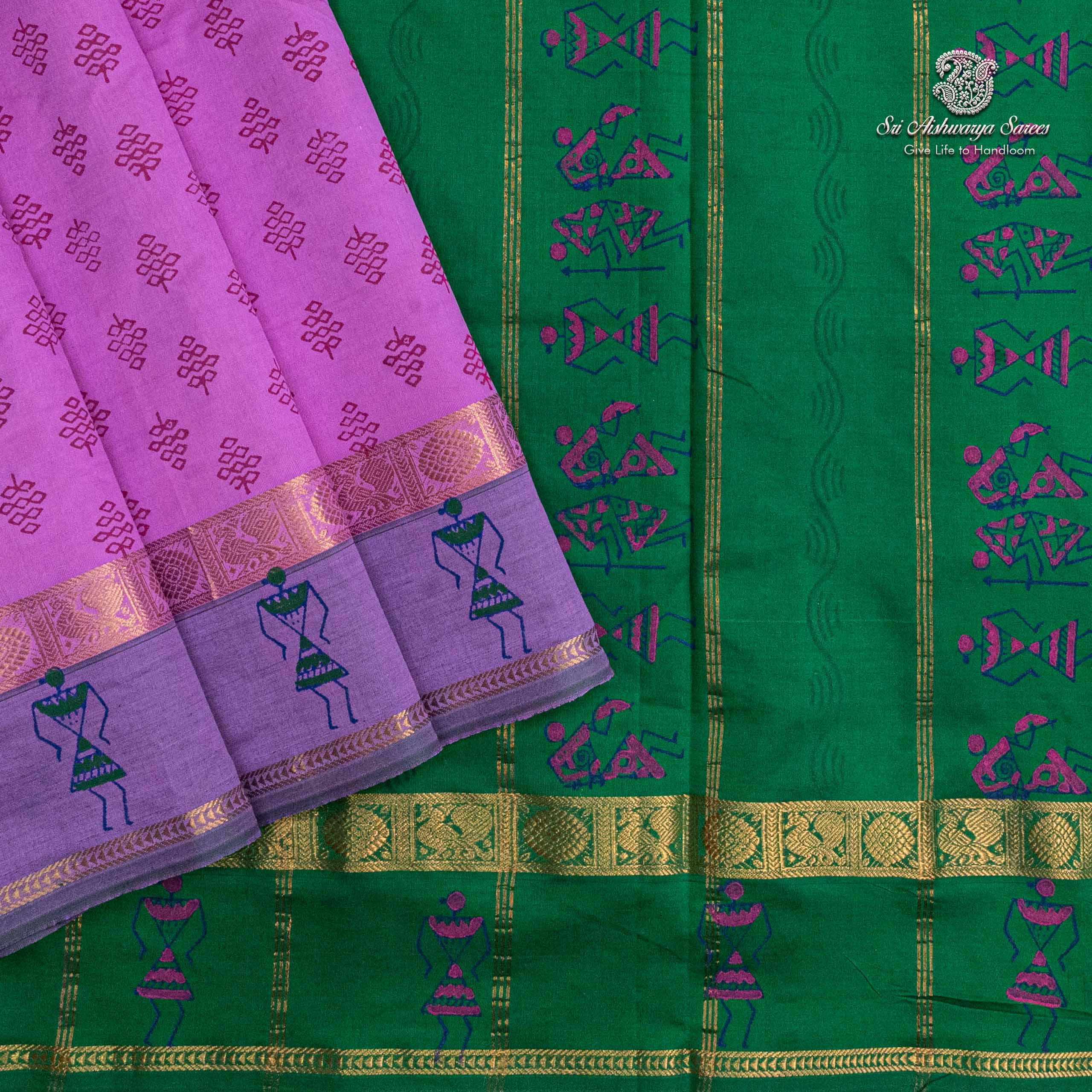 Elegant semi-silk saree featuring a heliotrope purple and fun green pallu, adorned with traditional hand block-print design.