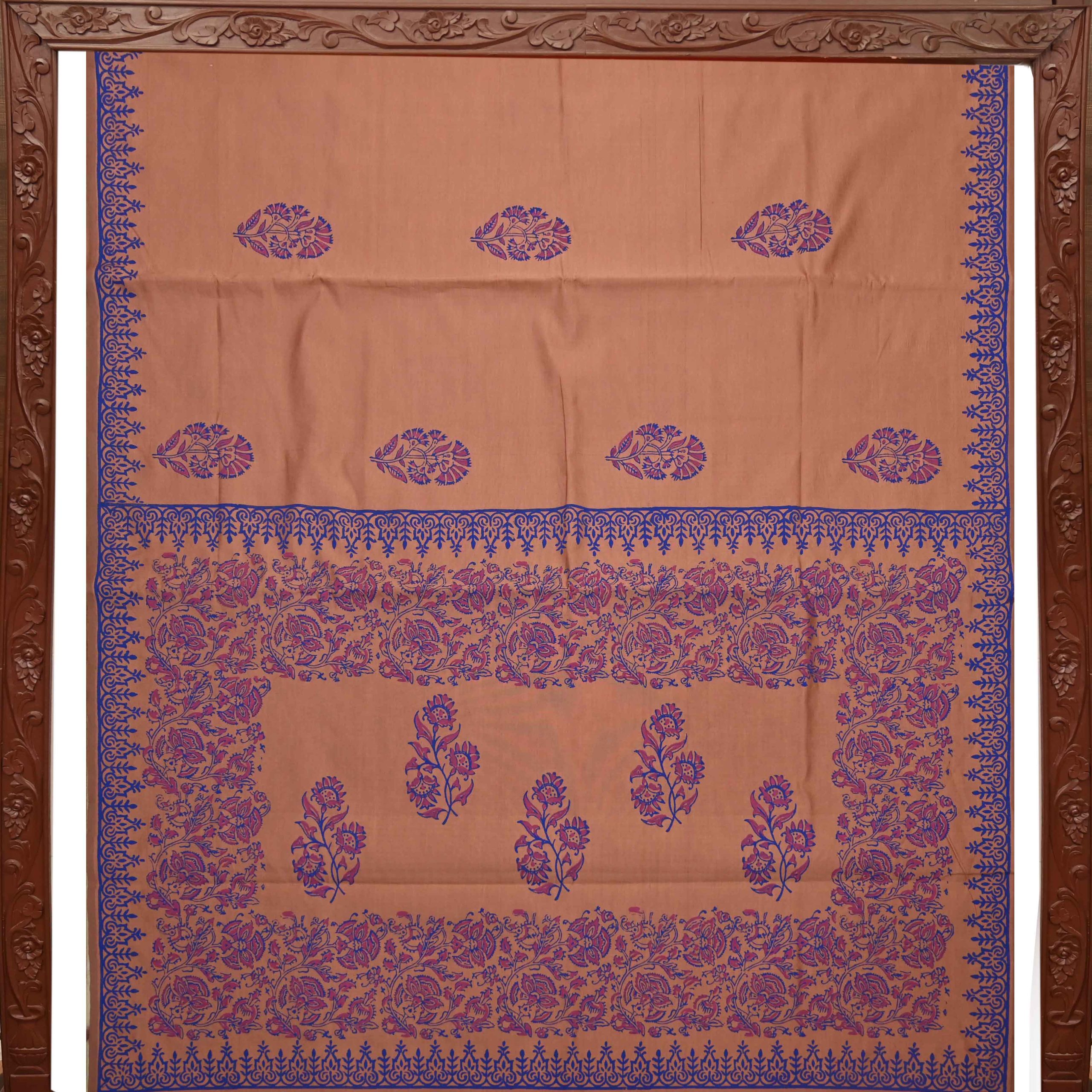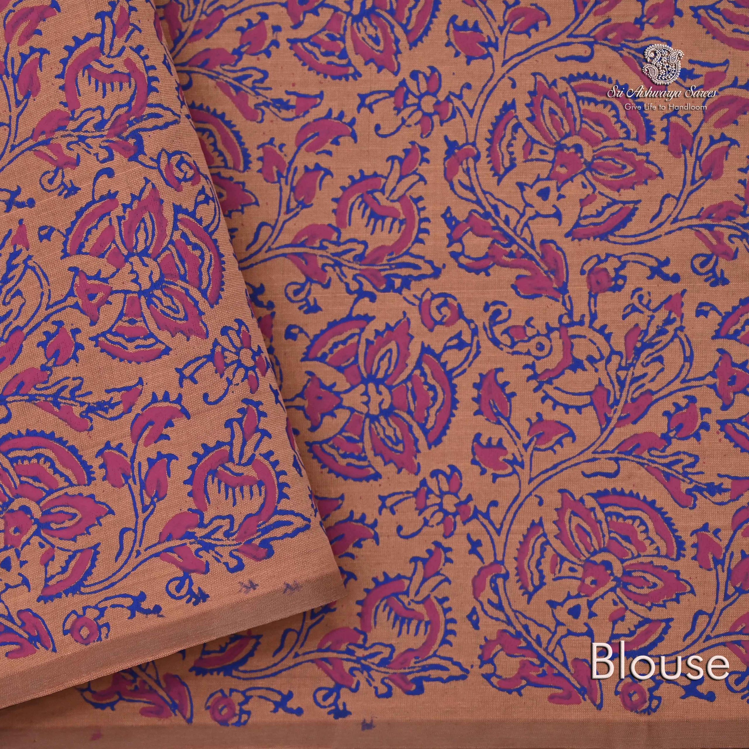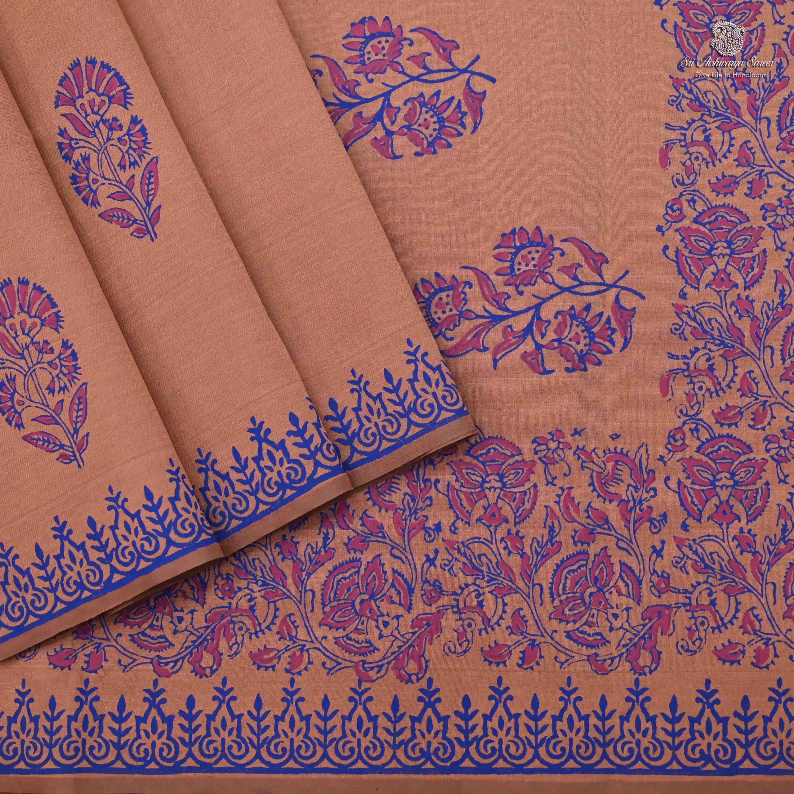 Elegant semi-silk saree featuring a Lght Salomon body and rich Self pallu, adorned with traditional hand block-printed rangoli design.